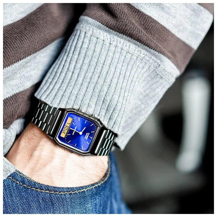 Мужские японские часы Casio Vintage AQ-230GG-2A представляют собой компактный и привлекательный аксессуар.12-ти и 24-х часовой формат времени. СекундомерСекундомерСекундоме́р — прибор, способный измерять интервалы времени с точностью до долей секунды. с точностью показаний 1/100с и временем измерения 1ч. Одновременное отображение времени двух часовых поясов. Браслет и корпус с IP-покрытиемIP-покрытиеМетод ионного напыления. Демонстрирует повышенную устойчивость к истиранию, окислению и химическим веществам. Под воздействием высокого давления и температуры около 1500°C молекулы металла надёжно соединяются с частицами корпуса часов.. Батарея рассчитана на 3 года. Водонепроницаемость в соответствии с DIN 8310/ISO 2281.