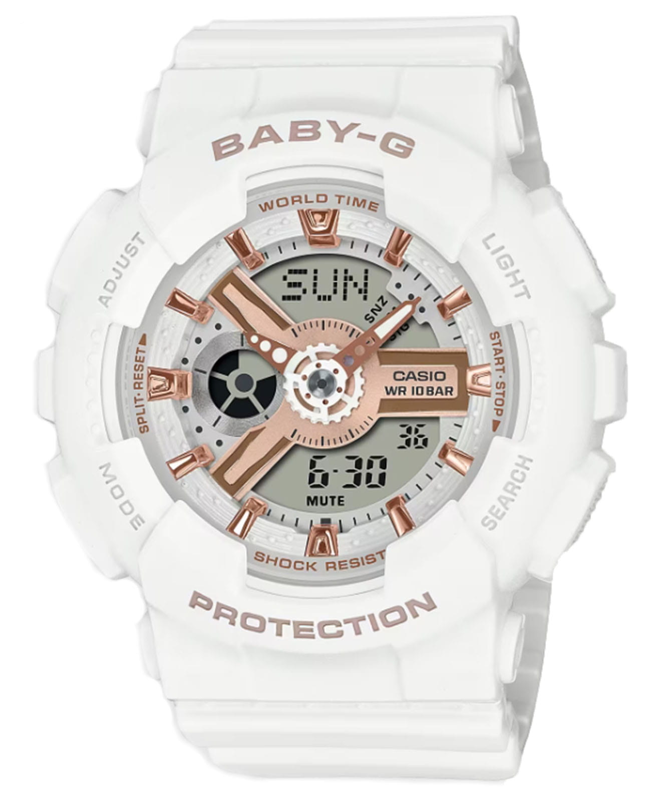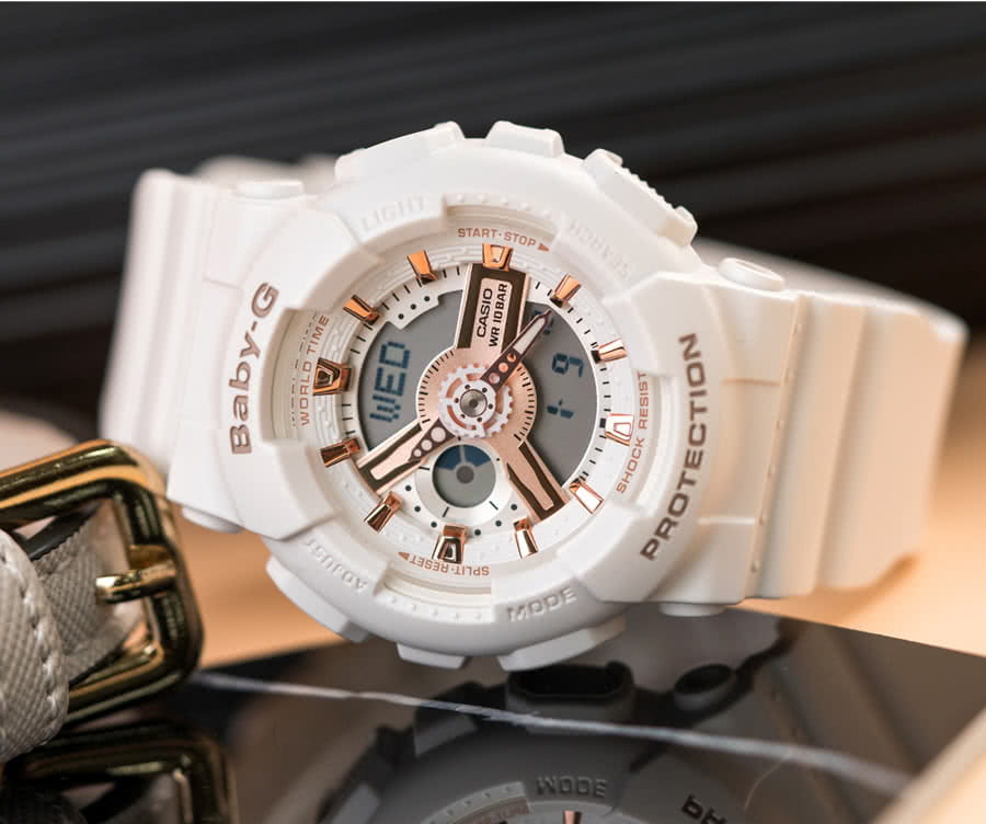 Японские женские многофункциональные часы BA-110XRG-7A из коллекции Baby-G. Функции: автоматическая светодиодная подсветка, ударопрочный корпусУдаропрочный корпусМеханизм заключён в корпус, выполненный из современных материалов, устойчивых к ударам, механическим повреждениям и падению с высоты: инновационный пластик, карбон, нержавеющая сталь, титан., функция мирового времениМировое время Полезное часовое усложнение, отображающее время в основных городах и известных областях по всему миру, оно связано с часовыми поясами, удобно для путешественников и бизнесменов. , – 48 городов (29 часовых поясов), всемирное координированное время (UTCUTCВсемирное кординационное время, не имеющее привязки к географическому положению Гринвича, основывается на атомном отсчёте времени. Регулировка времени осуществляется более точно, чем устаревшее GMT.
