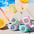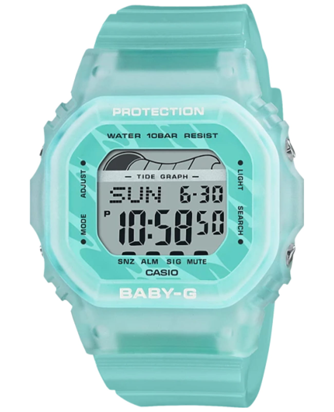 Женские противоударные японские часы с лунным календарем Casio Baby-G BLX-565S-2, кварцевый механизм с высокой точностью. Класс водозащиты: 100 метров, позволит плавать, нырять и заниматься другими водными видами спорта. Корпус часов изготовлен из пластика бирюзовацвета. Ударопрочный корпусУдаропрочный корпусМеханизм заключён в корпус, выполненный из современных материалов, устойчивых к ударам, механическим повреждениям и падению с высоты: инновационный пластик, карбон, нержавеющая сталь, титан. защищает механизм от ударов и вибрации. Светодиодная подсветкаСветодиодная подсветкаСветодиодная или LED-подсветка обеспечивает появление яркого холодного свечения за счёт LED-элементов - маленьких лампочек. Они потребляют минимальное количество энергии, чаще всего можно встретить 1 светодиод, в нижней части циферблата. освещает весь циферблат, после отпускания кнопки свечение продолжается еще некоторое время. Особенность модели в функциях будильникаБудильникБуди́льник — часы, в заданный момент времени подающие звуковой, световой и/или в редких случаях другой сигнал., секундомераСекундомерСекундоме́р — прибор, способный измерять интервалы времени с точностью до долей секунды., таймера и мирового времениМировое время Полезное часовое усложнение, отображающее время в основных городах и известных областях по всему миру, оно связано с часовыми поясами, удобно для путешественников и бизнесменов. .