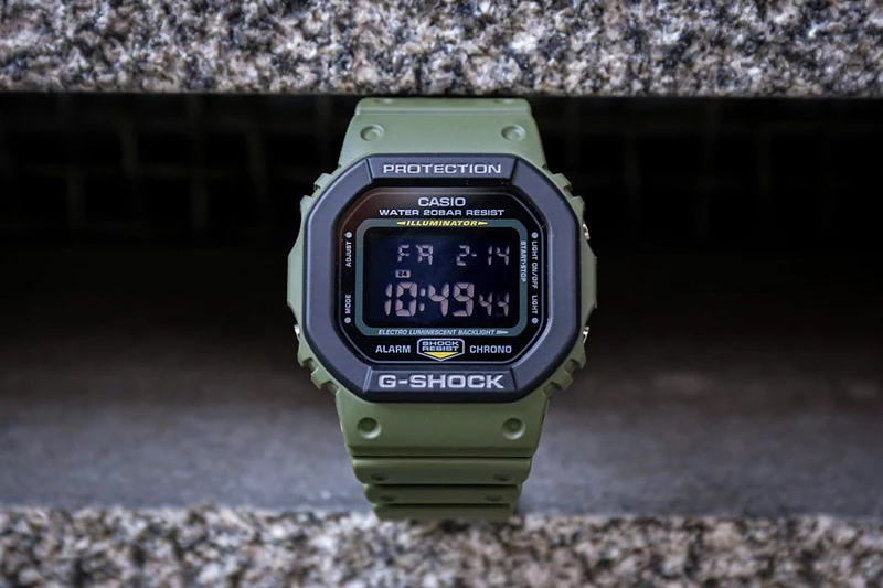 Брендовый G-Shock нацелен на ценителей квадратного корпуса, прототипом для которого стали первые модели Casio. Спортивный дизайн выражает брутальный характер. Наручные часы в матовом зелёном исполнении отображают время в цифровом формате, инверсионный дисплей имеет тёмное обрамление. Противоударный корпусУдаропрочный корпусМеханизм заключён в корпус, выполненный из современных материалов, устойчивых к ударам, механическим повреждениям и падению с высоты: инновационный пластик, карбон, нержавеющая сталь, титан. надёжно защищает японский кварцевый механизм от повреждений, последствий падения. Питание идёт от батарейки, рассчитанной на 2 года службы. Закаленное минеральное стеклоМинеральное стеклоМинеральное стекло представляет собой искусственно выращенный минерал кварца. Такое стекло отличается особой устойчивостью к повреждениям и царапинам. Уступает по некоторым качествам сапфировому стеклу.. Комфортный полимерный ремешок. Электролюминесцентная подсветкаЭлектролюминесцентная подсветкаЭлектролюминесцентная панель устанавливается под ЖК-экраном часов, при нажатии кнопки электричество преобразуется в свет за счёт подачи напряжения на атомы фосфора, такой тип подсветки позволяет освещать весь циферблат. освещает весь циферблат, после отпускания кнопки свечение продолжается еще некоторое время. Класс водозащиты: 200 метров, позволит плавать, нырять и заниматься другими водными видами спорта. СекундомерСекундомерСекундоме́р — прибор, способный измерять интервалы времени с точностью до долей секунды. с точностью показаний 1с и временем измерения 24ч. ТаймерТаймерОтсчитывает секунды в обратном направлении в заданном интервале времени. обратного отсчета от 1сек до 1ч. Мировое времяМировое время Полезное часовое усложнение, отображающее время в основных городах и известных областях по всему миру, оно связано с часовыми поясами, удобно для путешественников и бизнесменов. , многофункциональный будильникБудильникБуди́льник — часы, в заданный момент времени подающие звуковой, световой и/или в редких случаях другой сигнал.. Габариты: 48,9 x 43,8 x 13,5 мм.