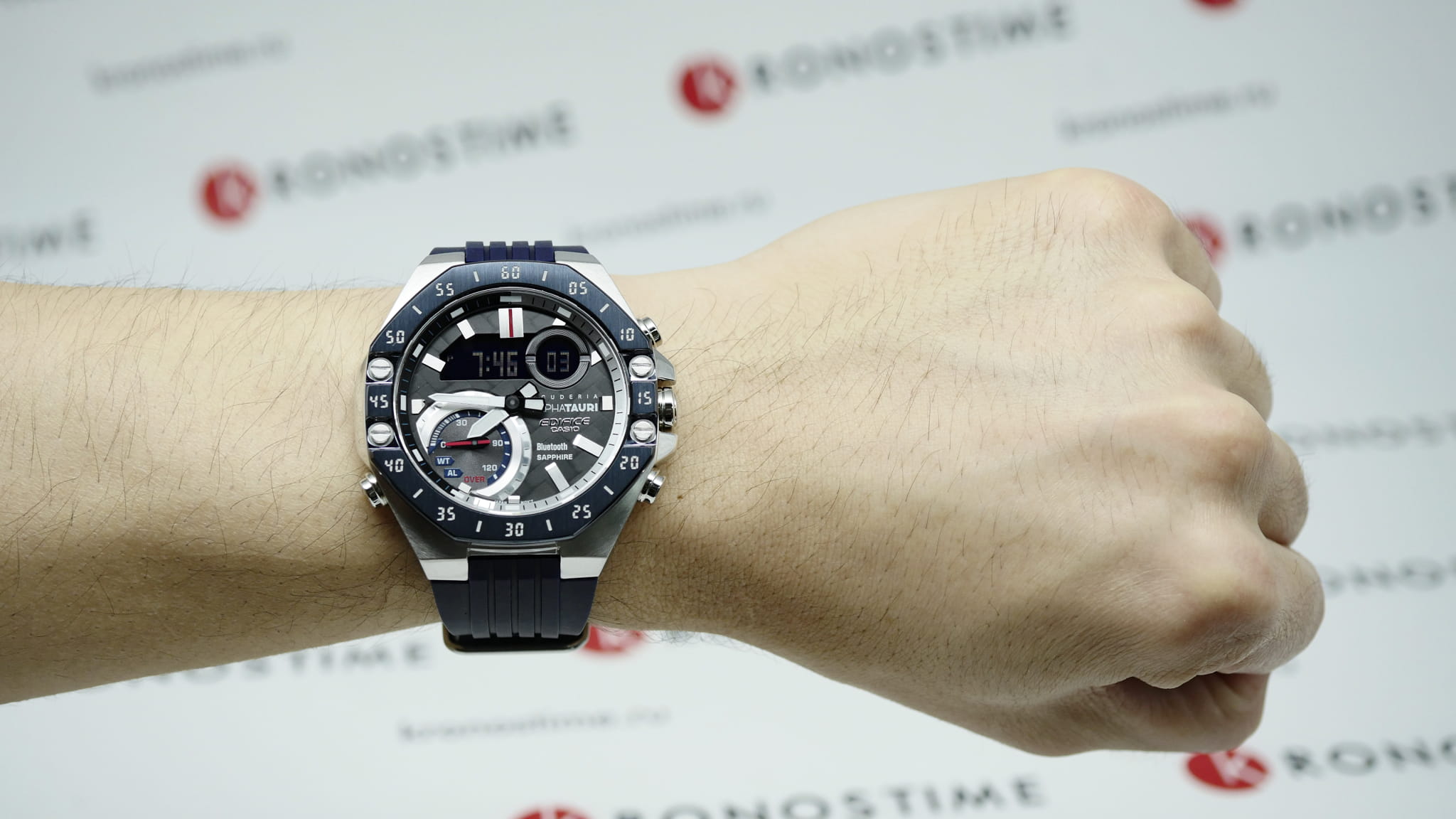Casio Edifice ECB-10AT-1A – лимитированная модель, созданная в сотрудничестве с командой Формулы-1 Scuderia AlphaTauri. Корпус размером 48,5 мм и толщиной 12,5 мм выполнен из нержавеющей стали с IP-покрытиемIP-покрытиеМетод ионного напыления. Демонстрирует повышенную устойчивость к истиранию, окислению и химическим веществам. Под воздействием высокого давления и температуры около 1500°C молекулы металла надёжно соединяются с частицами корпуса часов. чёрного цвета, обеспечивающим прочность и устойчивость к коррозии. Циферблат выполнен из 6K карбона, что придаёт ему уникальный и технологичный вид, а его поверхность защищена сапфировым стекломСапфировое стеклоПрочный и надёжный материал из кристалла сапфира синтетического происхождения, характеризующийся особой твёрдостью и устойчивостью к царапинам и повреждениям. с антибликовым покрытиемАнтибликовое покрытиеСлой оксида металла в 0,13-0,3 микрон, благодаря которому стекло часов не бликует и не отражает свет. Антибликовое покрытие уменьшает отражение света в 10 раз, обеспечивая отличную читаемость показателей циферблата., устойчивым к царапинам.
