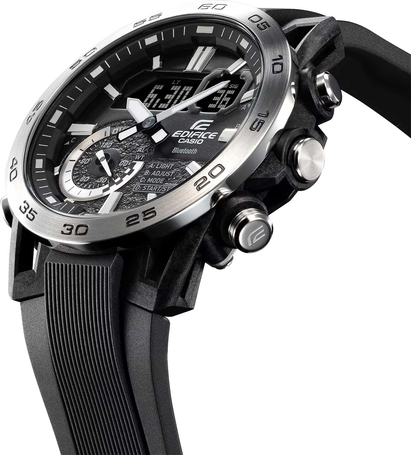 ). Автоматический переход на зимнее и летнее время, возможность включения/отключения данной функции. Переключение между домашним и мировым временем. Беспроводная технология BluetoothBluetoothСовременная технология, позволяющая синхронизировать часы с телефоном и переносить данные. Часы с Bluetooth расширяют возможности вашего смартфона и делают его использование ещё более удобным. со сверхнизким потреблением энергии для синхронизации со смартфоном. При подключении к смартфону часы корректируют текущее время, настраивают будильник, а также копируют настройки мирового времени (до 300 городов). Приложение EDIFICE Connected позволяет вести журнал показаний секундомера и прохождения этапов, вычислять разность между заданным временем и временем этапа. Отображение дней недели на шести языках. Смена отображения даты/месяца. Функции перемещения стрелок, поиска телефона и включения/отключения звука. Включение/выключение звукового сигнала по расписанию.
