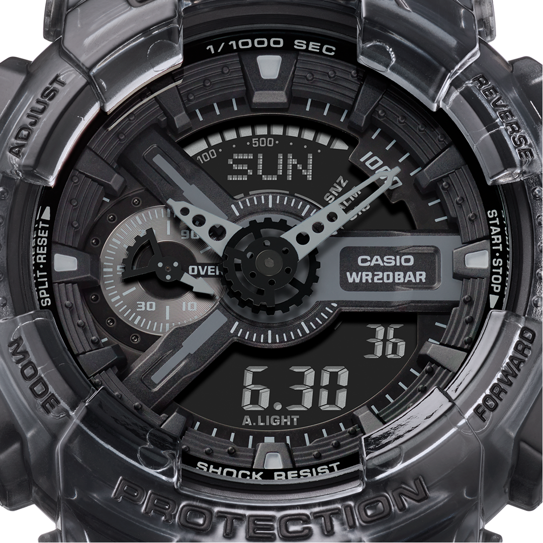 Casio GA-110SKE-8AER современные часы в ударопрочном корпусе, с удобным элементом управления в виде колеса прокрутки. Минеральное стекло, устойчивое к появлению царапин. Корпус часов выполнен в черной цветовой гамме, часы прочно удерживаются на руке браслетом из полимерного пластика. Часы GA-110SKE-8AER снабжены множеством дополнительных функций - повтор будильника, автоматический календарь. Ежечасный сигнал, повтор сигнала будильника, мировое время. Водонепроницаемость часов до 200 метров. Магнитоустойчивые. Элемент питания CR1220, точность хода +\- 15 сек.в месяц.