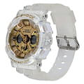 Японские женские часы-хронографХронографФункция позволяет измерять отрезки времени с особой точностью: часы, минуты, секунды. Верным признаком хронографа является наличие на циферблате 3 дополнительных окошек-счётчиков. Casio G-Shock GMA-S120SG-7AER. Стильная и лаконичная фешн-модель в полупрозрачном корпусе из серии G-SHOCK S SERIES с аналого-цифровым циферблатом золотого цвета. Без сомнения, эти яркие и аутентичные джишоки способны приковать к себе внимание и украсить любое, даже самое изящное женское запястье. Минеральное стеклоМинеральное стеклоМинеральное стекло представляет собой искусственно выращенный минерал кварца. Такое стекло отличается особой устойчивостью к повреждениям и царапинам. Уступает по некоторым качествам сапфировому стеклу. устойчивое к появлению царапин, обладающее высокой прозрачностью. Ударопрочный корпусУдаропрочный корпусМеханизм заключён в корпус, выполненный из современных материалов, устойчивых к ударам, механическим повреждениям и падению с высоты: инновационный пластик, карбон, нержавеющая сталь, титан. защищает механизм от ударов и вибрации. Многокомпонентный циферблат состоит из цифровых окошек указателей числа и дня недели, а также индикатора режима работы часов, который расположен в позиции 9 часов и выполнен в виде пропеллера. Светодиодная автоподсветка - при повороте часов в сторону лица подсветка дисплея осуществляется автоматически. Настраиваемое послесвечение 1,5 или 3сек. Мировое времяМировое время Полезное часовое усложнение, отображающее время в основных городах и известных областях по всему миру, оно связано с часовыми поясами, удобно для путешественников и бизнесменов. – 48 городов (29 часовых поясов). СекундомерСекундомерСекундоме́р — прибор, способный измерять интервалы времени с точностью до долей секунды. с точностью измерения 1/100 секунды и измерением до 23 часов 59 минут 59,99 cек. ТаймерТаймерОтсчитывает секунды в обратном направлении в заданном интервале времени. обратного отсчета (диапазон времени 24 часа), автоматический календарь, 12/24 отображение времени. 5 будильниковБудильникБуди́льник — часы, в заданный момент времени подающие звуковой, световой и/или в редких случаях другой сигнал., один с функцией Snooze, ежечасный сигнал. Класс водозащиты: 200 метров, позволит плавать, нырять и заниматься другими водными видами спорта. Ремешок из полимерного материала на стандартной застежке.