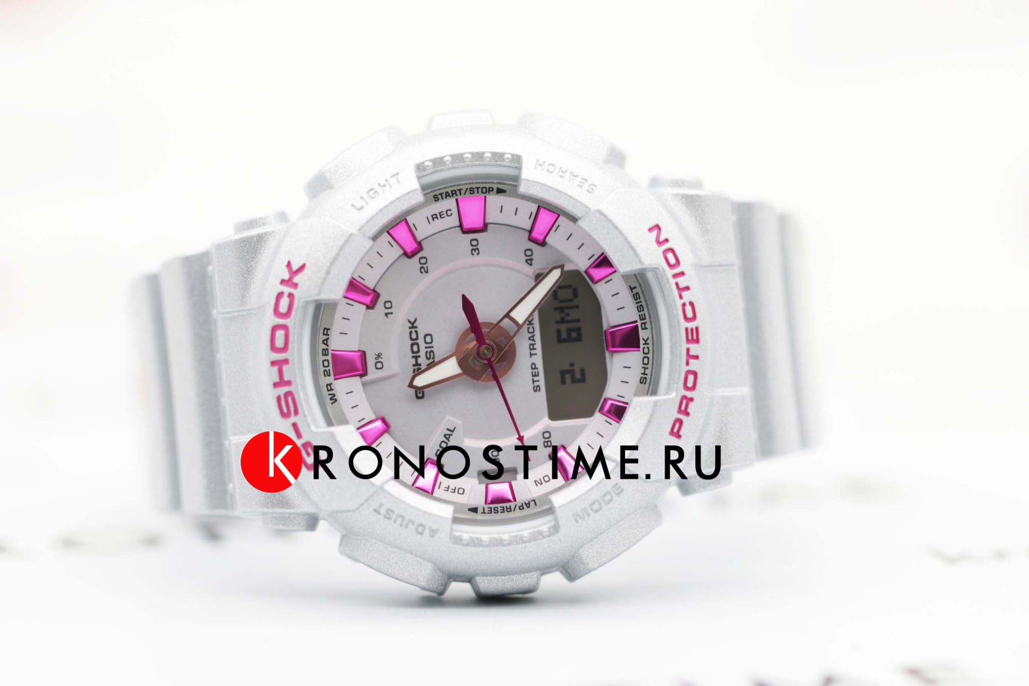 Японские женские противоударные часы с шагомером Casio G-Shock GMA-S130NP-8A, кварцевый механизм с высокой точностью. Класс водозащиты: 200 метров, позволит плавать, нырять и заниматься другими водными видами спорта. Корпус часов изготовлен из пластика серебристого цвета. БудильникБудильникБуди́льник — часы, в заданный момент времени подающие звуковой, световой и/или в редких случаях другой сигнал., таймер и секундомерСекундомерСекундоме́р — прибор, способный измерять интервалы времени с точностью до долей секунды.. Задняя крышка из нержавеющей стали с гравировкой крепится к корпусу 4 винтами. Автоматический вечный календарьВечный календарьКлассическое часовое усложнение, представляющее собой календарь, рассчитанный на несколько лет вперёд (стандартно – до 2099 года). Определяет текущую дату, день недели, месяц. не требует дополнительных настроек и показывает дату, день недели и месяц, которые могут быть настроены вплоть до 2099 года. Двойная электролюминесцентная подсветкаЭлектролюминесцентная подсветкаЭлектролюминесцентная панель устанавливается под ЖК-экраном часов, при нажатии кнопки электричество преобразуется в свет за счёт подачи напряжения на атомы фосфора, такой тип подсветки позволяет освещать весь циферблат., освещающая и основной циферблат, и жидкокристаллический дисплей, активируется при нажатии соответствующей кнопки и имеет настраиваемое время свечения 1,5 или 3 сек. Встроенный 3-осный умный акселерометр позволяет подсчитывать ежедневную активность владельца. Функция подсчета количества шагов, установки ежедневной цели и напоминания об отсутствии активности.