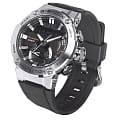 Наручные часы в чёрно-серебристой расцветке помогут всегда находиться в центре внимания, они станут выигрышной деталью любого образа. Разработчики Casio выбрали для этой модели обновлённый противоударный корпусУдаропрочный корпусМеханизм заключён в корпус, выполненный из современных материалов, устойчивых к ударам, механическим повреждениям и падению с высоты: инновационный пластик, карбон, нержавеющая сталь, титан., реализовав технологию Carbon Core GuardCarbon Core Guard Новейшая структура корпуса, разработанная Casio. Полиуретановая пластина дополнительно усилена карбоновыми вставками, что придаёт специальную защиту от механических повреждений. Карбон отличается лёгкостью и прочностью.. Часы на солнечной батарее станут идеальным спутником в любой ситуации. Двойная подсветка - люминесцентнаяЛюминесцентное покрытиеПозволяет считывать показания времени в темноте. Производители наносят на стрелки, часовые индексы, безель или поверхность циферблата светонакопительный состав, дающий холодное свечение. и светодиодная Светодиодная подсветкаСветодиодная или LED-подсветка обеспечивает появление яркого холодного свечения за счёт LED-элементов - маленьких лампочек. Они потребляют минимальное количество энергии, чаще всего можно встретить 1 светодиод, в нижней части циферблата.. Ремешок из полимерного материала. БезельБезельВнешний ободок, закрепляющий стекло. В спортивных часах так называется поворотное кольцо с делениями на циферблате, выполняет роль таймера – замеряет отрезки времени на шкале. Неподвижный безель – элемент декора. Однонаправленно вращающийся безель на дайверских часах позволяет фиксировать моменты погружения и выныривания на поверхность. из нержавеющей стали 316L. Минеральное стекло. Индикатор состояния заряда батарейки. Функции: BluetoothBluetoothСовременная технология, позволяющая синхронизировать часы с телефоном и переносить данные. Часы с Bluetooth расширяют возможности вашего смартфона и делают его использование ещё более удобным., будильник, секундомер, таймер, мировое времяМировое время Полезное часовое усложнение, отображающее время в основных городах и известных областях по всему миру, оно связано с часовыми поясами, удобно для путешественников и бизнесменов. , автоматический календарь. Габариты: 53,9 x 49,2 x 14,5 мм.