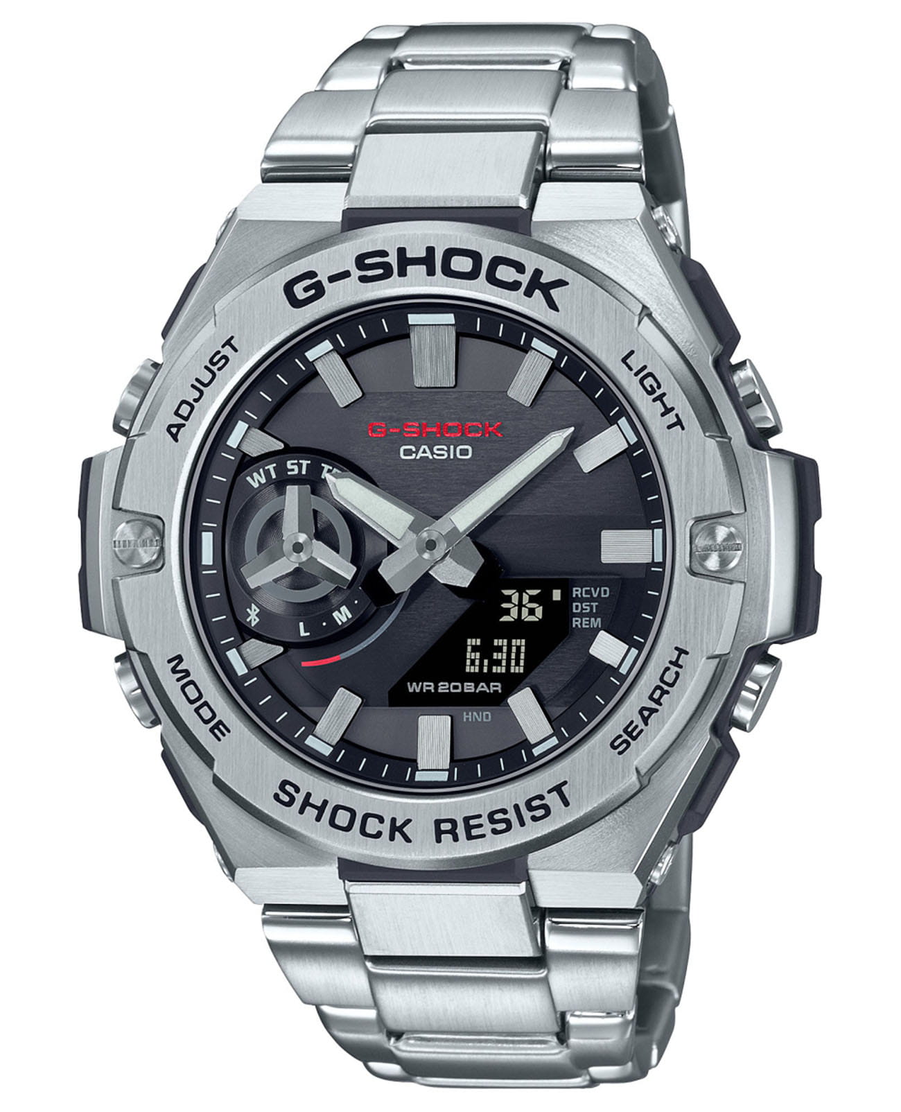 Японские мужские часы-хронографХронографФункция позволяет измерять отрезки времени с особой точностью: часы, минуты, секунды. Верным признаком хронографа является наличие на циферблате 3 дополнительных окошек-счётчиков. с минеральным стекломМинеральное стеклоМинеральное стекло представляет собой искусственно выращенный минерал кварца. Такое стекло отличается особой устойчивостью к повреждениям и царапинам. Уступает по некоторым качествам сапфировому стеклу. Casio G-Shock GST-B500D-1AER, кварцевый механизм с высокой точностью. Линейка GST-B500 объединяет в себе все самое необходимое, что нужно современным мужчинам. Питание от солнечной энергии Tough SolarTough SolarТехнология основана на подзарядке аккумулятора от источника солнечного света, специальная панель улавливает солнечные лучи и преобразует их в энергию для работы часов. Достаточно пары минут нахождения на солнце для функционирования часов в течении суток. солнечные батарейки большой мощности, индикатор заряда батареи. Функция автоматического сохранения энергии. Время работы аккумулятора без подзарядки приблизительно 7 месяцев, при включенной функции сохранения энергии приблизительно 18 месяцев. Механизм часов помещен в корпус из прочного материала, который надежно защищает от внешних воздействий, от ударов и вибрации. Carbon Core GuardCarbon Core Guard Новейшая структура корпуса, разработанная Casio. Полиуретановая пластина дополнительно усилена карбоновыми вставками, что придаёт специальную защиту от механических повреждений. Карбон отличается лёгкостью и прочностью. объединяет корпус и заднюю крышку в единый карбоновый моноблок. Ударопрочный корпусУдаропрочный корпусМеханизм заключён в корпус, выполненный из современных материалов, устойчивых к ударам, механическим повреждениям и падению с высоты: инновационный пластик, карбон, нержавеющая сталь, титан. из стали и полимерного материала защищает механизм от ударов и вибрации. Двойная светодиодная белая подсветка Super Illuminator с функцией Afterglow, одновременно подсвечивается аналоговый циферблат и цифровой дисплей. Светонакопительное покрытие NeobriteПодсветка NeobriteИспользование светонакопительных составов на основе сульфида цинка или алюмината стронция, яркий свет можно наблюдать на протяжении 6-10 часов после «зарядки» часов около источника света. обеспечивает длительное послесвечение в темноте даже после кратковременного нахождения на свету. Сплит-хронографСплит-хронографИспользуется для измерения продолжительности нескольких временных отрезков, начинающихся одновременно, а заканчивающихся в разное время.. ТаймерТаймерОтсчитывает секунды в обратном направлении в заданном интервале времени. обратного отсчета от 1 секунды до 1 часа. Мировое времяМировое время Полезное часовое усложнение, отображающее время в основных городах и известных областях по всему миру, оно связано с часовыми поясами, удобно для путешественников и бизнесменов. – 38 часовых поясов, всемирное координированное время (UTCUTCВсемирное кординационное время, не имеющее привязки к географическому положению Гринвича, основывается на атомном отсчёте времени. Регулировка времени осуществляется более точно, чем устаревшее GMT.
