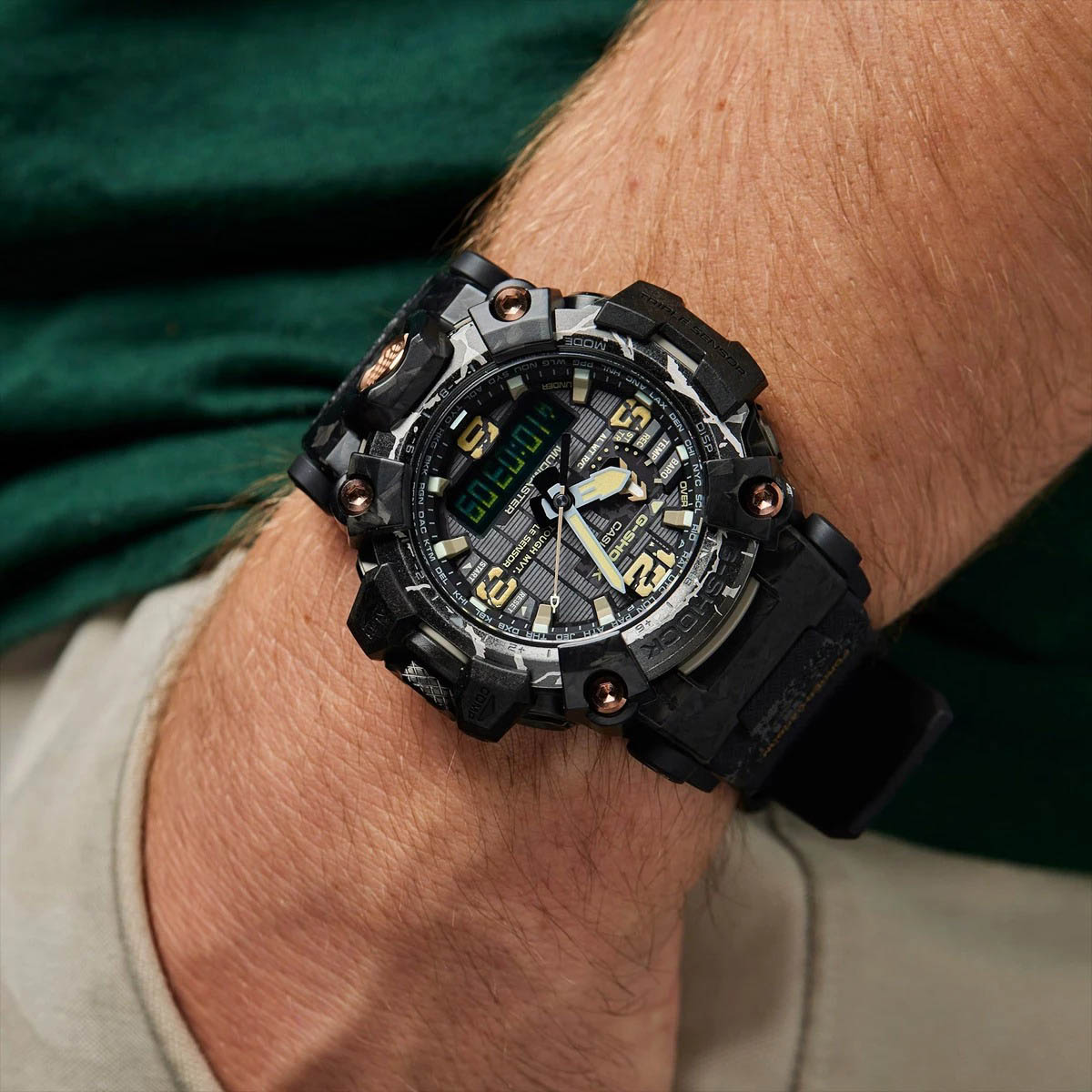 Японские мужские умные наручные часы Casio G-SHOCK GWG-2000CR-1ADR (GWG-2000CR-1A) c хронографомХронографФункция позволяет измерять отрезки времени с особой точностью: часы, минуты, секунды. Верным признаком хронографа является наличие на циферблате 3 дополнительных окошек-счётчиков., кварцевый механизм с высокой точностью. Сапфировое стеклоСапфировое стеклоПрочный и надёжный материал из кристалла сапфира синтетического происхождения, характеризующийся особой твёрдостью и устойчивостью к царапинам и повреждениям. устойчивое к появлению царапин, обладающее высокой прозрачностью. Класс водозащиты: 200 метров, позволит плавать, нырять и заниматься другими водными видами спорта. Часы спроектированы и разработаны специально для работы в суровых условиях. Питание от солнечной энергии Tough Solar - солнечные батарейки большой мощности, индикатор заряда батареи. Время работы аккумулятора без подзарядки до 6 месяцев, при включенной функции сохранения энергии до 25 месяцев. Технология Carbon Core Guard. Противоударный пластиковый корпус с карбоновыми волокнами более прочный и, в то же время, более легкий. Этот же материал защищает внутренний модуль от повреждений и деформаций при ударах. Защита от попадания внутрь пыли и грязи. Модуль часов рассчитан на работу при низких температурах до -10°С/14°F. Двойная подcветка: циферблат и ЖК-дисплеи подсвечиваются светодиодом, благодаря наличию функции задержки, после отпускания кнопки освещение горит еще несколько секунд. Настраиваемое послесвечение 1,5 или 3сек. Цвет подсветки: белый. Необритовое светонакопительное покрытие обеспечивает длительное послесвечение в темноте даже после кратковременного нахождения на свету. 12-ти и 24-х часовой формат времени. Секундомер с точностью показаний 1/100с и временем измерения 24ч. SPLIT-хронограф. Таймер обратного отсчета времени от 1с до 1ч. Мировое время – 29 городов (29 часовых поясов), всемирное координированное время (UTC). Функция включения/отключения летнего времени. Переключение между домашним и мировым временем. Высотомер - встроенный датчик барометрического давления с возможностью вывода результатов в единицах высоты над уровнем моря (от -700 до 10000 метров), единица измерения 1м. График набора высоты. Хранение до 30 записей о высотных точках рельефа местности - измеренной абсолютной высоты, даты и времени. Барометр - измерение атмосферного давления от 260 до 1100 гПа (от 195 до 825 мм рт. ст.). Встроенный датчик температуры от -10° до +60°С с точностью 0,1°C. Технология Multi Band 6 позволяет принимать сигналы от шести радиовышек, расположенных в различных точках земного шара, которые передают временные сигналы от определенных атомных часов.