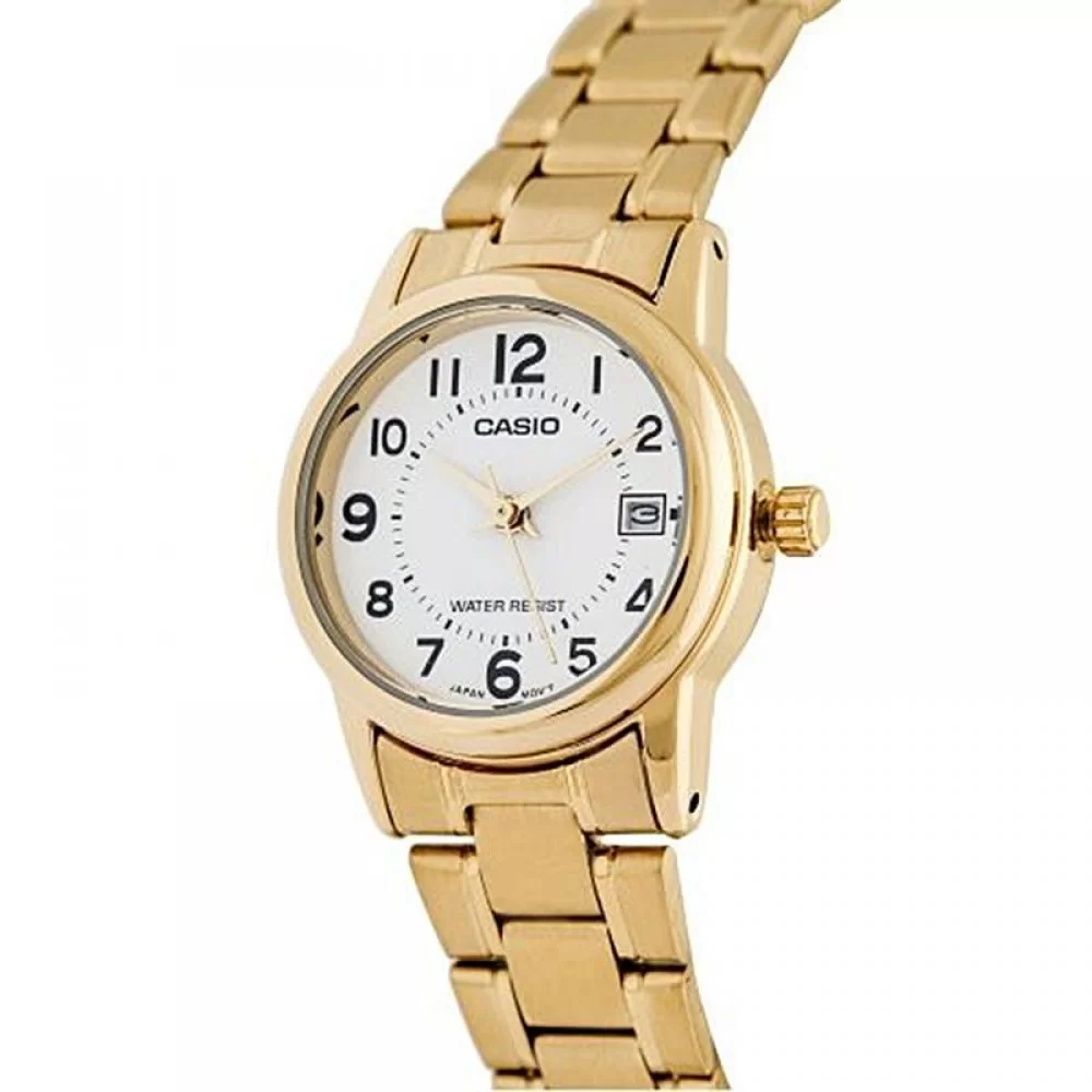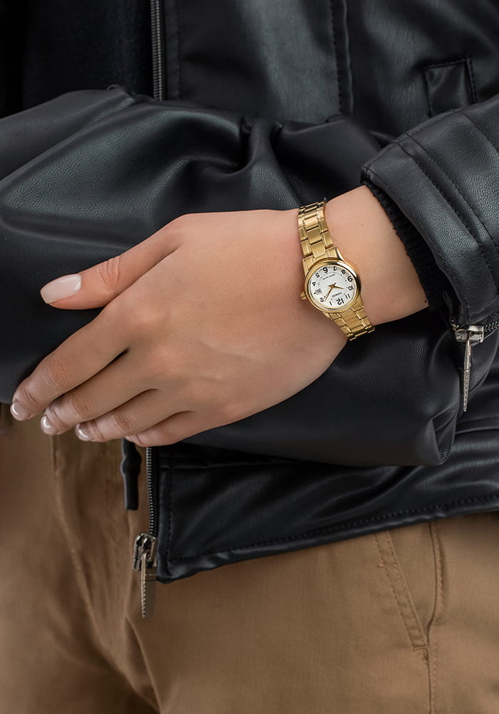 Японские женские часы LTP-V002G-7B с минеральным стекломМинеральное стеклоМинеральное стекло представляет собой искусственно выращенный минерал кварца. Такое стекло отличается особой устойчивостью к повреждениям и царапинам. Уступает по некоторым качествам сапфировому стеклу. изящно смотрятся на запястье, они привлекают классическим исполнением и правильной геометрией. Минималистичная модель станет отличным решением для любого случая: на работу, переговоры с деловыми партнёрами, прогулку с друзьями или праздничный вечер. Отсутствуют лишние детали, что позволяет часам быть актуальными на долгие годы. Корпус выполнен из нержавеющей стали с IP-покрытиемIP-покрытиеМетод ионного напыления. Демонстрирует повышенную устойчивость к истиранию, окислению и химическим веществам. Под воздействием высокого давления и температуры около 1500°C молекулы металла надёжно соединяются с частицами корпуса часов.. Модель комплектуется надёжным механизмом, точность хода которого составляет +/- 20 сек/мес. Водозащита 30 метров, позволит защитить корпус от случайных брызг или капель дождя. Стальной браслет на раскладной застёжкеРаскладная застёжкаТакой тип застёжки используется только на браслетах из металла. Она никогда не раскрывается полностью, происходит разделение на 2 и более частей. Раскладывающая застёжка снизит вероятность потери часов к минимуму. с IP-покрытиемIP-покрытиеМетод ионного напыления. Демонстрирует повышенную устойчивость к истиранию, окислению и химическим веществам. Под воздействием высокого давления и температуры около 1500°C молекулы металла надёжно соединяются с частицами корпуса часов..