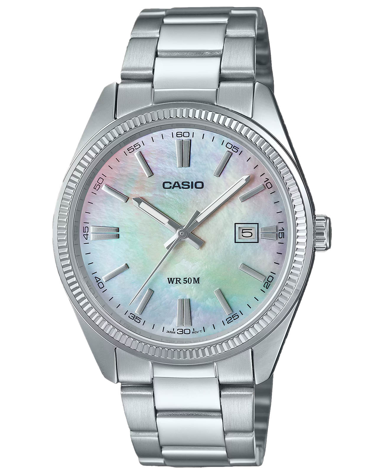 Лаконичный чёрный циферблат с серебристыми стрелками и метками никогда не утратит актуальности. Элегантности добавляет фактурный безельБезельВнешний ободок, закрепляющий стекло. В спортивных часах так называется поворотное кольцо с делениями на циферблате, выполняет роль таймера – замеряет отрезки времени на шкале. Неподвижный безель – элемент декора. Однонаправленно вращающийся безель на дайверских часах позволяет фиксировать моменты погружения и выныривания на поверхность.. Браслет сделан из нержавеющей стали 316L, отличающейся устойчивостью к царапинам и износу. Кварцевый механизм с высокой точностью хода. Водостойкость 50 метров. Стрелки с люминесцентным покрытиемЛюминесцентное покрытиеПозволяет считывать показания времени в темноте. Производители наносят на стрелки, часовые индексы, безель или поверхность циферблата светонакопительный состав, дающий холодное свечение.. Минеральное стеклоМинеральное стеклоМинеральное стекло представляет собой искусственно выращенный минерал кварца. Такое стекло отличается особой устойчивостью к повреждениям и царапинам. Уступает по некоторым качествам сапфировому стеклу.. Апертура даты. Габариты: 44,2 x 38,5 x 9,2 мм.