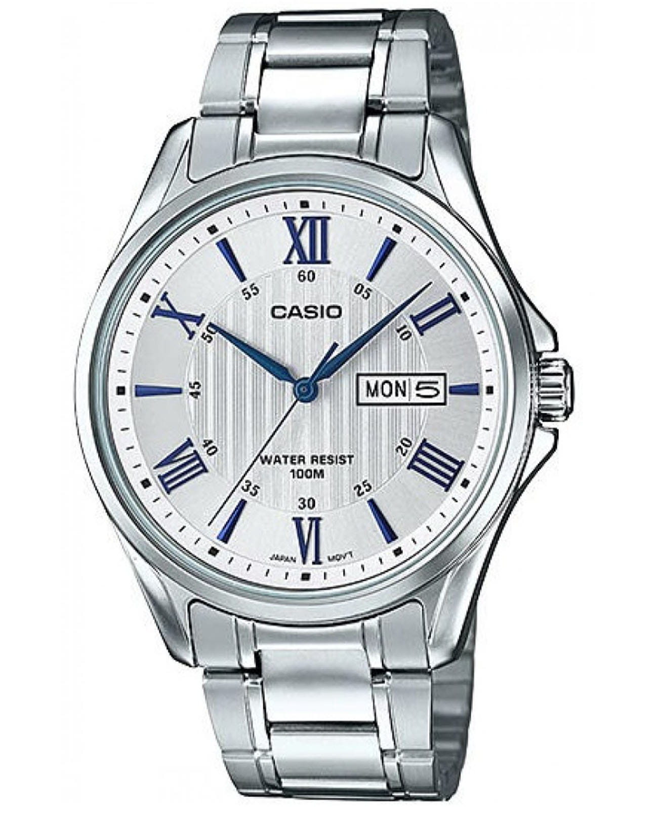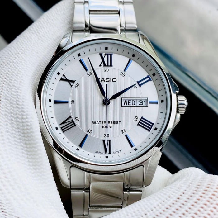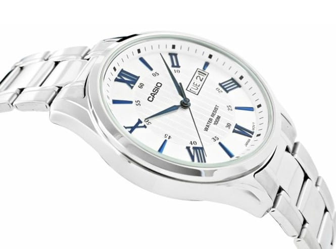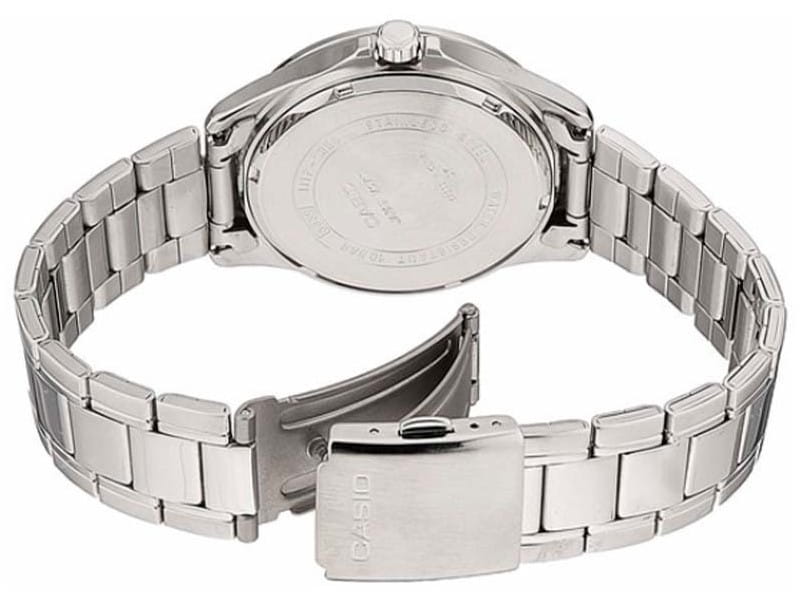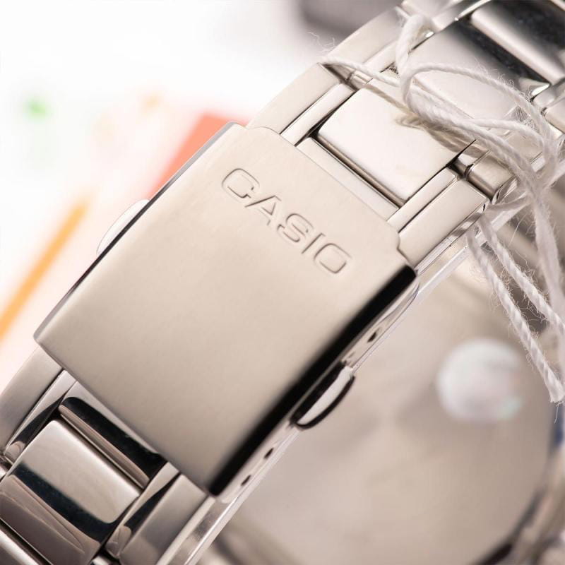 Японские мужские наручные часы с минеральным стекломМинеральное стеклоМинеральное стекло представляет собой искусственно выращенный минерал кварца. Такое стекло отличается особой устойчивостью к повреждениям и царапинам. Уступает по некоторым качествам сапфировому стеклу. Casio Collection MTP-1384D-7A2, кварцевый механизм с высокой точностью. Класс водозащиты: 100 метров, позволит плавать, нырять и заниматься другими водными видами спорта. Корпус часов изготовлен из стали. Стальной браслет на раскладной застёжкеРаскладная застёжкаТакой тип застёжки используется только на браслетах из металла. Она никогда не раскрывается полностью, происходит разделение на 2 и более частей. Раскладывающая застёжка снизит вероятность потери часов к минимуму.. Окошки дня недели и даты находятся в положении 3 часа. Заводная головка с защитой. Задняя крышка с винтовым фиксатором.