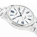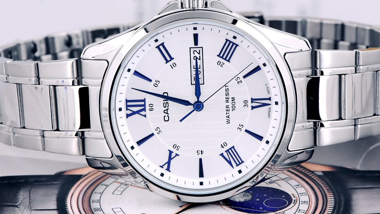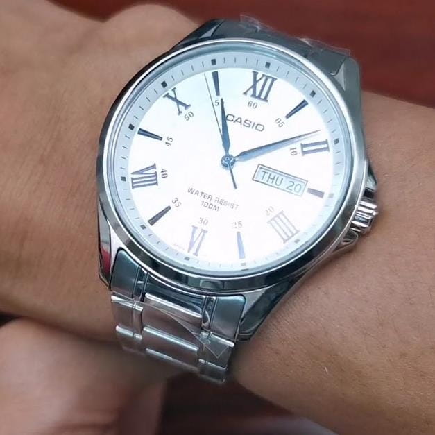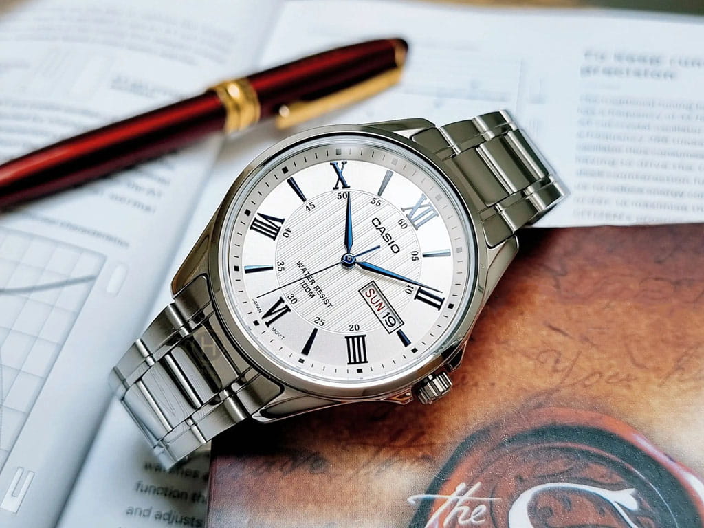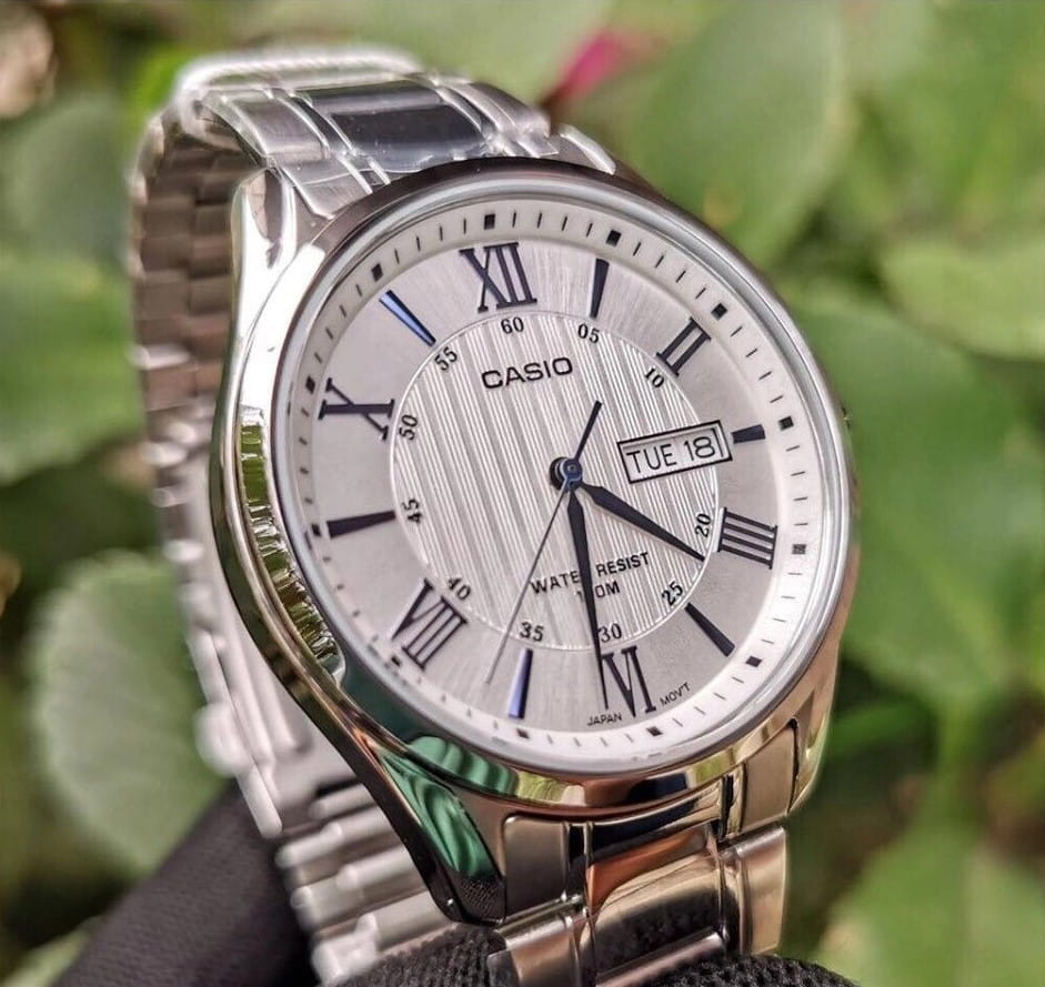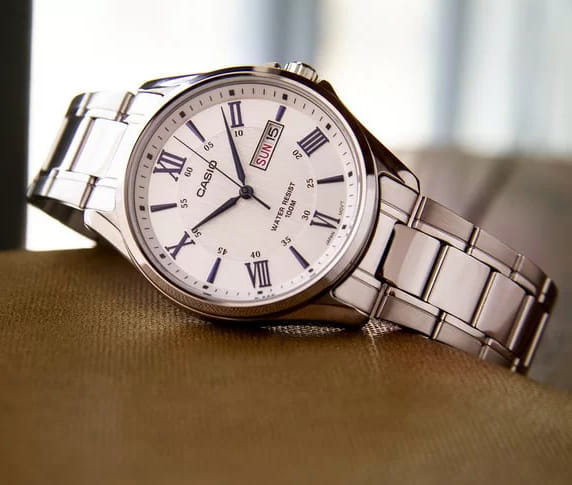 Японские мужские наручные часы с минеральным стекломМинеральное стеклоМинеральное стекло представляет собой искусственно выращенный минерал кварца. Такое стекло отличается особой устойчивостью к повреждениям и царапинам. Уступает по некоторым качествам сапфировому стеклу. Casio Collection MTP-1384D-7A2, кварцевый механизм с высокой точностью. Класс водозащиты: 100 метров, позволит плавать, нырять и заниматься другими водными видами спорта. Корпус часов изготовлен из стали. Стальной браслет на раскладной застёжкеРаскладная застёжкаТакой тип застёжки используется только на браслетах из металла. Она никогда не раскрывается полностью, происходит разделение на 2 и более частей. Раскладывающая застёжка снизит вероятность потери часов к минимуму.. Окошки дня недели и даты находятся в положении 3 часа. Заводная головка с защитой. Задняя крышка с винтовым фиксатором.