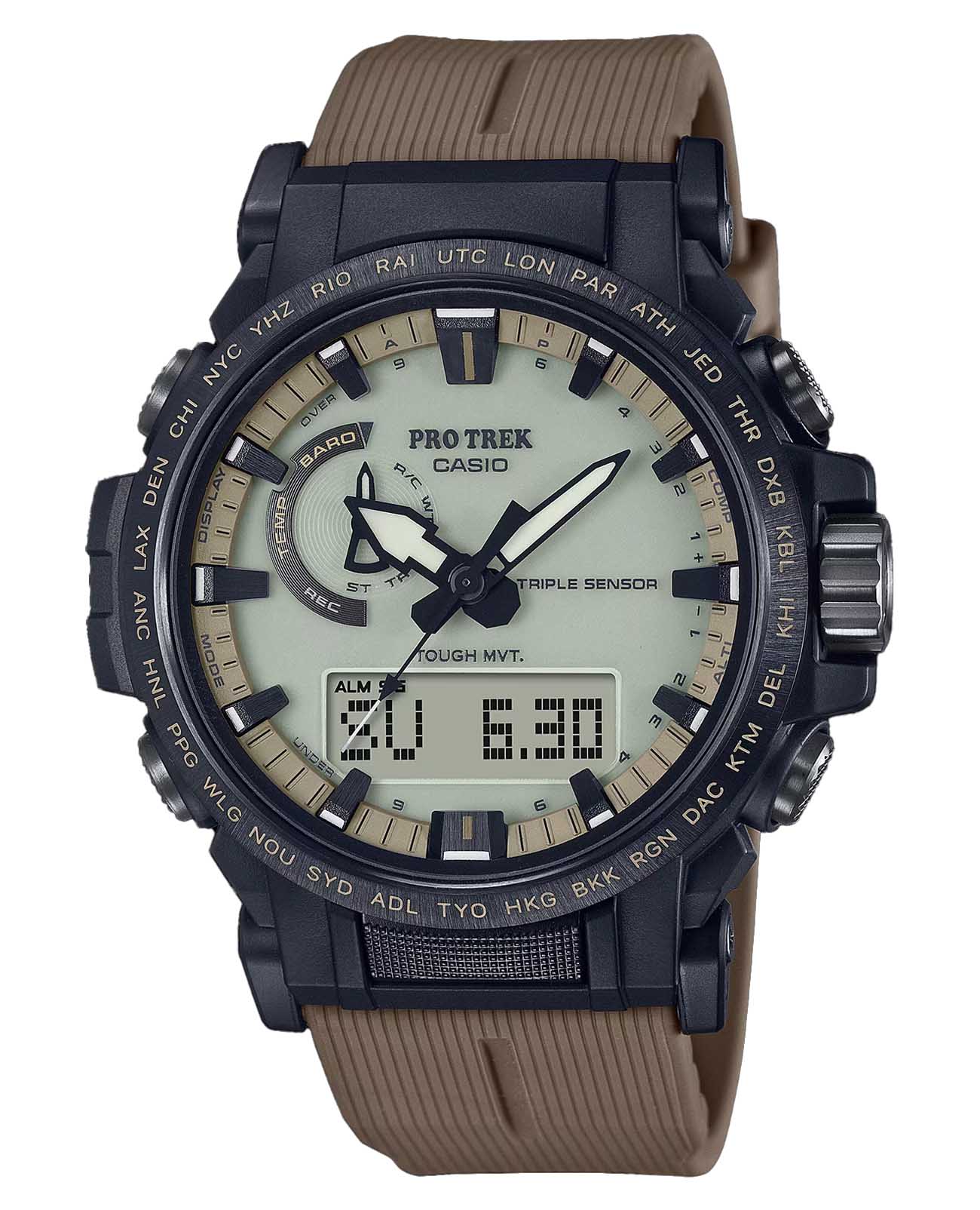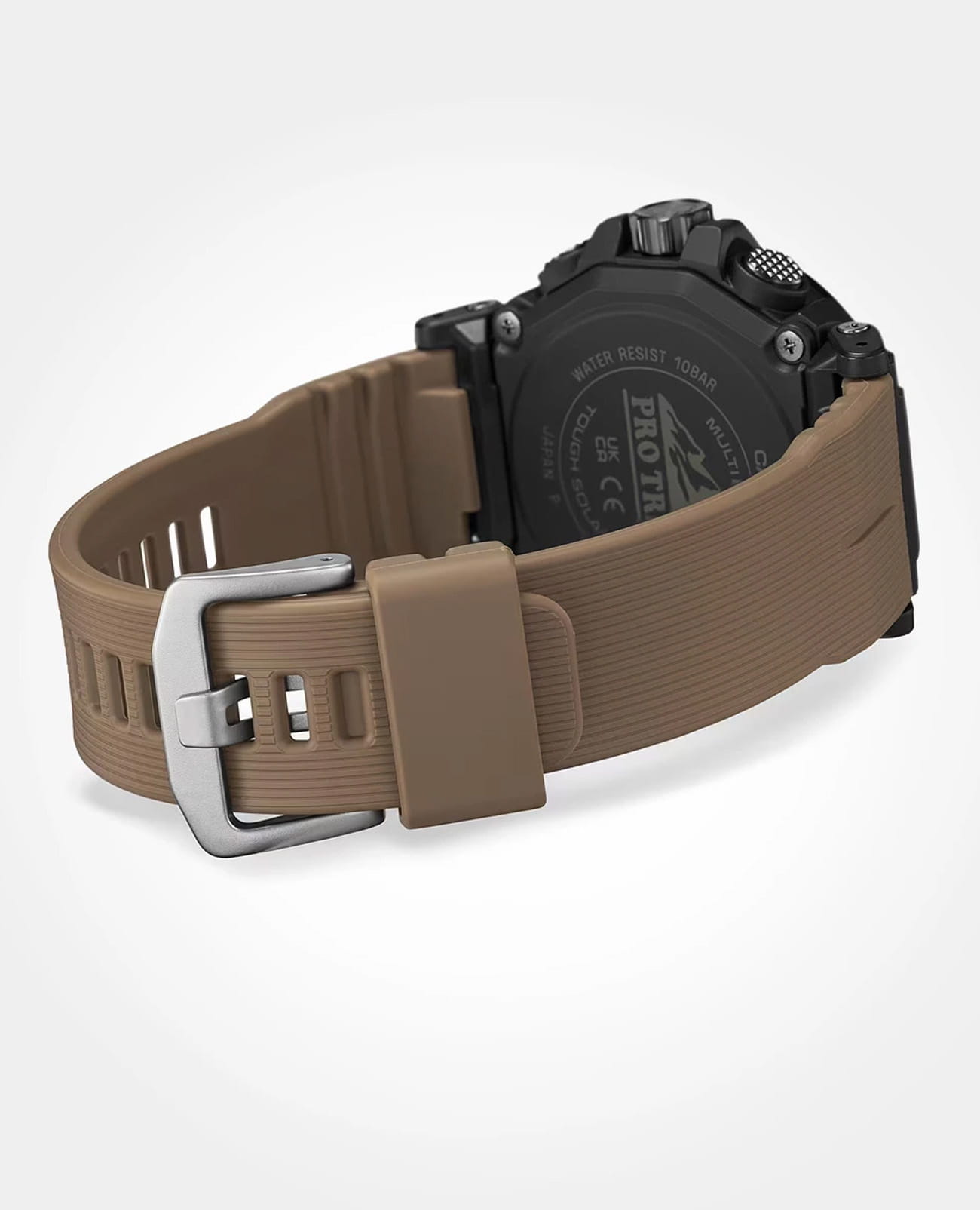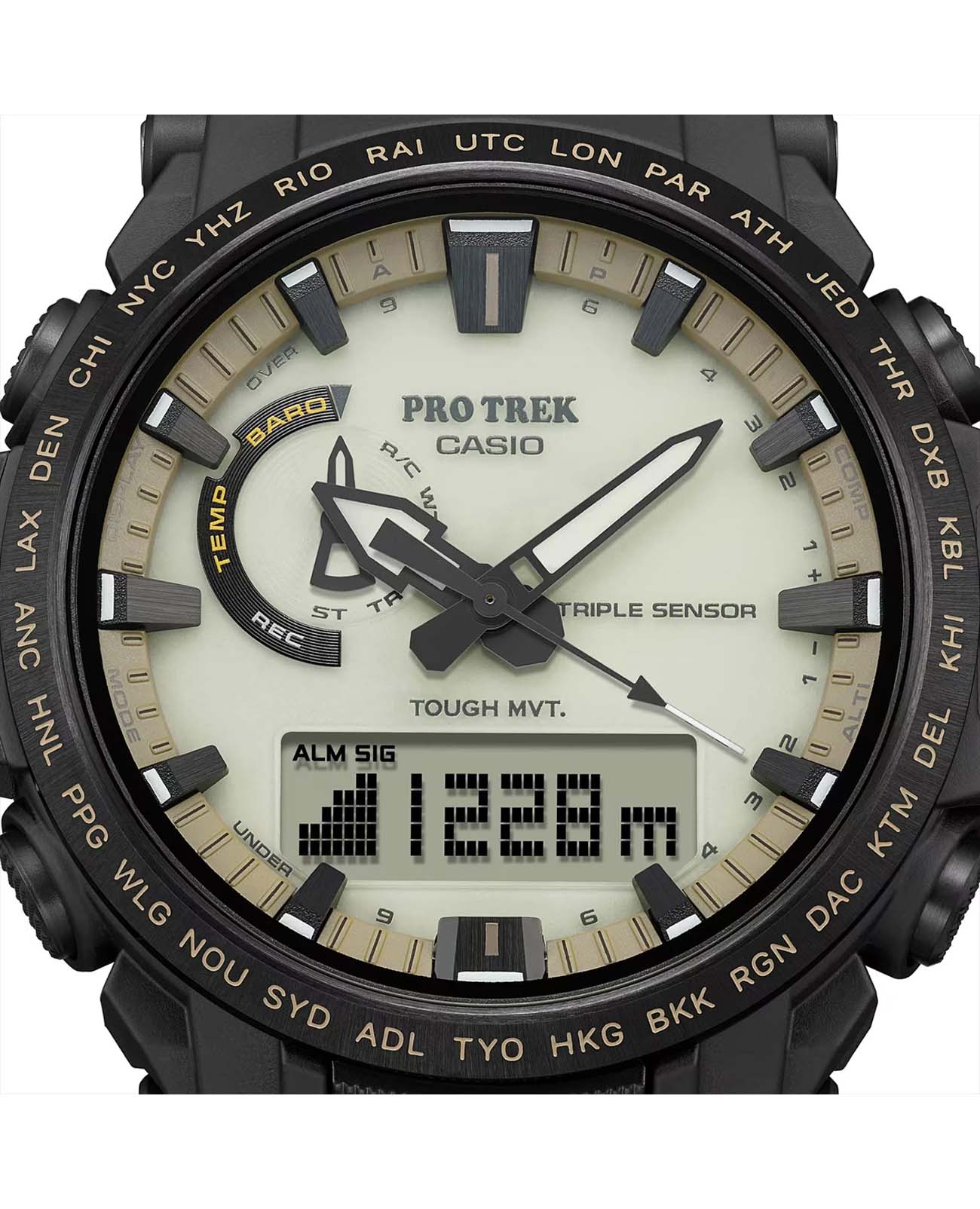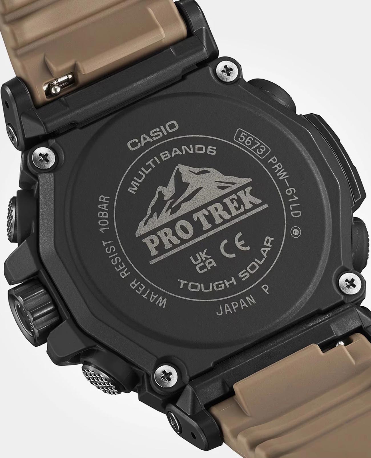 Мужские японские часы Casio Pro Trek PRW-61LD-5 из коллекции Pro Trek отличаются расширенным функционалом на все случаи жизни. Перед вами модель один из флагманов PRO TREK в черном корпусе PRW-61. Данные часы на бежевом полимерном ремешке получили улучшенную структуру корпуса, более устойчивую к ударным нагрузкам и еще более эффективную солнечную батарею, чем их предшественники из знаменитой серии PRW-6000. Особенностью модели является светлый циферблат, полностью покрытый необрайтовым, светящимся в темноте составом. В целом же, дизайн корпуса PRW-61 остался узнаваем и даже с такой начинкой, в которой можно отметить водонепроницаемость корпуса, термометр, барометр, высотомер, цифровой компас, Tough SolarTough SolarТехнология основана на подзарядке аккумулятора от источника солнечного света, специальная панель улавливает солнечные лучи и преобразует их в энергию для работы часов. Достаточно пары минут нахождения на солнце для функционирования часов в течении суток. и радио-синхронизацию, часы отлично подходят в качестве ежедневного аксессуара для жителя современного города. Минеральное стеклоМинеральное стеклоМинеральное стекло представляет собой искусственно выращенный минерал кварца. Такое стекло отличается особой устойчивостью к повреждениям и царапинам. Уступает по некоторым качествам сапфировому стеклу. устойчивое к появлению царапин, обладающее высокой прозрачностью. Отдельно стоит отметить эко-френдли полимер из которого сделаны ремешок, корпус и задняя крышка часов. В данной модели используется пластиковый полимер, сделанный из семян клещевины и кукурузы, а не из нефти, как это обычно бывает. Такой вид полимера является более биологически чистым и меньше загрязняет окружающую среду. Неподвижный безельБезельВнешний ободок, закрепляющий стекло. В спортивных часах так называется поворотное кольцо с делениями на циферблате, выполняет роль таймера – замеряет отрезки времени на шкале. Неподвижный безель – элемент декора. Однонаправленно вращающийся безель на дайверских часах позволяет фиксировать моменты погружения и выныривания на поверхность. из стали с IP-покрытиемIP-покрытиеМетод ионного напыления. Демонстрирует повышенную устойчивость к истиранию, окислению и химическим веществам. Под воздействием высокого давления и температуры около 1500°C молекулы металла надёжно соединяются с частицами корпуса часов.. Функции мирового времениМировое время Полезное часовое усложнение, отображающее время в основных городах и известных областях по всему миру, оно связано с часовыми поясами, удобно для путешественников и бизнесменов. – 29 часовых поясов и UTCUTCВсемирное кординационное время, не имеющее привязки к географическому положению Гринвича, основывается на атомном отсчёте времени. Регулировка времени осуществляется более точно, чем устаревшее GMT.