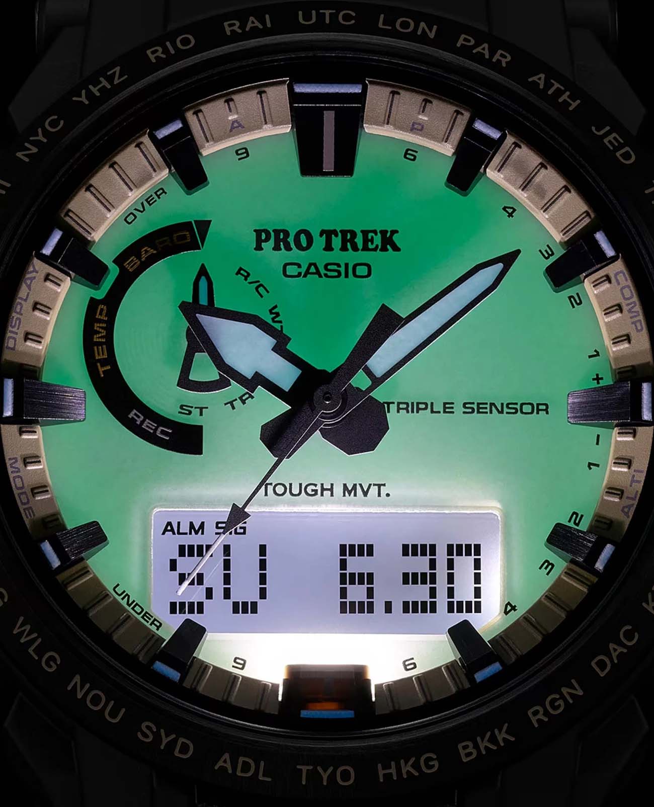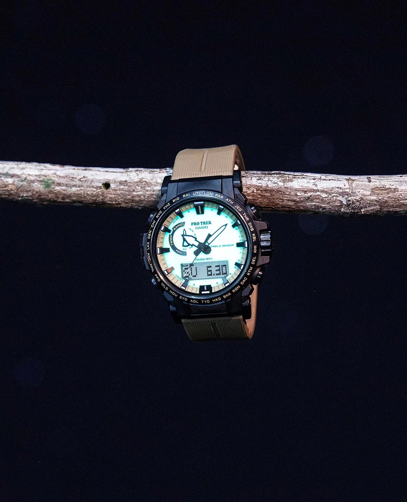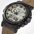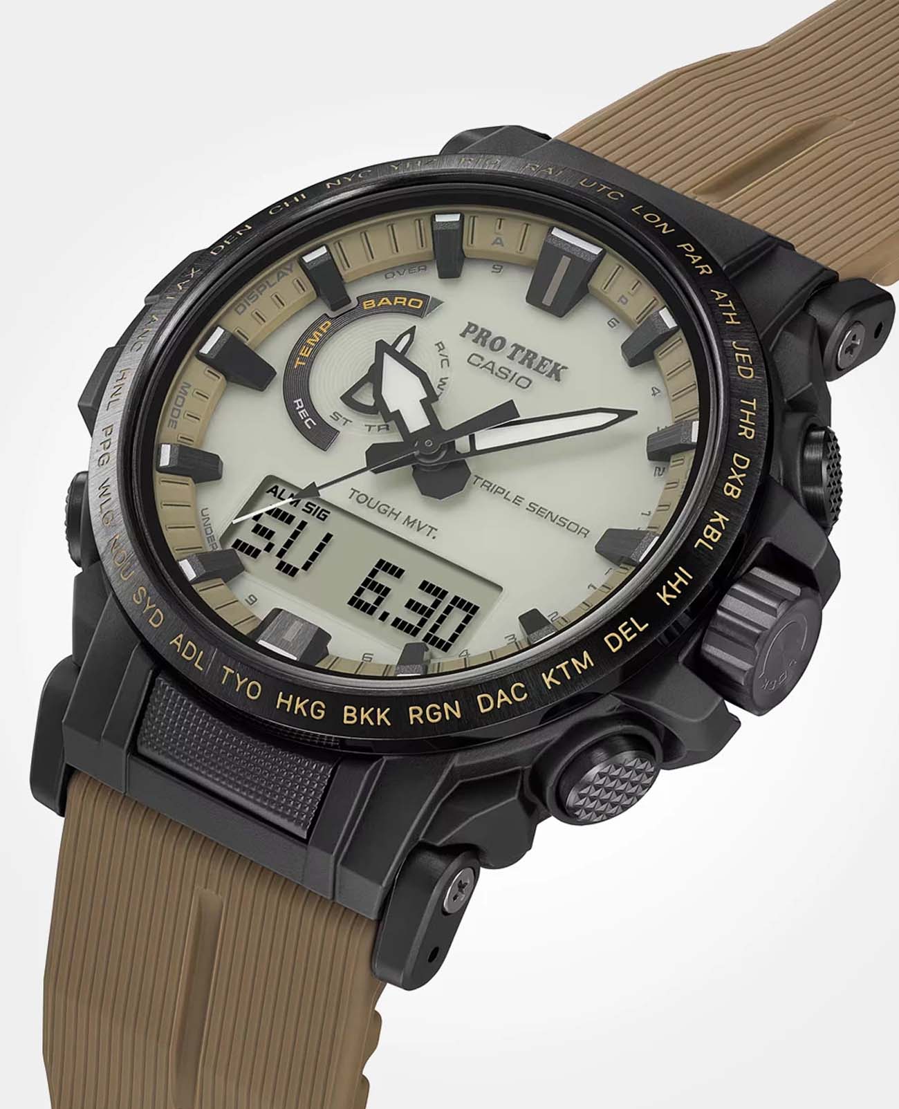 Мужские японские часы Casio Pro Trek PRW-61LD-5 из коллекции Pro Trek отличаются расширенным функционалом на все случаи жизни. Перед вами модель один из флагманов PRO TREK в черном корпусе PRW-61. Данные часы на бежевом полимерном ремешке получили улучшенную структуру корпуса, более устойчивую к ударным нагрузкам и еще более эффективную солнечную батарею, чем их предшественники из знаменитой серии PRW-6000. Особенностью модели является светлый циферблат, полностью покрытый необрайтовым, светящимся в темноте составом. В целом же, дизайн корпуса PRW-61 остался узнаваем и даже с такой начинкой, в которой можно отметить водонепроницаемость корпуса, термометр, барометр, высотомер, цифровой компас, Tough SolarTough SolarТехнология основана на подзарядке аккумулятора от источника солнечного света, специальная панель улавливает солнечные лучи и преобразует их в энергию для работы часов. Достаточно пары минут нахождения на солнце для функционирования часов в течении суток. и радио-синхронизацию, часы отлично подходят в качестве ежедневного аксессуара для жителя современного города. Минеральное стеклоМинеральное стеклоМинеральное стекло представляет собой искусственно выращенный минерал кварца. Такое стекло отличается особой устойчивостью к повреждениям и царапинам. Уступает по некоторым качествам сапфировому стеклу. устойчивое к появлению царапин, обладающее высокой прозрачностью. Отдельно стоит отметить эко-френдли полимер из которого сделаны ремешок, корпус и задняя крышка часов. В данной модели используется пластиковый полимер, сделанный из семян клещевины и кукурузы, а не из нефти, как это обычно бывает. Такой вид полимера является более биологически чистым и меньше загрязняет окружающую среду. Неподвижный безельБезельВнешний ободок, закрепляющий стекло. В спортивных часах так называется поворотное кольцо с делениями на циферблате, выполняет роль таймера – замеряет отрезки времени на шкале. Неподвижный безель – элемент декора. Однонаправленно вращающийся безель на дайверских часах позволяет фиксировать моменты погружения и выныривания на поверхность. из стали с IP-покрытиемIP-покрытиеМетод ионного напыления. Демонстрирует повышенную устойчивость к истиранию, окислению и химическим веществам. Под воздействием высокого давления и температуры около 1500°C молекулы металла надёжно соединяются с частицами корпуса часов.. Функции мирового времениМировое время Полезное часовое усложнение, отображающее время в основных городах и известных областях по всему миру, оно связано с часовыми поясами, удобно для путешественников и бизнесменов. – 29 часовых поясов и UTCUTCВсемирное кординационное время, не имеющее привязки к географическому положению Гринвича, основывается на атомном отсчёте времени. Регулировка времени осуществляется более точно, чем устаревшее GMT.