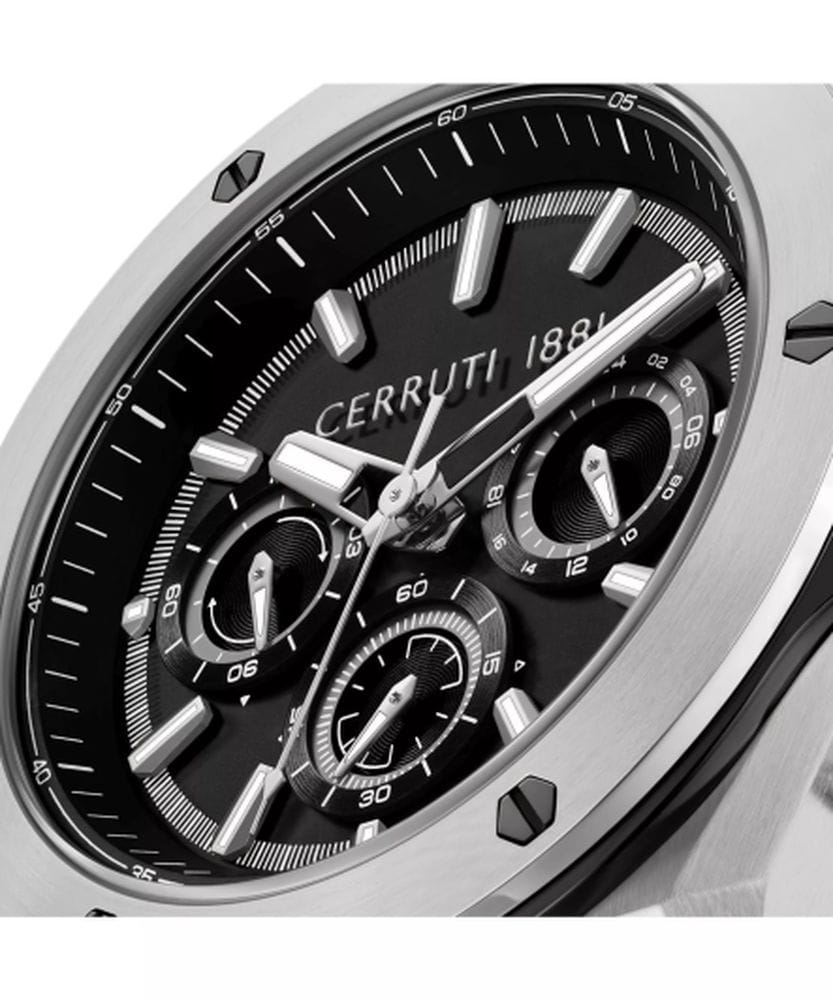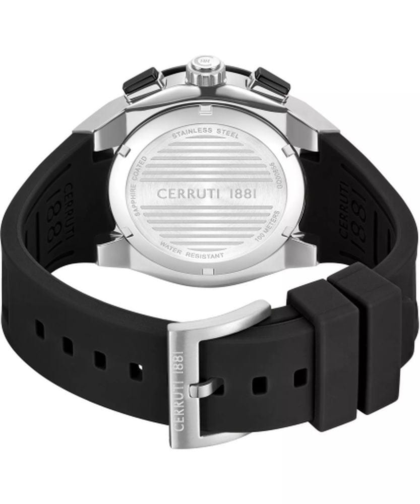 Cerruti 1881 CIWGQ0085601 — стильные мужские часы с выразительным индустриальным дизайном, в которых сочетаются спортивная энергия и итальянская элегантность. Корпус из нержавеющей стали с массивным безелемБезельВнешний ободок, закрепляющий стекло. В спортивных часах так называется поворотное кольцо с делениями на циферблате, выполняет роль таймера – замеряет отрезки времени на шкале. Неподвижный безель – элемент декора. Однонаправленно вращающийся безель на дайверских часах позволяет фиксировать моменты погружения и выныривания на поверхность. с частичным PVD-покрытиемPVDУльтратонкое покрытие наносится в технике вакуумного напыления, сочетает в себе нитрид титана особой прочности со слоем золота или оксида хрома. Несёт в себе декоративную или защитную функцию. и декоративными винтами придаёт модели мощный и мужественный облик. Глубокий циферблат с тремя счётчиками хронографаХронографФункция позволяет измерять отрезки времени с особой точностью: часы, минуты, секунды. Верным признаком хронографа является наличие на циферблате 3 дополнительных окошек-счётчиков. подчёркивает технический характер часов, а контрастные стрелки и метки с люминесцентным покрытиемЛюминесцентное покрытиеПозволяет считывать показания времени в темноте. Производители наносят на стрелки, часовые индексы, безель или поверхность циферблата светонакопительный состав, дающий холодное свечение. обеспечивают отличную читаемость при любом освещении. Прочное минеральное стеклоМинеральное стеклоМинеральное стекло представляет собой искусственно выращенный минерал кварца. Такое стекло отличается особой устойчивостью к повреждениям и царапинам. Уступает по некоторым качествам сапфировому стеклу. защищает циферблат от царапин, а эластичный силиконовый ремешок гарантирует комфорт при повседневном ношении. Cerruti 1881 — гармоничное сочетание функциональности, надёжности и узнаваемого итальянского стиля, идеально подходящее для активных и уверенных мужчин.