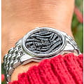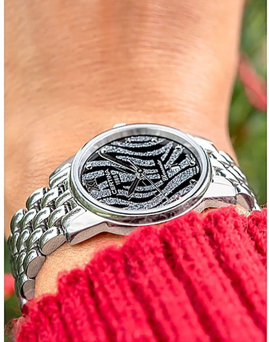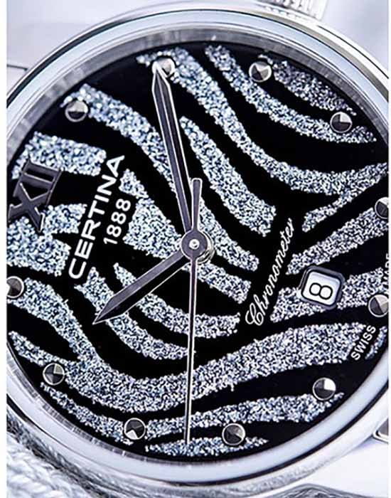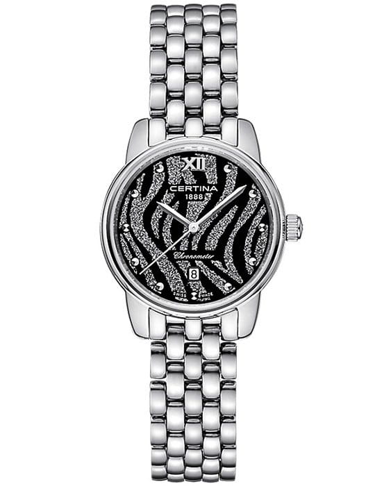 Чёрный циферблат с привлекательным узором дарует эстетическое наслаждение. Стальной браслет из нескольких рядов переплетающихся звеньев элегантно выглядит на запястье. Часы отмечены официальным сертификатом хронометра COSCСертификат COSCОфициальный сертификат, подтверждающий то, что часы ходят с особо высокой точностью. Для получения документа часы подвергаются тестовым испытаниям, разработанным швейцарским институтом тестирования хронометров COSC. Допустимая норма для механических часов -4/+6 секунд в день, для кварцевых моделей +/- 0,07 секунд в день., ведь в основе работы находится швейцарский кварцевый механизм ETA G10.962 Precidrive™Precidrive™Инновационный кварцевый механизм Certina. Часы, оснащённые этим швейцарским калибром, приравниваются к точности к сертифицированным хронометрам, точность хода составляет +/-10 секунд в год.. Ударопрочность и водонепроницаемость 10 бар – концепция DS ConceptDS ConceptDouble Security Concept, обозначает двойную надёжность и безупречную точность часов Certina. Двойная система защиты подразумевает обеспечение максимальной устойчивости к ударам и высоких показателей водонепроницаемости.. Одностороннее антибликовое покрытие стекла из сапфира. . Индикация текущего числа, функция EOLEOLПредставляет собой систему, уведомляющую владельца часов о необходимости замены элемента питания. За 2 недели до полного разряда батарейки секундная стрелка перестаёт ходить чётко и начинает перепрыгивать на 3-4 деления.. Диаметр корпуса: 27,5 мм.