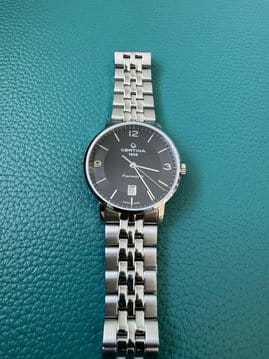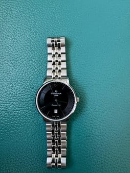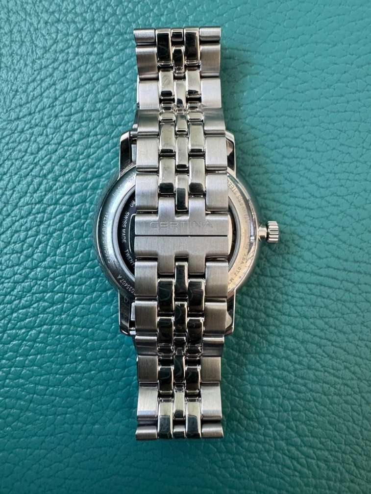 Чёрный минималистичный циферблат выдержан в строгом и сдержанном стиле. Привлекательно смотрится стальной браслет с рядами звеньев различного размера. Часы с автоматической системой завода оснащены пружинным калибром ETA Powermatic 80Powermatic 80Эксклюзивный калибр от швейцарской компании ETA с увеличенным запасом хода до 80 часов за счёт удлинённой заводной пружины. Характеризуется улучшенной системой спуска со сниженным трением., имеющим с 80-часовой запас хода. Прозрачная задняя крышка. Надёжный корпус из антикоррозионной стали 316L. Концепция DS ConceptDS ConceptDouble Security Concept, обозначает двойную надёжность и безупречную точность часов Certina. Двойная система защиты подразумевает обеспечение максимальной устойчивости к ударам и высоких показателей водонепроницаемости.. Сапфировое стекло. Водонепроницаемость 10 бар. . Апертура даты. Диаметр корпуса: 39 мм.
