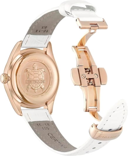Часы Certina – это воплощение высочайшей точности и надежности часов Беспрекословная точность и надежность, использование сложных технологий, инновационный подход в сочетании с традициями создания хронографов, которые марка пронесла через десятилетия, – все это позволяет компании предоставлять элитные, роскошные и стильные часы На обратной стороне нанесено изображение черепахи в знак долговечности Задняя крышка с повышенной прочностью, два кольца с уплотнением на заводной головке. Корпус этих часов небольшого размера (32,5 мм) и выполнен из нержавеющей стали с PVD-покрытиемPVDУльтратонкое покрытие наносится в технике вакуумного напыления, сочетает в себе нитрид титана особой прочности со слоем золота или оксида хрома. Несёт в себе декоративную или защитную функцию.. Certina DS-8 C0332573611800 имеет устойчивое к царапинам cапфировое стеклоСапфировое стеклоПрочный и надёжный материал из кристалла сапфира синтетического происхождения, характеризующийся особой твёрдостью и устойчивостью к царапинам и повреждениям.,кожаный ремешок, перламутровый циферблат Калибр механизма:ETA F05411 Precidrive Класс водозащиты: 100 м / 10 АТМ Для получения «звания» хронометра часы должны быть оснащены механизмом, имеющим официальный сертификат COSCСертификат COSCОфициальный сертификат, подтверждающий то, что часы ходят с особо высокой точностью. Для получения документа часы подвергаются тестовым испытаниям, разработанным швейцарским институтом тестирования хронометров COSC. Допустимая норма для механических часов -4/+6 секунд в день, для кварцевых моделей +/- 0,07 секунд в день..(Contrôle Officiel Suisse des Chronomètres - Швейцарское бюро по сертифицированию хронометров).