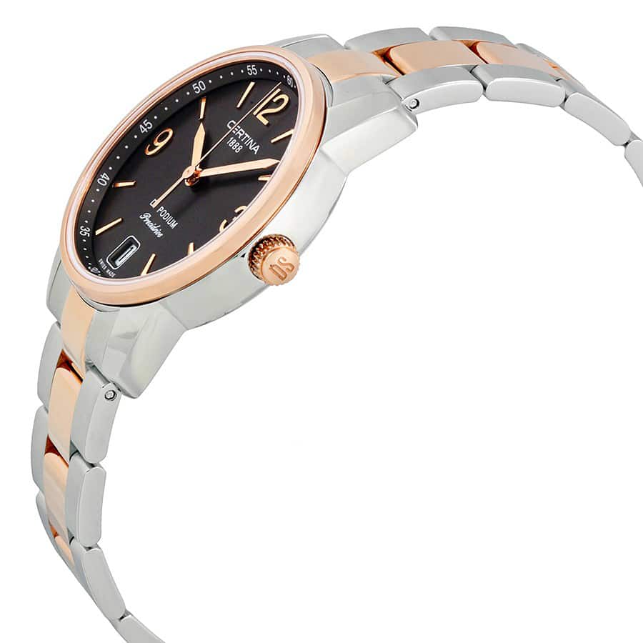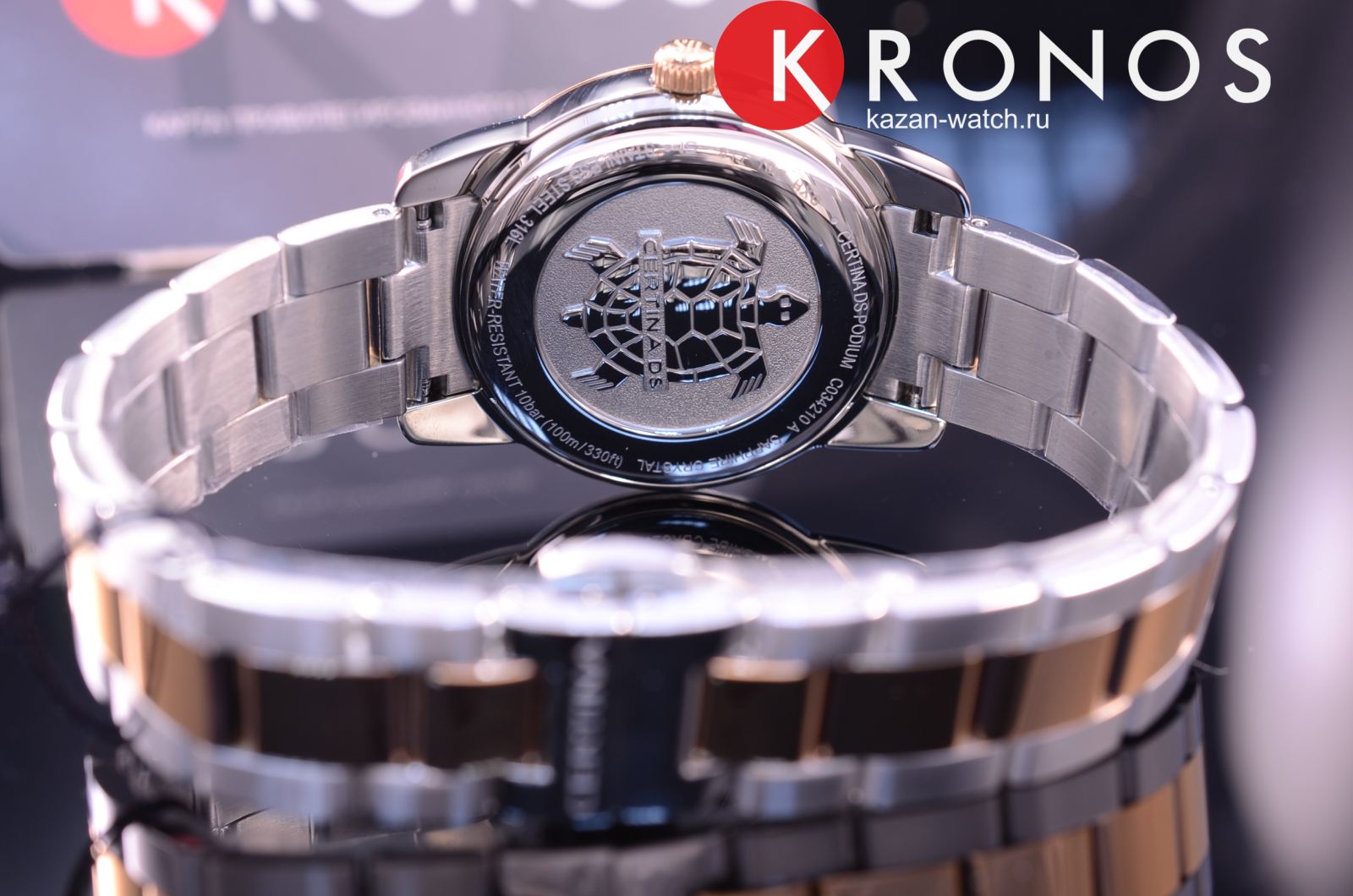 Модель с изысканной формой корпуса умело комбинирует элегантность и спортивный стиль, претворяя в жизнь универсальные часы для делового, повседневного или вечернего наряда. Они оснащены швейцарским кварцевым калибром ETA F03.411 Precidrive™Precidrive™Инновационный кварцевый механизм Certina. Часы, оснащённые этим швейцарским калибром, приравниваются к точности к сертифицированным хронометрам, точность хода составляет +/-10 секунд в год., обеспечивающим абсолютную точность показателей. Сапфировое стекло с односторонним антибликовым покрытием. Водостойкость 100 метров. Концепция DS ConceptDS ConceptDouble Security Concept, обозначает двойную надёжность и безупречную точность часов Certina. Двойная система защиты подразумевает обеспечение максимальной устойчивости к ударам и высоких показателей водонепроницаемости.. Нержавеющая сталь с частичным PVD-покрытиемPVDУльтратонкое покрытие наносится в технике вакуумного напыления, сочетает в себе нитрид титана особой прочности со слоем золота или оксида хрома. Несёт в себе декоративную или защитную функцию. цвета розового золота. . Апертура даты, функция EOLEOLПредставляет собой систему, уведомляющую владельца часов о необходимости замены элемента питания. За 2 недели до полного разряда батарейки секундная стрелка перестаёт ходить чётко и начинает перепрыгивать на 3-4 деления.. Диаметр корпуса: 33 мм.