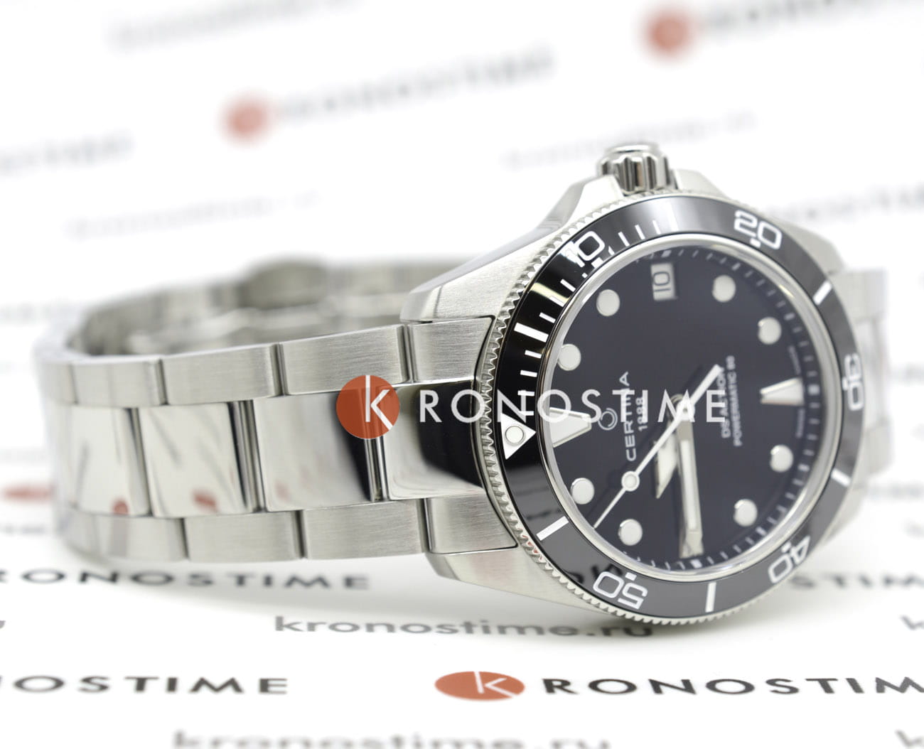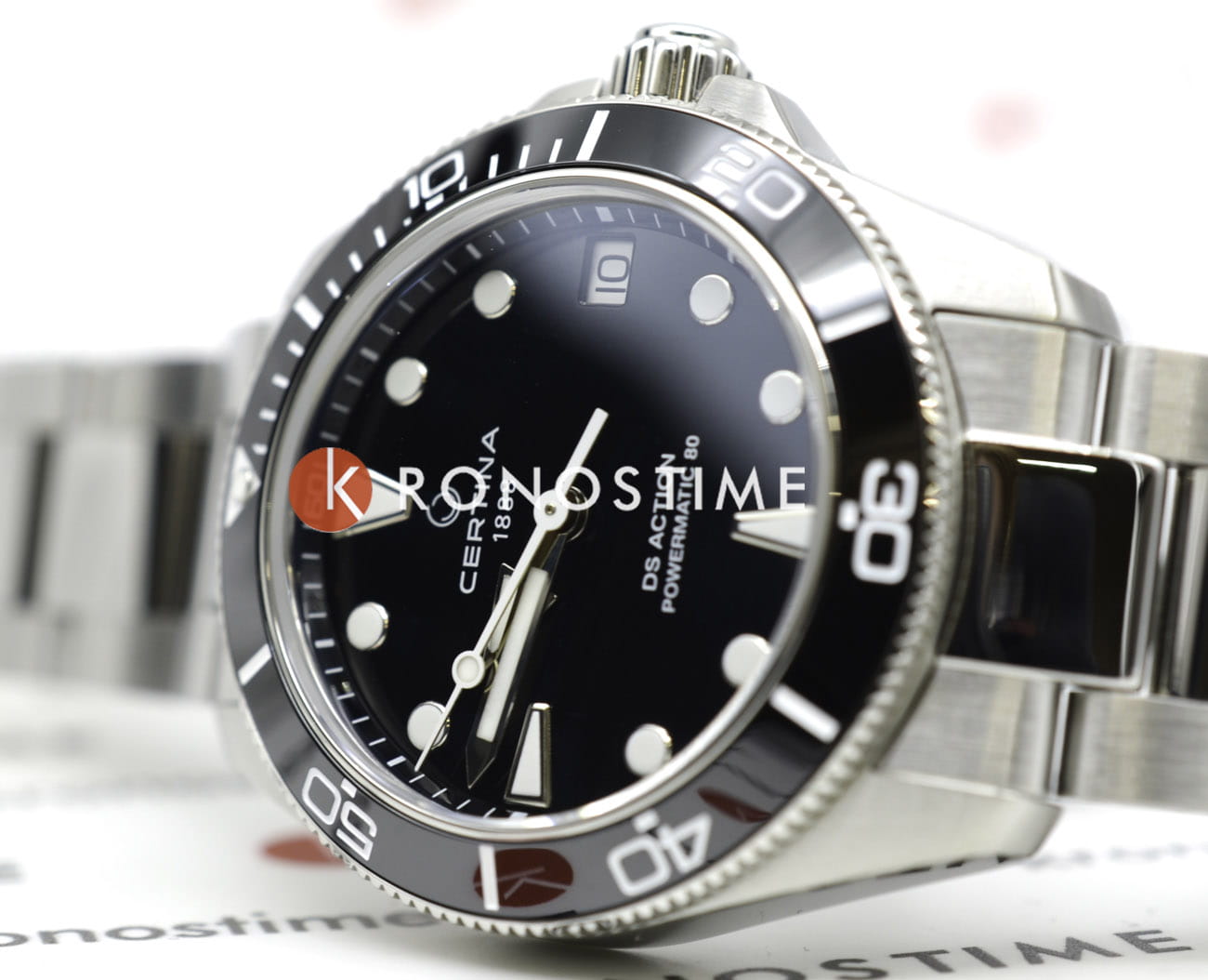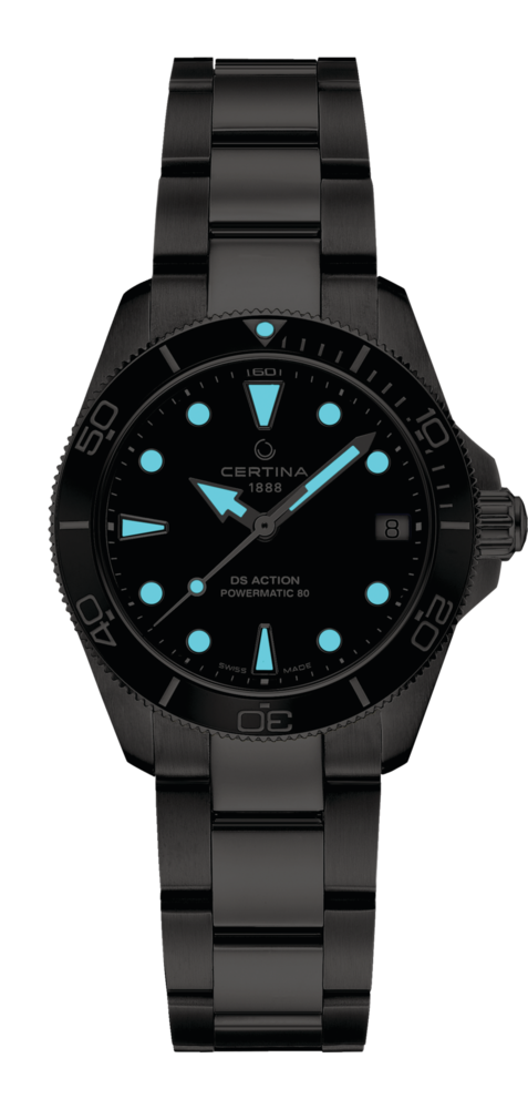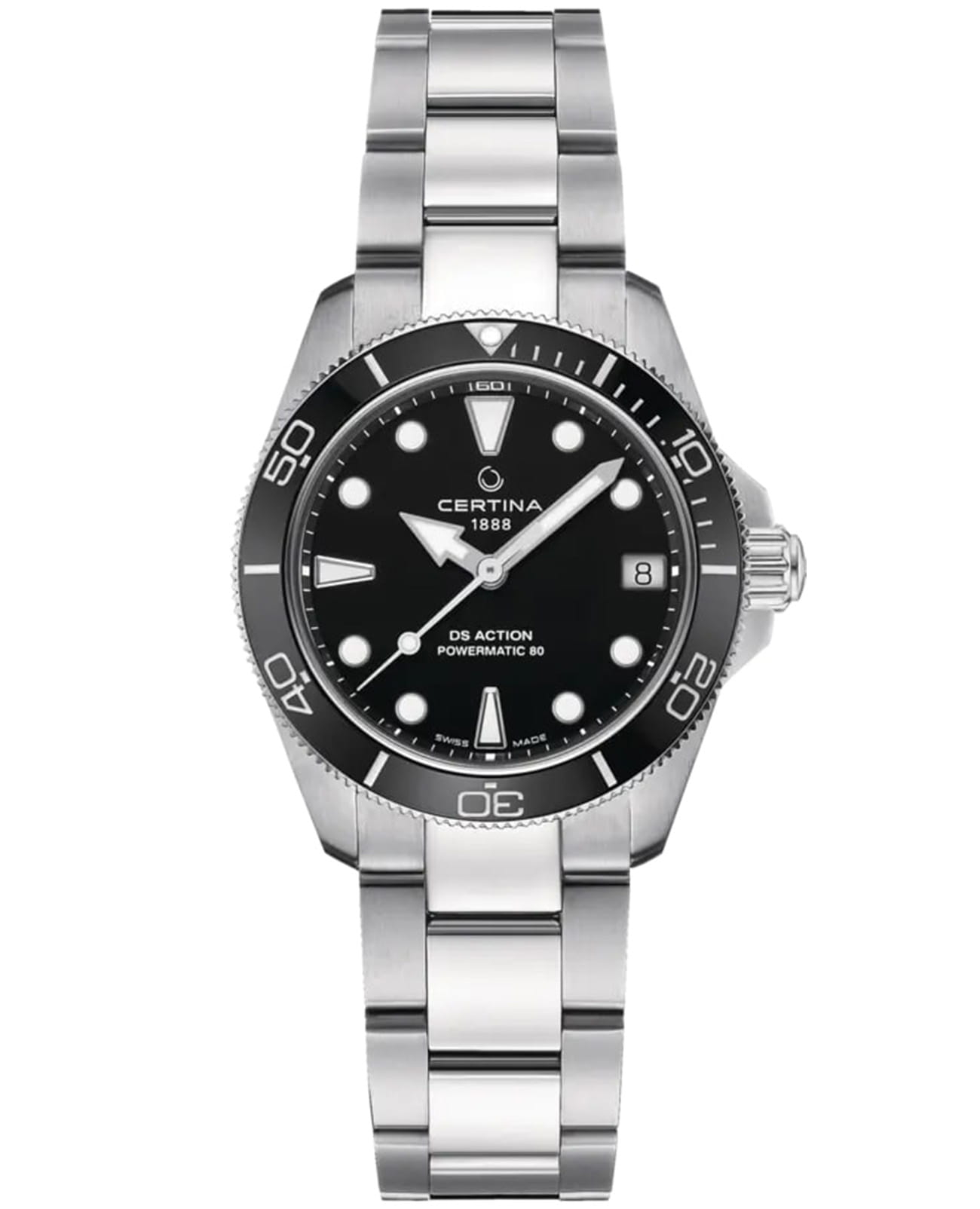 Certina DS Action Lady C032.007.11.051.00 – женские часы для поклонников ярких аксессуаров. И корпус, и браслет изготовлены из высококачественной нержавеющей стали 316L. Под твердым сапфировым стекломСапфировое стеклоПрочный и надёжный материал из кристалла сапфира синтетического происхождения, характеризующийся особой твёрдостью и устойчивостью к царапинам и повреждениям. с антибликовым покрытиемАнтибликовое покрытиеСлой оксида металла в 0,13-0,3 микрон, благодаря которому стекло часов не бликует и не отражает свет. Антибликовое покрытие уменьшает отражение света в 10 раз, обеспечивая отличную читаемость показателей циферблата. находится черный циферблат, на котором вы найдете окошко даты в положении 3 часа и маркировку, покрытую люминесцентным покрытиемЛюминесцентное покрытиеПозволяет считывать показания времени в темноте. Производители наносят на стрелки, часовые индексы, безель или поверхность циферблата светонакопительный состав, дающий холодное свечение. Super-LumiNova. Керамический безельБезельВнешний ободок, закрепляющий стекло. В спортивных часах так называется поворотное кольцо с делениями на циферблате, выполняет роль таймера – замеряет отрезки времени на шкале. Неподвижный безель – элемент декора. Однонаправленно вращающийся безель на дайверских часах позволяет фиксировать моменты погружения и выныривания на поверхность. с минутной шкалой вращается в одном направлении, что позволяет удобно измерять временные отрезки. Все это приводится в действие автоматическим механизмом Powermatic 80Powermatic 80Эксклюзивный калибр от швейцарской компании ETA с увеличенным запасом хода до 80 часов за счёт удлинённой заводной пружины. Характеризуется улучшенной системой спуска со сниженным трением..611 с пружиной Nivachron™Nivachron™Специально разработанный инновационный сплав Nivachron™ повышает устойчивость часов к воздействию магнитных полей.. Класс водозащиты: 300 метров, позволит плавать, нырять и заниматься другими водными видами спорта. Стальной браслет на застёжке-бабочке с кнопкамиЗастёжка "бабочка"Такой вид застёжки дополняется предохранителями, помогающими избежать случайного раскрытия браслета. Обладают изящным исполнением. .