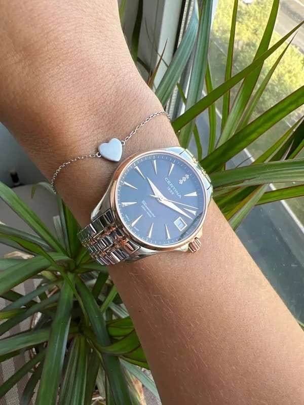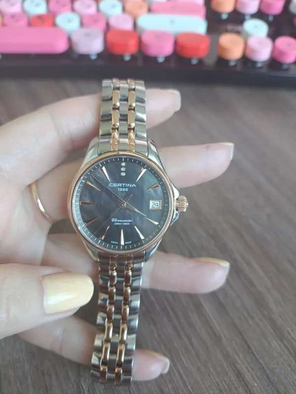 Аксессуар обладает изящным силуэтом, отражающим классический стиль и элегантность. Циферблат украшен 3 роскошными бриллиантами оттенка Top Wesselton. Часы комплектуются высокоточным кварцевым калибром F06.411 от швейцарской компании ETA, высокая точность механизма подтверждается сертификатом хронометра COSCСертификат COSCОфициальный сертификат, подтверждающий то, что часы ходят с особо высокой точностью. Для получения документа часы подвергаются тестовым испытаниям, разработанным швейцарским институтом тестирования хронометров COSC. Допустимая норма для механических часов -4/+6 секунд в день, для кварцевых моделей +/- 0,07 секунд в день.. Концепция DS ConceptDS ConceptDouble Security Concept, обозначает двойную надёжность и безупречную точность часов Certina. Двойная система защиты подразумевает обеспечение максимальной устойчивости к ударам и высоких показателей водонепроницаемости. гарантирует повышенную ударопрочность часов и сохранение водонепроницаемости до 20 бар. Одностороннее антибликовое покрытие сапфирового стекла.Корпус и браслет из хирургической стали 316L. PVD-покрытиеPVDУльтратонкое покрытие наносится в технике вакуумного напыления, сочетает в себе нитрид титана особой прочности со слоем золота или оксида хрома. Несёт в себе декоративную или защитную функцию. цвета розового золота. . Окошко даты, функция EOLEOLПредставляет собой систему, уведомляющую владельца часов о необходимости замены элемента питания. За 2 недели до полного разряда батарейки секундная стрелка перестаёт ходить чётко и начинает перепрыгивать на 3-4 деления.. Диаметр корпуса: 33,8 мм.