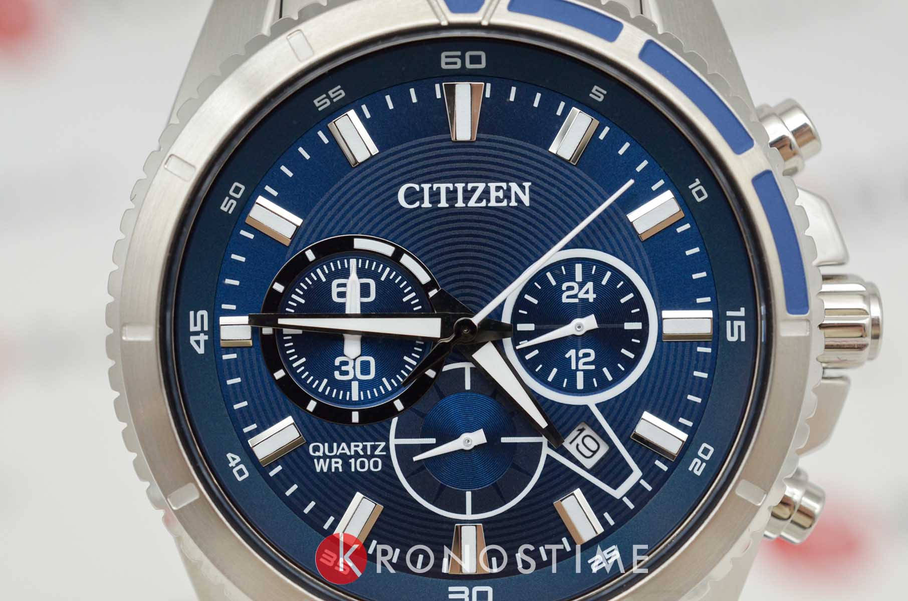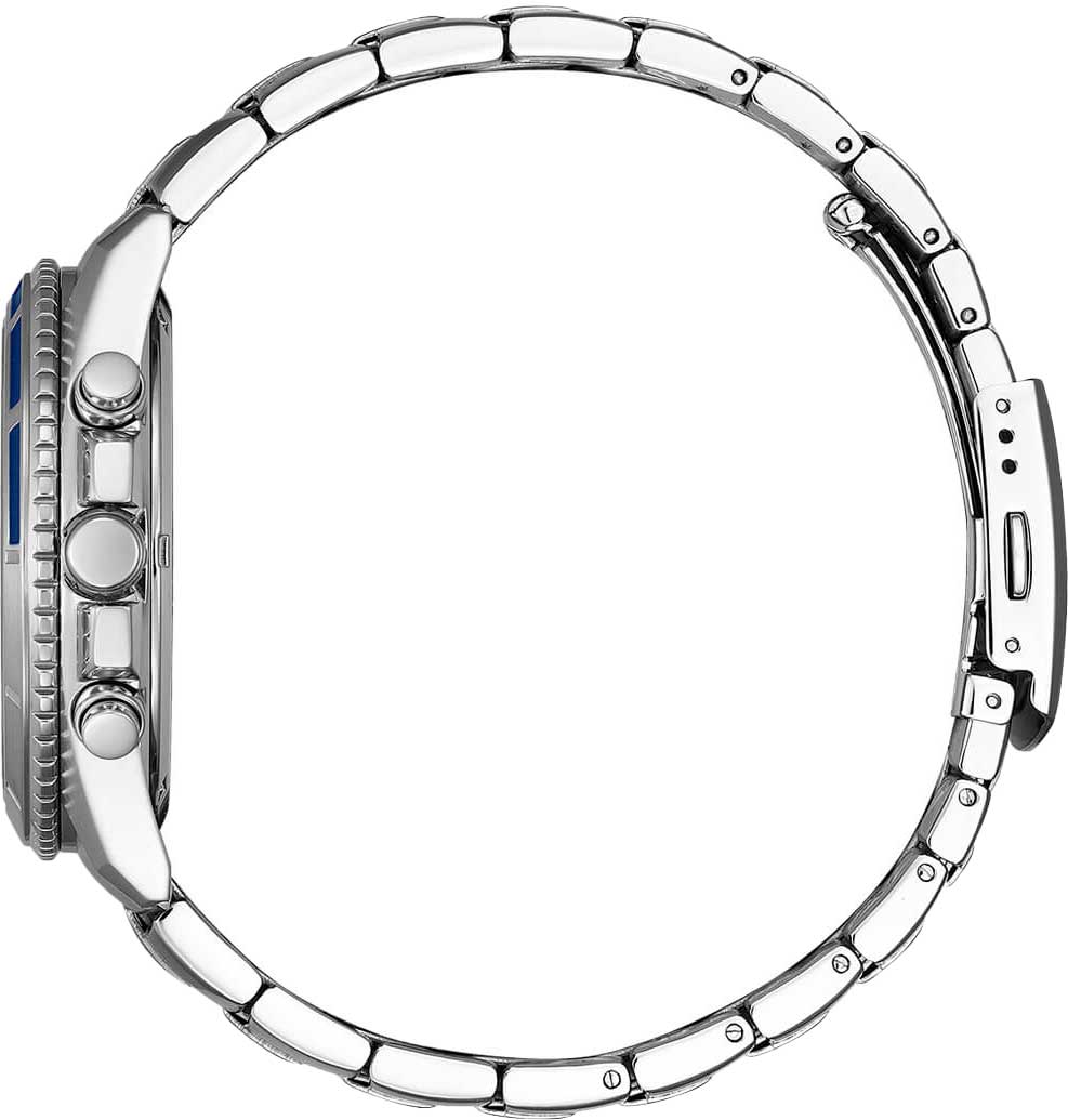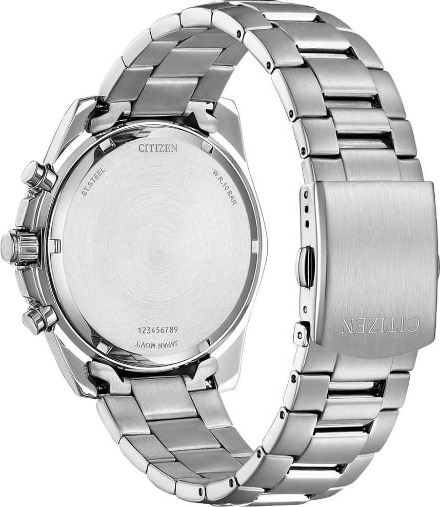 Citizen Chronograph AN8201-57L часы-хронографХронографФункция позволяет измерять отрезки времени с особой точностью: часы, минуты, секунды. Верным признаком хронографа является наличие на циферблате 3 дополнительных окошек-счётчиков. с секундомеромСекундомерСекундоме́р — прибор, способный измерять интервалы времени с точностью до долей секунды.. Корпус из нержавеющей стали диаметром 46,4 мм идеально сбалансирован. Минеральное стеклоМинеральное стеклоМинеральное стекло представляет собой искусственно выращенный минерал кварца. Такое стекло отличается особой устойчивостью к повреждениям и царапинам. Уступает по некоторым качествам сапфировому стеклу. обеспечивает отличную защиту циферблата от царапин. Часы работают на основе кварцевого механизма. Стальной браслет на раскладной застёжкеРаскладная застёжкаТакой тип застёжки используется только на браслетах из металла. Она никогда не раскрывается полностью, происходит разделение на 2 и более частей. Раскладывающая застёжка снизит вероятность потери часов к минимуму. идеально дополняют дизайн часов, обеспечивая комфортное ношение. Секундомер с точностью показаний 1c и временем измерения 60мин. Окошко даты находится между часовыми отметками 4 и 5. 12-ти и 24-х часовой формат времени отображается на отдельном циферблате. Заводная головка с защитой. Часы обладают впечатляющей водонепроницаемостью до 100WR, что делает их идеальными для повседневной носки.