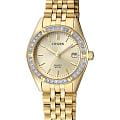 Элегантные часы Citizen EU6062-50P сочетают в себе изысканный дизайн и надежность японского качества. Круглый корпус диаметром 26 мм изготовлен из нержавеющей стали с PVD-покрытиемPVDУльтратонкое покрытие наносится в технике вакуумного напыления, сочетает в себе нитрид титана особой прочности со слоем золота или оксида хрома. Несёт в себе декоративную или защитную функцию. цвета желтого золота и украшен сверкающими кристаллами по безелюБезельВнешний ободок, закрепляющий стекло. В спортивных часах так называется поворотное кольцо с делениями на циферблате, выполняет роль таймера – замеряет отрезки времени на шкале. Неподвижный безель – элемент декора. Однонаправленно вращающийся безель на дайверских часах позволяет фиксировать моменты погружения и выныривания на поверхность., что придает модели утонченный вид. Циферблат цвета шампань дополнен центральными стрелками и апертурой даты на позиции 3 часов. Минеральное стеклоМинеральное стеклоМинеральное стекло представляет собой искусственно выращенный минерал кварца. Такое стекло отличается особой устойчивостью к повреждениям и царапинам. Уступает по некоторым качествам сапфировому стеклу. защищает от мелких повреждений, а стальной браслет с раскладной застёжкойРаскладная застёжкаТакой тип застёжки используется только на браслетах из металла. Она никогда не раскрывается полностью, происходит разделение на 2 и более частей. Раскладывающая застёжка снизит вероятность потери часов к минимуму. обеспечивает комфортную посадку. Стрелки с люминесцентным покрытиемЛюминесцентное покрытиеПозволяет считывать показания времени в темноте. Производители наносят на стрелки, часовые индексы, безель или поверхность циферблата светонакопительный состав, дающий холодное свечение. для отличной читаемости в любое время суток. Благодаря водостойкости WR 50 часы подходят для повседневного ношения, включая мытье рук и дождь.