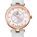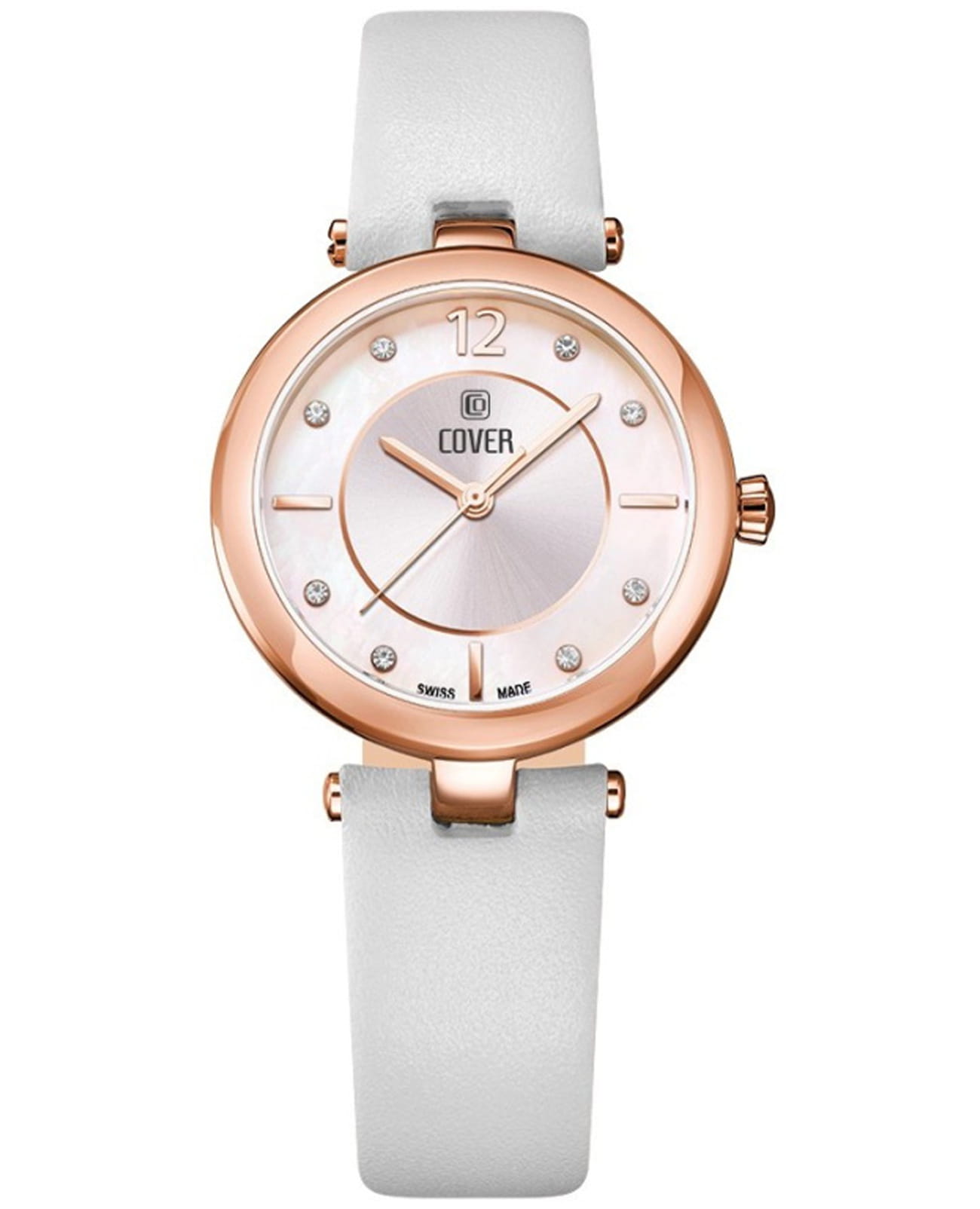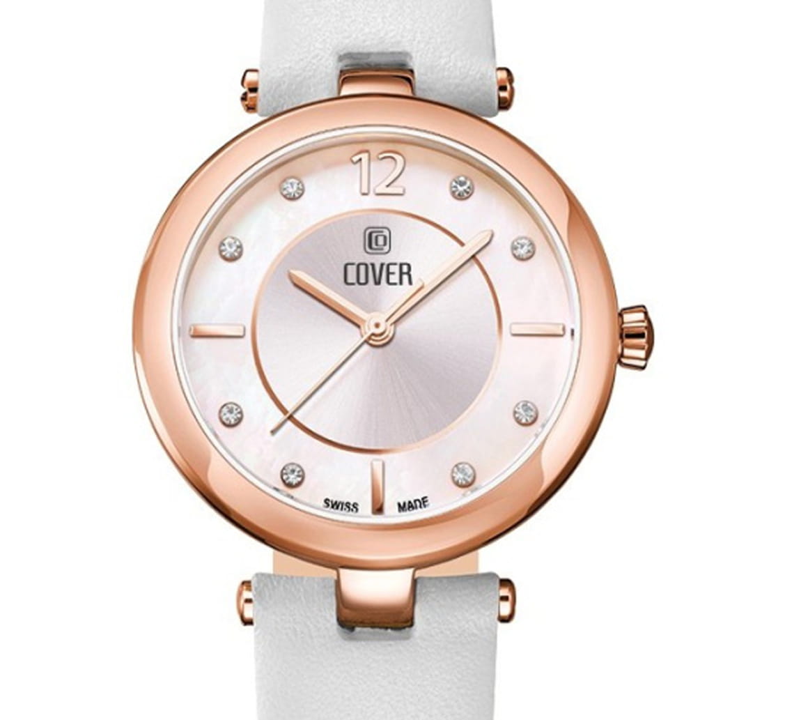 Женственные коктейльные часы COVER CO193.14 из коллекции Amelia работают на кварцевом калибре ETA. Циферблат имеет центральную область серебристого цвета с узором Sunray и белую перламутровую периферийную часть, которые защищены минеральным стекломМинеральное стеклоМинеральное стекло представляет собой искусственно выращенный минерал кварца. Такое стекло отличается особой устойчивостью к повреждениям и царапинам. Уступает по некоторым качествам сапфировому стеклу. с сапфировым напылением. В качестве часовых меток используются 8 кристаллов Swarovski, а также 3 накладных индекса и арабская цифра «12». Корпус 32 мм диаметром выполнен из нержавеющей стали с PVD-покрытиемPVDУльтратонкое покрытие наносится в технике вакуумного напыления, сочетает в себе нитрид титана особой прочности со слоем золота или оксида хрома. Несёт в себе декоративную или защитную функцию. цвета розового золота, с широким полированным безелемБезельВнешний ободок, закрепляющий стекло. В спортивных часах так называется поворотное кольцо с делениями на циферблате, выполняет роль таймера – замеряет отрезки времени на шкале. Неподвижный безель – элемент декора. Однонаправленно вращающийся безель на дайверских часах позволяет фиксировать моменты погружения и выныривания на поверхность.. Часы комплектуются белым кожаным ремешком на стандартной застёжке и имеют маркировку «Swiss Made».