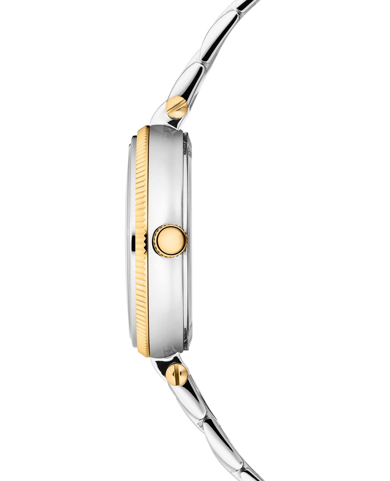 Женские наручные часы Cover CO196.02 из коллекции Fly Me To The Moon соединяют в себе элегантность и функциональность. Модель обладает круглым корпусом диаметром 32 мм, изготовленным из нержавеющей стали с PVDPVDУльтратонкое покрытие наносится в технике вакуумного напыления, сочетает в себе нитрид титана особой прочности со слоем золота или оксида хрома. Несёт в себе декоративную или защитную функцию. покрытием цвета розового золота, что придает изделию благородный вид. Браслет выполнен из нержавеющей стали с биколорным исполнением и оснащен удобной застежкой-бабочкойЗастёжка "бабочка"Такой вид застёжки дополняется предохранителями, помогающими избежать случайного раскрытия браслета. Обладают изящным исполнением. для комфортного ношения. Молочно-белый перламутровый циферблат украшен 11 кристаллами Swarovski, которые выполняют роль часовых индексов, а также имеет круглую апертуру даты на «3 часах» и индикатор фаз Луны на «6 часах». Для защиты циферблата используется минеральное стекло с сапфировым напылением, обеспечивающее высокую устойчивость к царапинам и антибликовый эффект. Часы работают на надежном кварцевом механизме, гарантирующем точное время без необходимости подзаводки. Водонепроницаемость часов достигает 5 атмосфер (50 метров), что позволяет использовать их в повседневной жизни, включая контакт с водой, однако не рекомендуется для плавания или дайвинга. Эти швейцарские часы станут прекрасным дополнением как классического, так и повседневного образа женщины, ценящей стиль и качество.