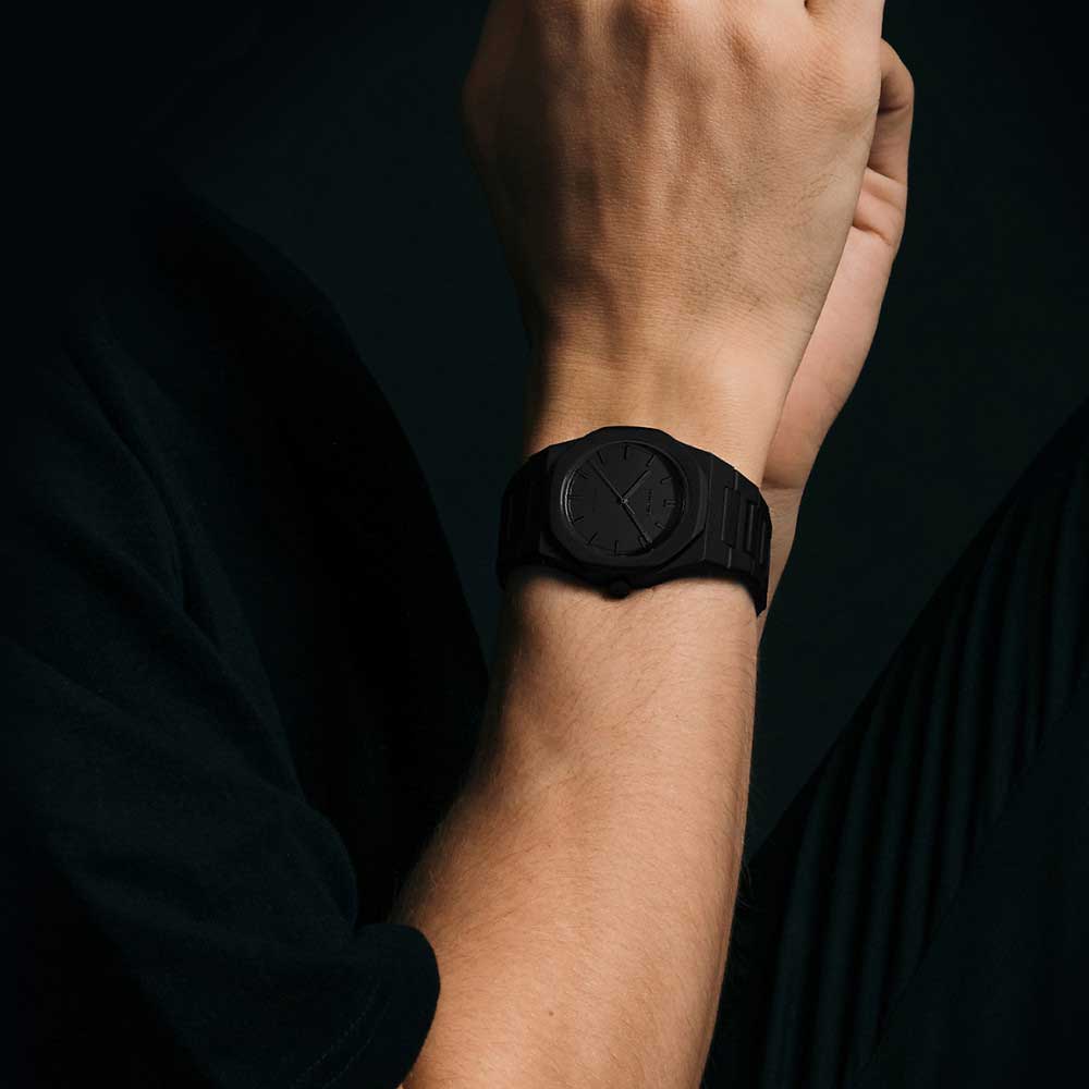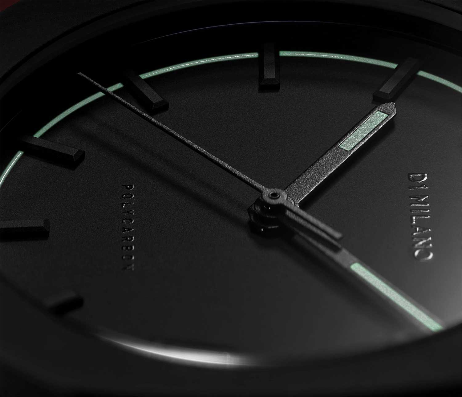 Часы D1 Milano Polycarbon PCBJ10 – молодежные часы в стиле унисекс для повседневных образов. Модель Shadow имеет черный корпус из поликарбоната с покрытием Софт-Тач. Циферблат лаконичный с индексами в виде штрихов, защищен минеральным стекломМинеральное стеклоМинеральное стекло представляет собой искусственно выращенный минерал кварца. Такое стекло отличается особой устойчивостью к повреждениям и царапинам. Уступает по некоторым качествам сапфировому стеклу. с антибликовым покрытием.  Стрелки с люминесцентным покрытиемЛюминесцентное покрытиеПозволяет считывать показания времени в темноте. Производители наносят на стрелки, часовые индексы, безель или поверхность циферблата светонакопительный состав, дающий холодное свечение., светятся в темноте. Стальная задняя крышка на 4 винтах. Пластиковый браслет с раскладной застёжкойРаскладная застёжкаТакой тип застёжки используется только на браслетах из металла. Она никогда не раскрывается полностью, происходит разделение на 2 и более частей. Раскладывающая застёжка снизит вероятность потери часов к минимуму..
