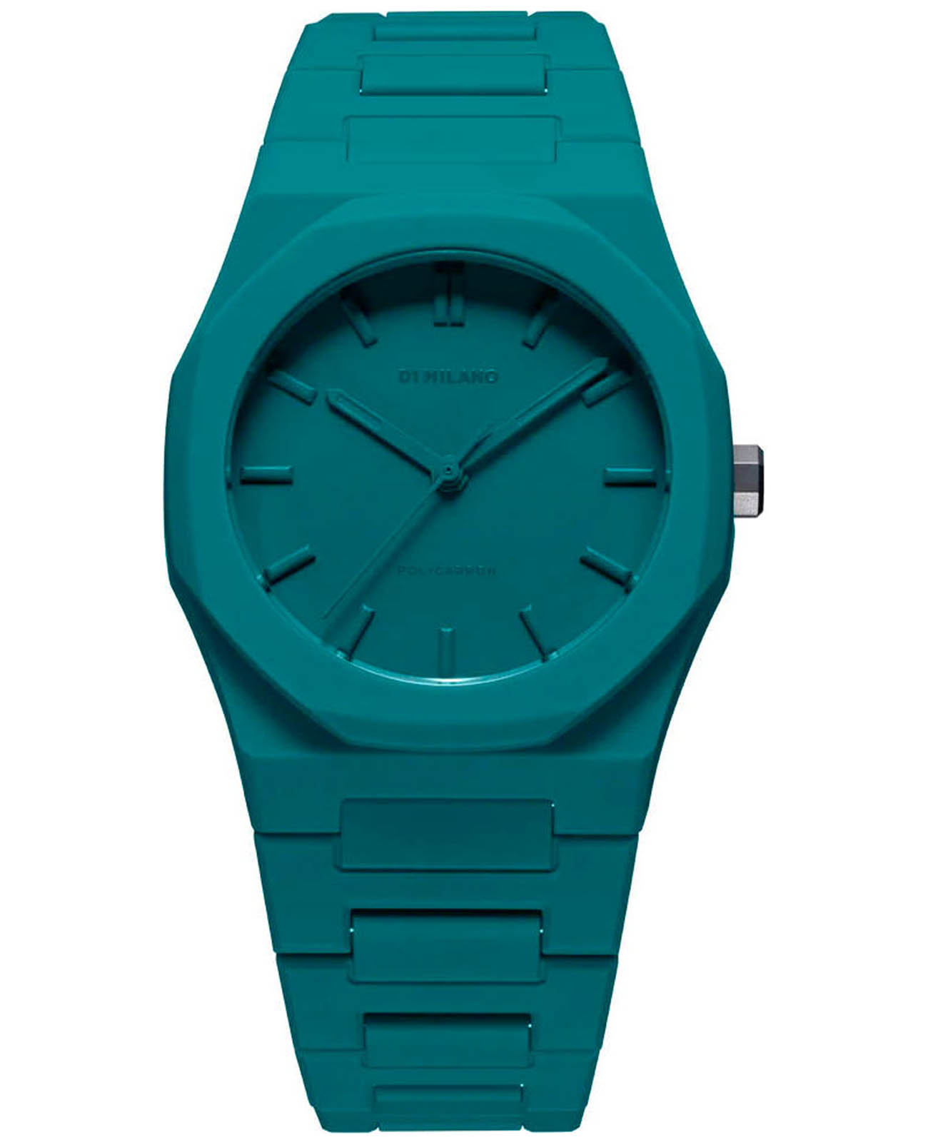 Часы D1 Milano Polycarbon PCBU02 – молодежные часы в стиле унисекс для повседневных образов, стильные и комфортные. Модель Teal имеет зеленый корпус и браслет из поликарбоната с покрытием Софт-Тач. Циферблат лаконичный с индексами в виде штрихов, защищен минеральным стекломМинеральное стеклоМинеральное стекло представляет собой искусственно выращенный минерал кварца. Такое стекло отличается особой устойчивостью к повреждениям и царапинам. Уступает по некоторым качествам сапфировому стеклу. с антибликовым покрытием. Стальная задняя крышка на 4 винтах. Пластиковый браслет на застёжке «бабочка» с кнопкамиЗастёжка "бабочка"Такой вид застёжки дополняется предохранителями, помогающими избежать случайного раскрытия браслета. Обладают изящным исполнением. .