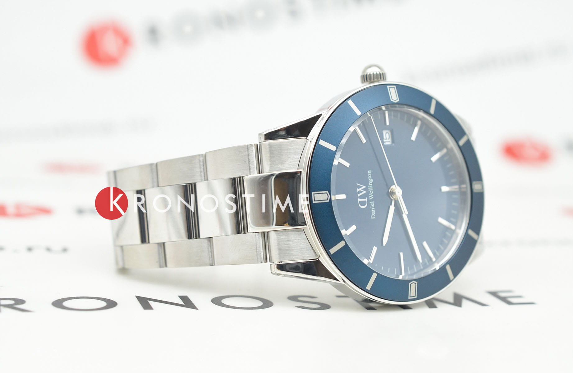Daniel Wellington — мужские часы в современном спортивно-элегантном стиле. Круглый корпус диаметром 40 мм изготовлен из нержавеющей стали и дополнен синим безелемБезельВнешний ободок, закрепляющий стекло. В спортивных часах так называется поворотное кольцо с делениями на циферблате, выполняет роль таймера – замеряет отрезки времени на шкале. Неподвижный безель – элемент декора. Однонаправленно вращающийся безель на дайверских часах позволяет фиксировать моменты погружения и выныривания на поверхность. из анодированного алюминия, которое придаёт модели выразительный характер.