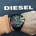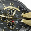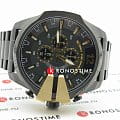 Футуристический циферблат, напоминающий приборную панель гоночного автомобиля, имеет золотистые детали оформления. Стальной корпус и браслет имеют чёрное PVD-покрытиеPVDУльтратонкое покрытие наносится в технике вакуумного напыления, сочетает в себе нитрид титана особой прочности со слоем золота или оксида хрома. Несёт в себе декоративную или защитную функцию., защищающее от царапин.. Высокоточный кварцевый механизм. Люминесцентная подсветкаЛюминесцентное покрытиеПозволяет считывать показания времени в темноте. Производители наносят на стрелки, часовые индексы, безель или поверхность циферблата светонакопительный состав, дающий холодное свечение.. Минеральное стекло. Заводная головка с защитой. Водостойкость до 100 метров. ХронографХронографФункция позволяет измерять отрезки времени с особой точностью: часы, минуты, секунды. Верным признаком хронографа является наличие на циферблате 3 дополнительных окошек-счётчиков., секундомер, отображение даты. Габариты: 55 x 51 x 14 мм.