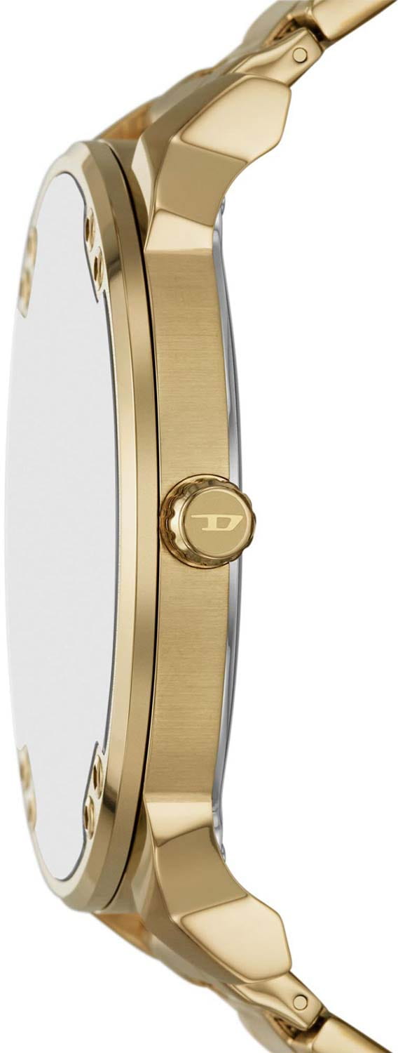 Мужские кварцевые часы Diesel Mr. Daddy 2.0 DZ7490 — это многофункциональный аксессуар, сочетающий в себе стиль и технические возможности. Модель оснащена хронографомХронографФункция позволяет измерять отрезки времени с особой точностью: часы, минуты, секунды. Верным признаком хронографа является наличие на циферблате 3 дополнительных окошек-счётчиков. с секундомеромСекундомерСекундоме́р — прибор, способный измерять интервалы времени с точностью до долей секунды., что делает её удобной для измерения времени с высокой точностью. Циферблат золотистого цвета, а его дизайн включает штриховые метки, а также окошко даты в положении 3 часов. Защиту циферблата обеспечивает Минеральное стеклоМинеральное стеклоМинеральное стекло представляет собой искусственно выращенный минерал кварца. Такое стекло отличается особой устойчивостью к повреждениям и царапинам. Уступает по некоторым качествам сапфировому стеклу., устойчивое к мелким повреждениям. Корпус диаметром 54 мм выполнен из стали с золотым PVD-покрытиемPVDУльтратонкое покрытие наносится в технике вакуумного напыления, сочетает в себе нитрид титана особой прочности со слоем золота или оксида хрома. Несёт в себе декоративную или защитную функцию., включающим матовые и полированные детали. Стальной браслет с золотым PVD-покрытиемPVDУльтратонкое покрытие наносится в технике вакуумного напыления, сочетает в себе нитрид титана особой прочности со слоем золота или оксида хрома. Несёт в себе декоративную или защитную функцию. оснащён раскладной застёжкойРаскладная застёжкаТакой тип застёжки используется только на браслетах из металла. Она никогда не раскрывается полностью, происходит разделение на 2 и более частей. Раскладывающая застёжка снизит вероятность потери часов к минимуму. с двумя кнопками, обеспечивающей комфорт и надёжную фиксацию на запястье. Водонепроницаемость 30WR позволяет использовать модель при мытье рук или под лёгким дождём. Эти часы станут универсальным аксессуаром для тех, кто ценит сочетание функциональности, эстетики и надёжности — идеальный выбор для повседневного использования и активного образа жизни.