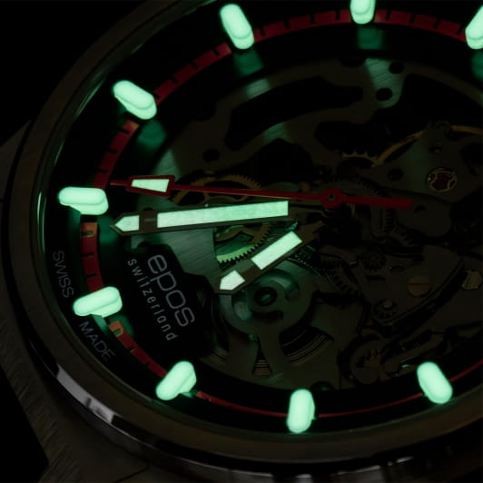 Мужские механические часы с автоподзаводом Epos из коллекции Sportive — это стильный и технологичный аксессуар с швейцарским качеством. Корпус диаметром 41 мм и толщиной 11 мм выполнен из нержавеющей стали 316L. Циферблат чёрного цвета с красными и серыми акцентами частично скелетонизирован, что позволяет наблюдать за работой механизма. Циферблат защищён сапфировым стекломСапфировое стеклоПрочный и надёжный материал из кристалла сапфира синтетического происхождения, характеризующийся особой твёрдостью и устойчивостью к царапинам и повреждениям.. Механизм — швейцарский калибр Sellita SW200 с запасом хода 38 часов. Завинчивающаяся коронка обеспечивает дополнительную защиту. Прозрачная задняя крышка открывает вид на декорированный механизм. Часы оснащены стальным браслетом на раскладной застёжкеРаскладная застёжкаТакой тип застёжки используется только на браслетах из металла. Она никогда не раскрывается полностью, происходит разделение на 2 и более частей. Раскладывающая застёжка снизит вероятность потери часов к минимуму.. Водонепроницаемость 100 м позволяет использовать часы для плавания и повседневного ношения. Гарантия — 24 месяца. Универсальный выбор для ценителя механики и современного дизайна.