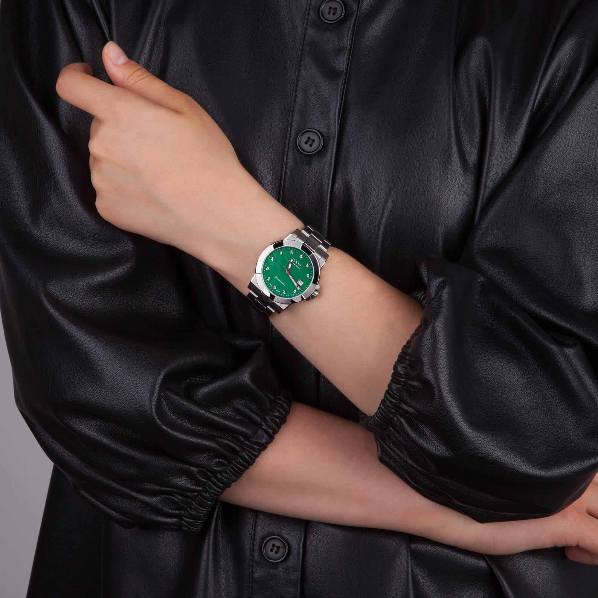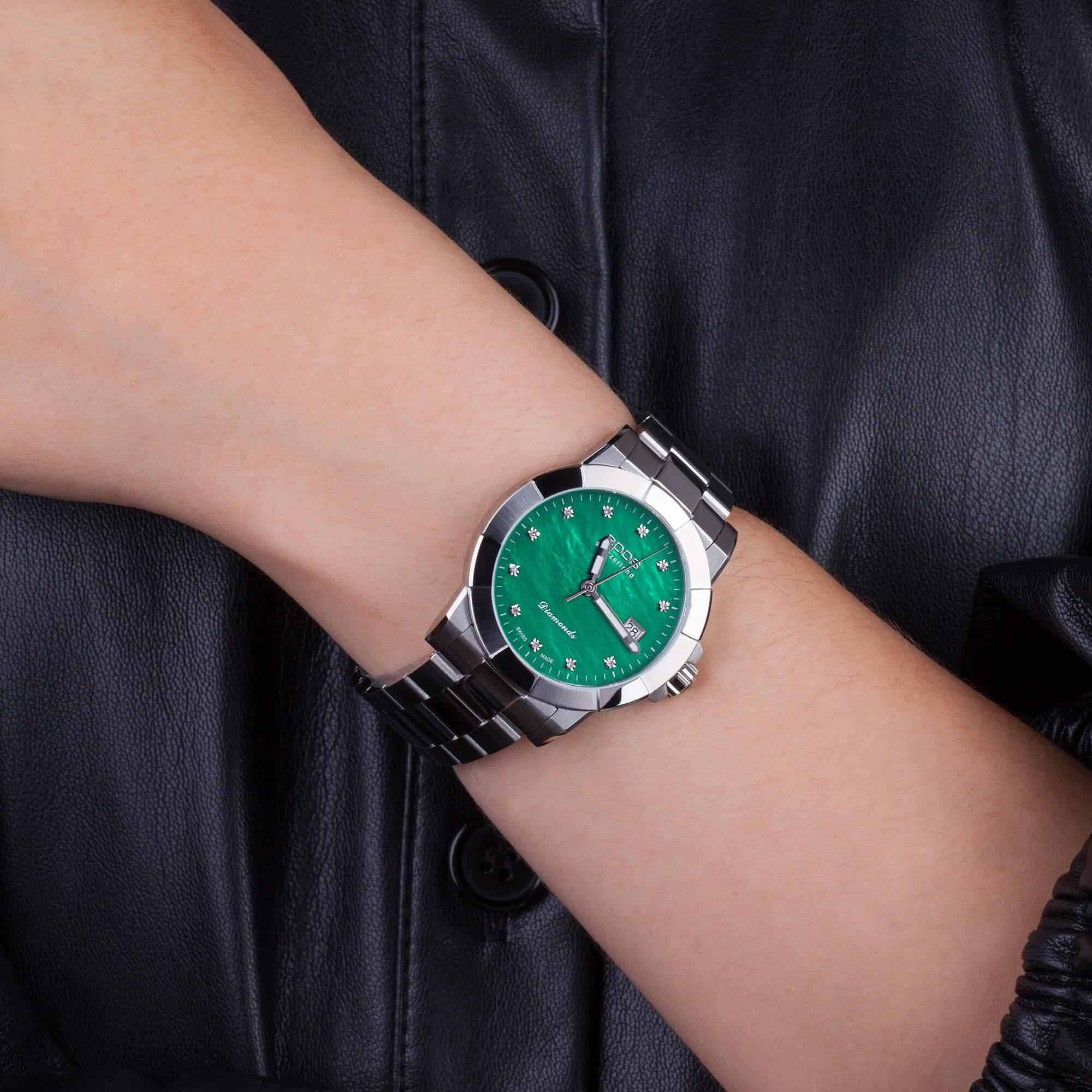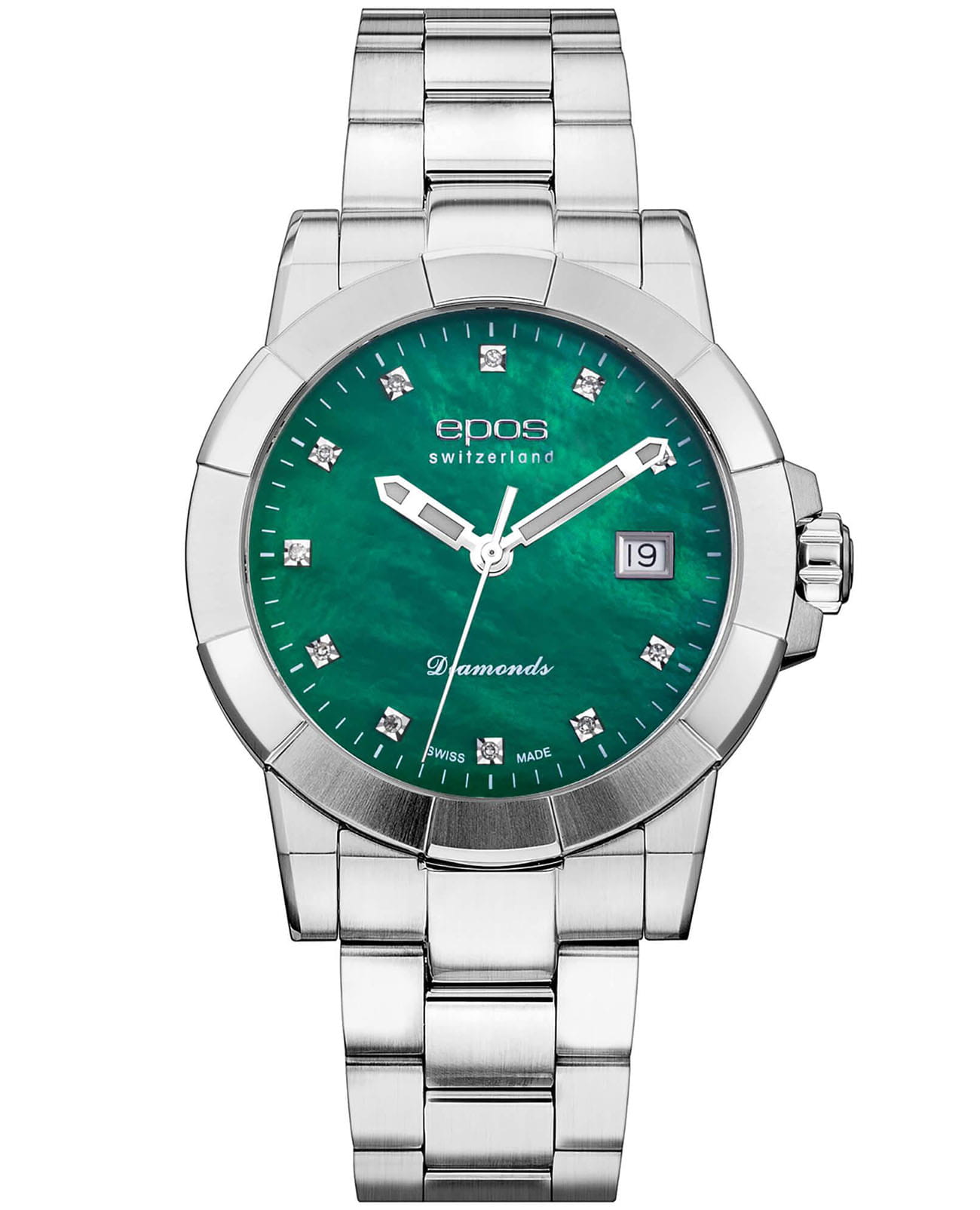 Женские кварцевые часы Epos из коллекции Ladies Diamonds — это элегантный аксессуар, сочетающий швейцарское качество и изысканный дизайн. Корпус диаметром 36 мм и толщиной 9 мм выполнен из нержавеющей стали 316L с PVD-покрытиемPVDУльтратонкое покрытие наносится в технике вакуумного напыления, сочетает в себе нитрид титана особой прочности со слоем золота или оксида хрома. Несёт в себе декоративную или защитную функцию.. Циферблат с перламутровой вставкой зелёного оттенка выполнен по технологии «солнечные лучи» и украшен бриллиантами. Циферблат защищён сапфировым стекломСапфировое стеклоПрочный и надёжный материал из кристалла сапфира синтетического происхождения, характеризующийся особой твёрдостью и устойчивостью к царапинам и повреждениям.. Метки в виде точек также инкрустированы бриллиантами. Окошко даты расположено в положении 3 часов. Механизм — швейцарский кварцевый калибр Ronda 705. Часы оснащены стальным браслетом на раскладной застёжкеРаскладная застёжкаТакой тип застёжки используется только на браслетах из металла. Она никогда не раскрывается полностью, происходит разделение на 2 и более частей. Раскладывающая застёжка снизит вероятность потери часов к минимуму.. Водонепроницаемость 50 м позволяет использовать часы в повседневных условиях. Гарантия — 24 месяца. Идеальный выбор для тех, кто ценит роскошь, стиль и точность.