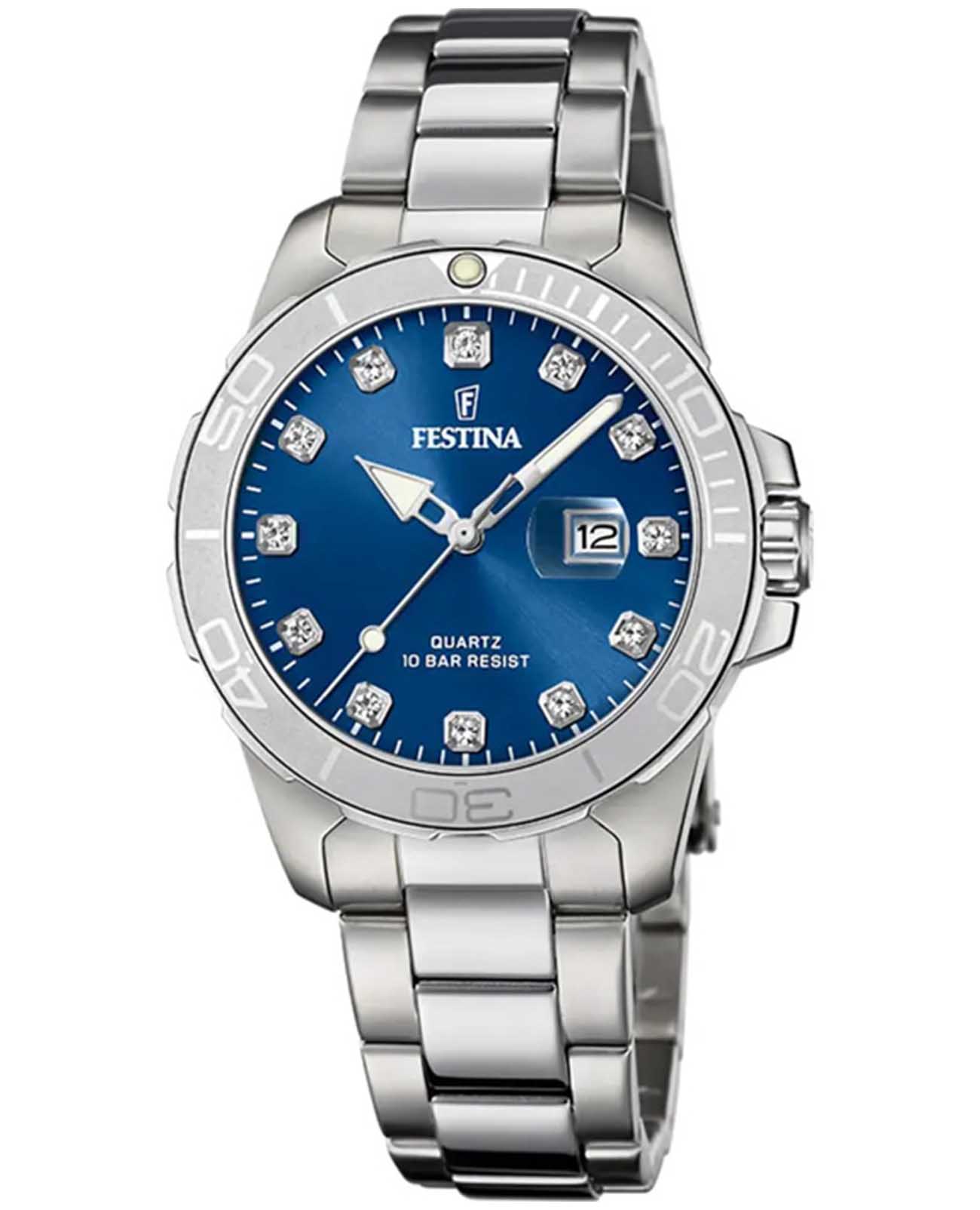 Наручные часы Festina F20503/6 — это стильный аксессуар, сочетающий в себе элегантный дизайн и современные технологии. Кварцевый механизм обеспечивает высокую точность хода, не требуя частой подзаводки. Минеральное стеклоМинеральное стеклоМинеральное стекло представляет собой искусственно выращенный минерал кварца. Такое стекло отличается особой устойчивостью к повреждениям и царапинам. Уступает по некоторым качествам сапфировому стеклу. защищает циферблат от царапин и отличается отличной прозрачностью. Стрелки с люминесцентным покрытиемЛюминесцентное покрытиеПозволяет считывать показания времени в темноте. Производители наносят на стрелки, часовые индексы, безель или поверхность циферблата светонакопительный состав, дающий холодное свечение. позволяют легко считывать время даже в темноте. Циферблат украшен сияющими фианитами, придающими часам изысканный вид. Окошко даты выделяется увеличительным стеклом, что облегчает чтение информации. Водозащита до 100 метров позволяет плавать и заниматься спортом. Поворотный безельБезельВнешний ободок, закрепляющий стекло. В спортивных часах так называется поворотное кольцо с делениями на циферблате, выполняет роль таймера – замеряет отрезки времени на шкале. Неподвижный безель – элемент декора. Однонаправленно вращающийся безель на дайверских часах позволяет фиксировать моменты погружения и выныривания на поверхность. и корпус из нержавеющей стали обеспечивают долговечность. Браслет с раскладной застёжкойРаскладная застёжкаТакой тип застёжки используется только на браслетах из металла. Она никогда не раскрывается полностью, происходит разделение на 2 и более частей. Раскладывающая застёжка снизит вероятность потери часов к минимуму. и системой блокировки гарантирует удобство и безопасность при ношении.
