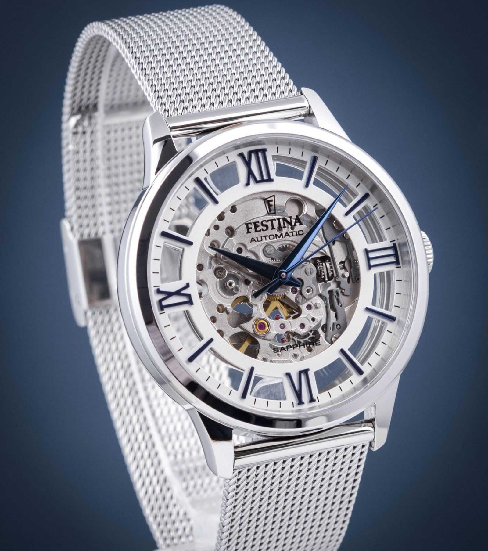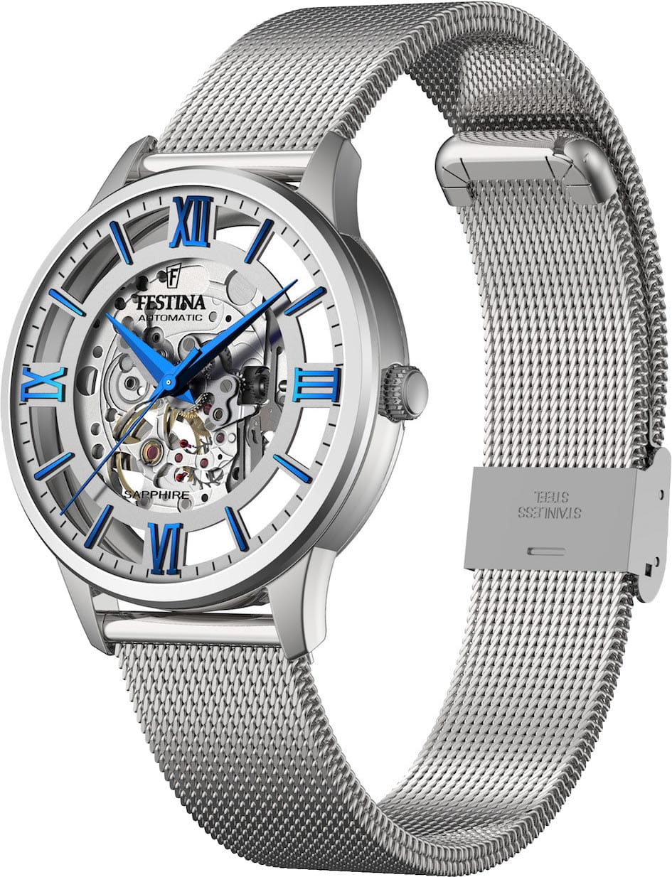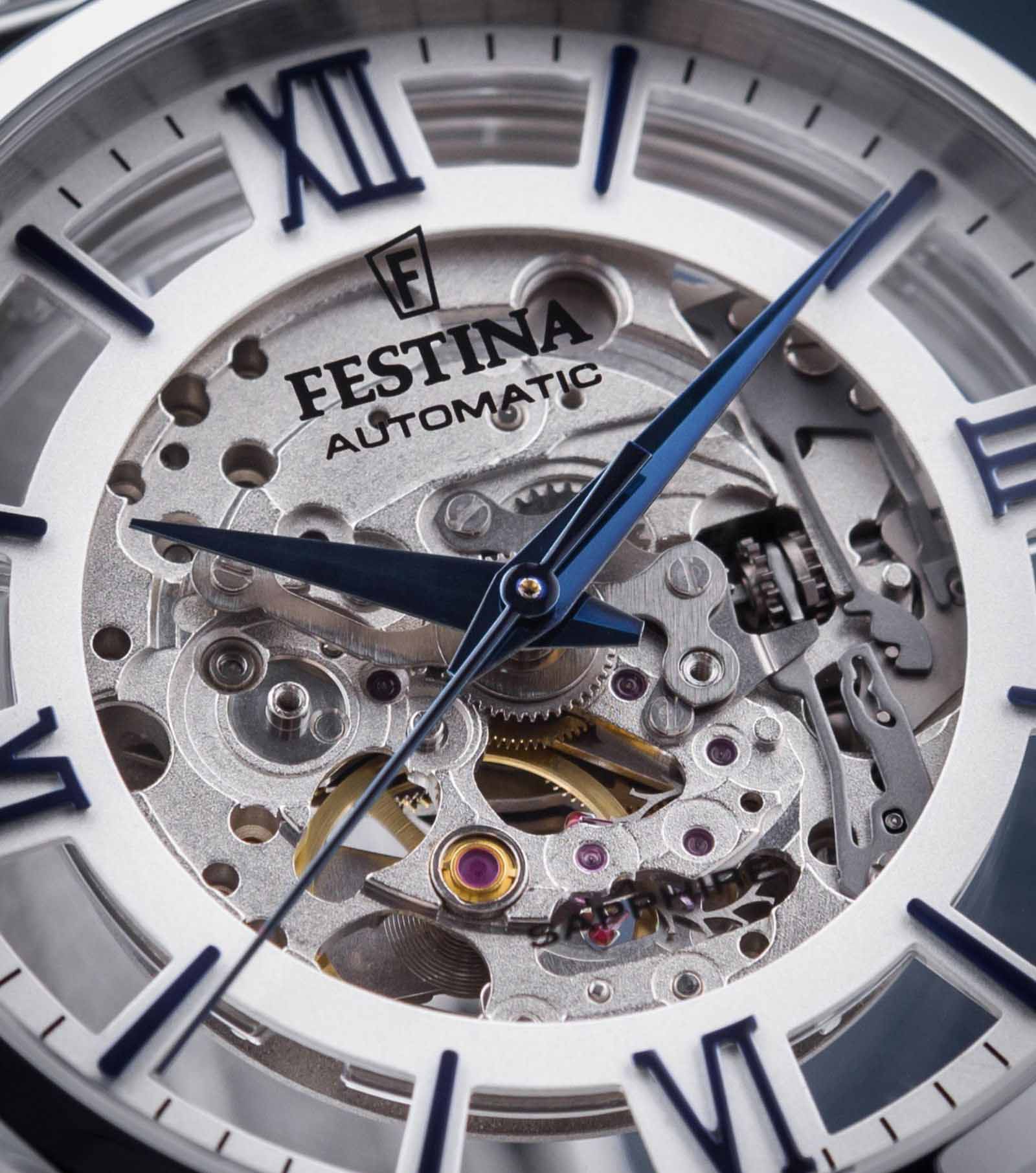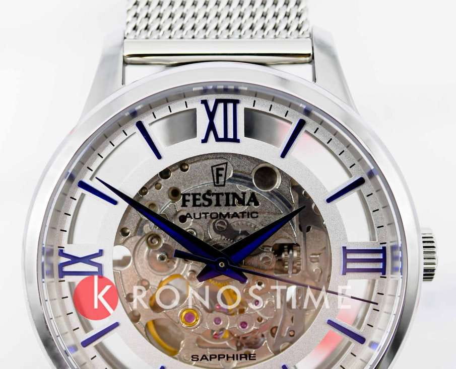 Мужские механические часы-скелетоны Festina Automatic F20534/1, механический механизм (автоматический калибр) с высокой точностью. Сапфировое стеклоСапфировое стеклоПрочный и надёжный материал из кристалла сапфира синтетического происхождения, характеризующийся особой твёрдостью и устойчивостью к царапинам и повреждениям. устойчивое к появлению царапин, обладающее высокой прозрачностью. Класс водозащиты: 50 метров, позволит защитить корпус от случайных брызг или капель дождя. Корпус часов изготовлен из стали. Стальной браслет на раскладной застёжкеРаскладная застёжкаТакой тип застёжки используется только на браслетах из металла. Она никогда не раскрывается полностью, происходит разделение на 2 и более частей. Раскладывающая застёжка снизит вероятность потери часов к минимуму.. В механизме 21 камень. Циферблат с метками в виде штрихов и римских цифр.