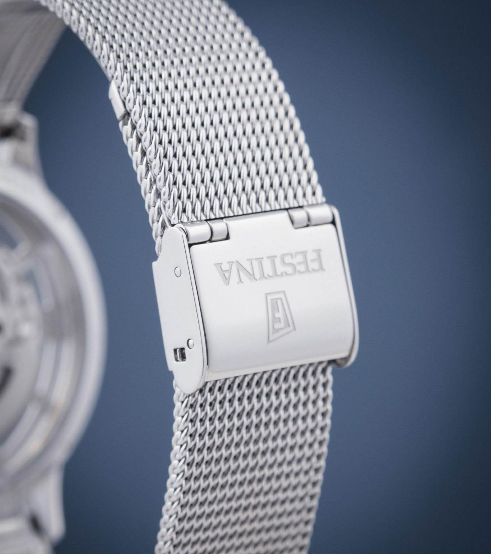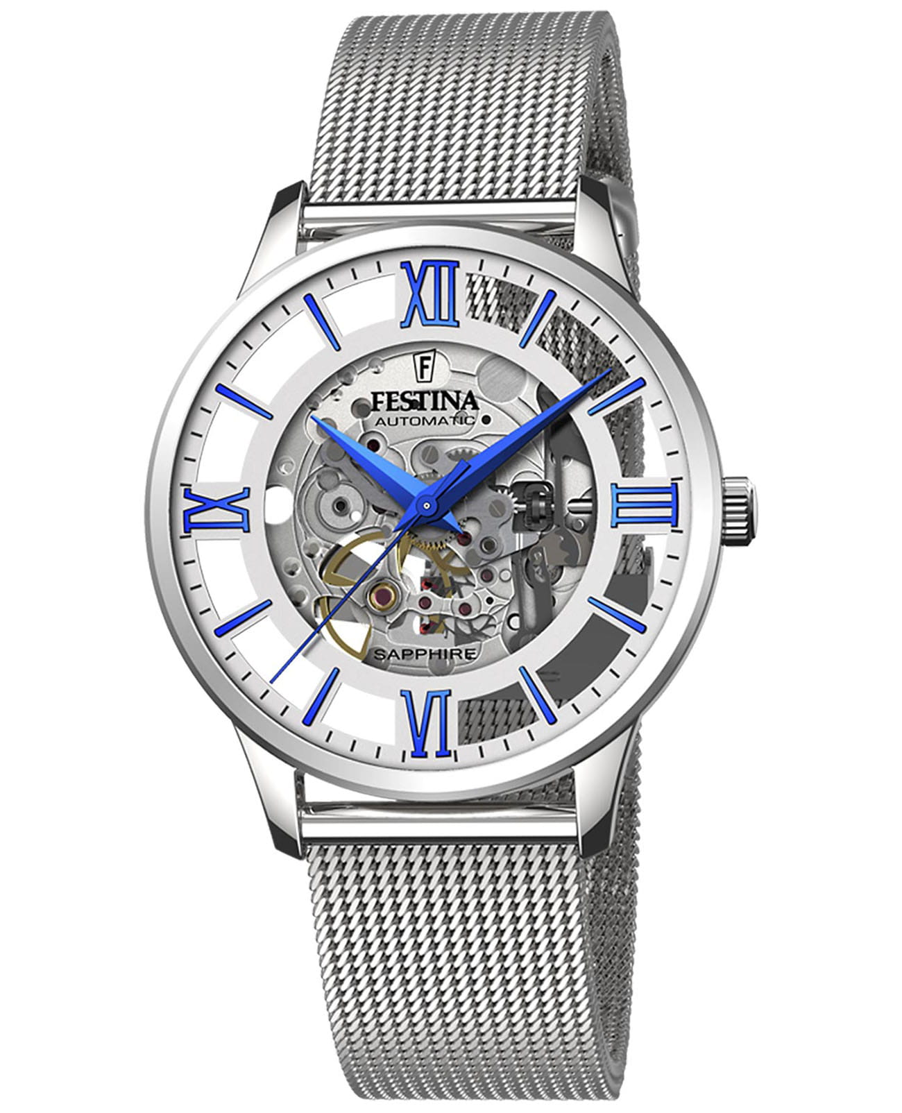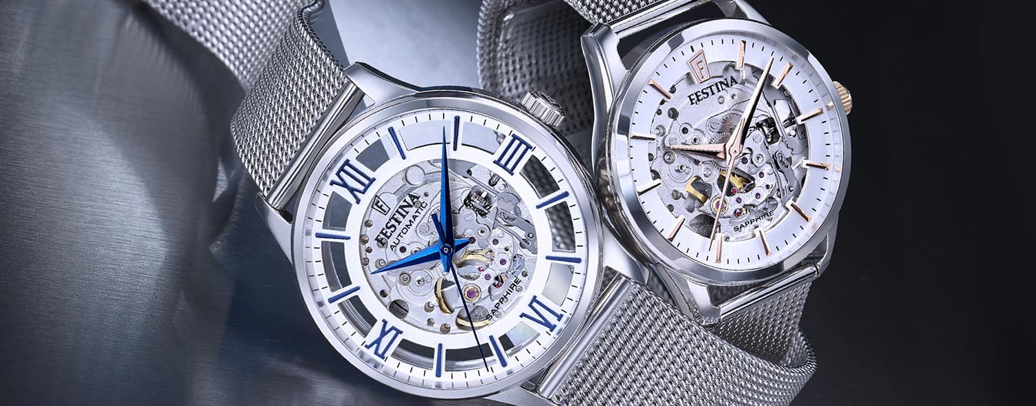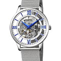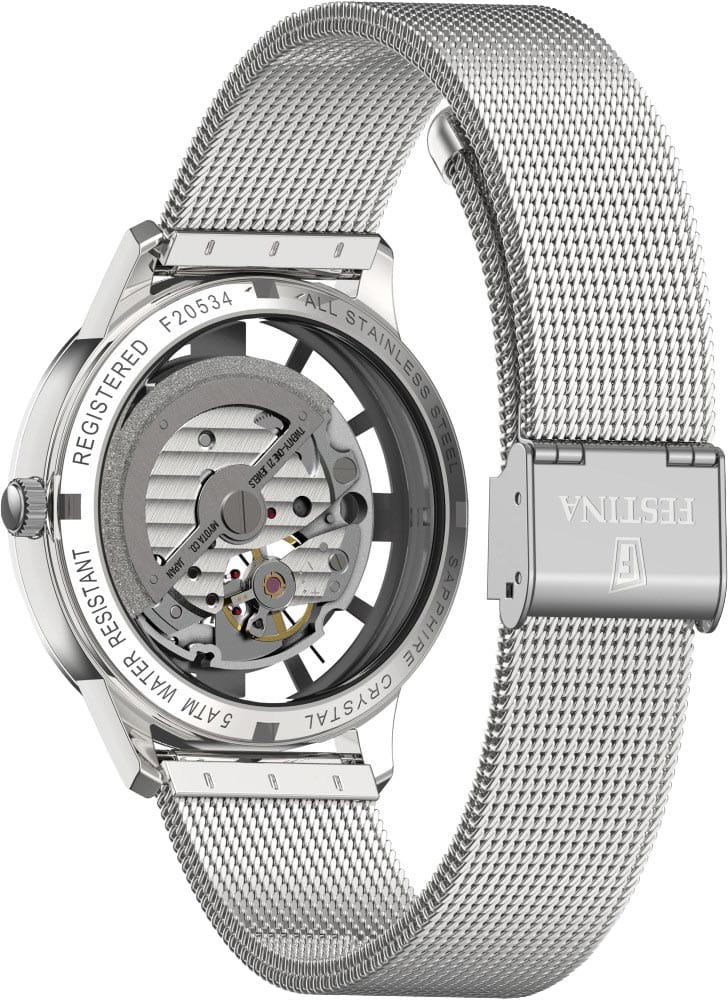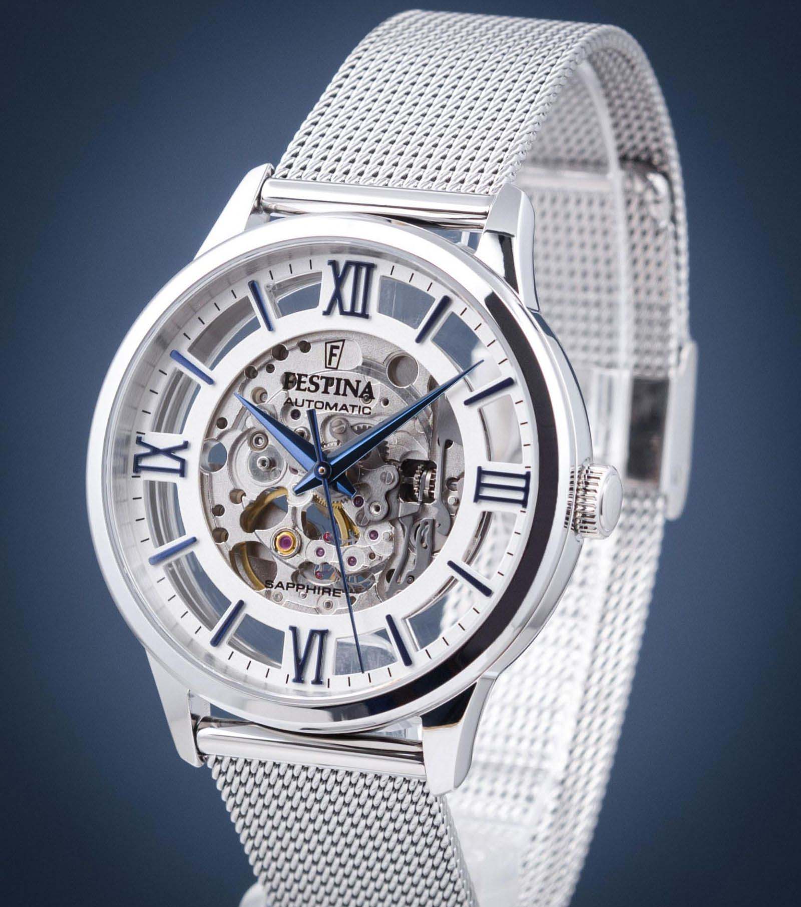 Мужские механические часы-скелетоны Festina Automatic F20534/1, механический механизм (автоматический калибр) с высокой точностью. Сапфировое стеклоСапфировое стеклоПрочный и надёжный материал из кристалла сапфира синтетического происхождения, характеризующийся особой твёрдостью и устойчивостью к царапинам и повреждениям. устойчивое к появлению царапин, обладающее высокой прозрачностью. Класс водозащиты: 50 метров, позволит защитить корпус от случайных брызг или капель дождя. Корпус часов изготовлен из стали. Стальной браслет на раскладной застёжкеРаскладная застёжкаТакой тип застёжки используется только на браслетах из металла. Она никогда не раскрывается полностью, происходит разделение на 2 и более частей. Раскладывающая застёжка снизит вероятность потери часов к минимуму.. В механизме 21 камень. Циферблат с метками в виде штрихов и римских цифр.