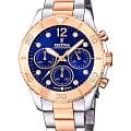 Часы Festina Boyfriend F20605/3 — элегантная модель хронографаХронографФункция позволяет измерять отрезки времени с особой точностью: часы, минуты, секунды. Верным признаком хронографа является наличие на циферблате 3 дополнительных окошек-счётчиков. с секундомеромСекундомерСекундоме́р — прибор, способный измерять интервалы времени с точностью до долей секунды., сочетающая стиль и функциональность. Минеральное стеклоМинеральное стеклоМинеральное стекло представляет собой искусственно выращенный минерал кварца. Такое стекло отличается особой устойчивостью к повреждениям и царапинам. Уступает по некоторым качествам сапфировому стеклу. устойчивое к появлению царапин, обладающее высокой прозрачностью. Корпус диаметром 39 мм выполнен из нержавеющей стали. Циферблат выполнен по технологии Sunray (солнечные лучи). Метки в виде точек, инкрустированных фианитами, и арабской цифры 12. Вращающийся безельБезельВнешний ободок, закрепляющий стекло. В спортивных часах так называется поворотное кольцо с делениями на циферблате, выполняет роль таймера – замеряет отрезки времени на шкале. Неподвижный безель – элемент декора. Однонаправленно вращающийся безель на дайверских часах позволяет фиксировать моменты погружения и выныривания на поверхность. с PVD-покрытиемPVDУльтратонкое покрытие наносится в технике вакуумного напыления, сочетает в себе нитрид титана особой прочности со слоем золота или оксида хрома. Несёт в себе декоративную или защитную функцию.. Браслет с частичным PVDPVDУльтратонкое покрытие наносится в технике вакуумного напыления, сочетает в себе нитрид титана особой прочности со слоем золота или оксида хрома. Несёт в себе декоративную или защитную функцию. покрытием и с раскладной застёжкойРаскладная застёжкаТакой тип застёжки используется только на браслетах из металла. Она никогда не раскрывается полностью, происходит разделение на 2 и более частей. Раскладывающая застёжка снизит вероятность потери часов к минимуму. обеспечивает комфортное ношение. Класс водозащиты: 100 метров, позволит плавать, нырять и заниматься другими водными видами спорта. Эти часы подчёркивают изысканный вкус своей обладательницы, идеально подходя для повседневного ношения и особых случаев.