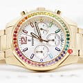 Яркий стиль и функциональность этих часов придутся по душе активной девушке. Часы-хронографХронографФункция позволяет измерять отрезки времени с особой точностью: часы, минуты, секунды. Верным признаком хронографа является наличие на циферблате 3 дополнительных окошек-счётчиков.. Кварцевый механизм с высокой точностью. Минеральное стеклоМинеральное стеклоМинеральное стекло представляет собой искусственно выращенный минерал кварца. Такое стекло отличается особой устойчивостью к повреждениям и царапинам. Уступает по некоторым качествам сапфировому стеклу. устойчивое к появлению царапин, обладающее высокой прозрачностью. Перламутровый циферблат. Стрелки и метки с люминесцентным покрытиемЛюминесцентное покрытиеПозволяет считывать показания времени в темноте. Производители наносят на стрелки, часовые индексы, безель или поверхность циферблата светонакопительный состав, дающий холодное свечение.. БезельБезельВнешний ободок, закрепляющий стекло. В спортивных часах так называется поворотное кольцо с делениями на циферблате, выполняет роль таймера – замеряет отрезки времени на шкале. Неподвижный безель – элемент декора. Однонаправленно вращающийся безель на дайверских часах позволяет фиксировать моменты погружения и выныривания на поверхность. с PVD-покрытиемPVDУльтратонкое покрытие наносится в технике вакуумного напыления, сочетает в себе нитрид титана особой прочности со слоем золота или оксида хрома. Несёт в себе декоративную или защитную функцию. украшенный цветными цирконами. Класс водозащиты: 100 метров, позволит плавать, нырять и заниматься другими водными видами спорта. Корпус часов изготовлен из нержавеющей стали с PVD-покрытиемPVDУльтратонкое покрытие наносится в технике вакуумного напыления, сочетает в себе нитрид титана особой прочности со слоем золота или оксида хрома. Несёт в себе декоративную или защитную функцию.. Браслет с PVD-покрытиемPVDУльтратонкое покрытие наносится в технике вакуумного напыления, сочетает в себе нитрид титана особой прочности со слоем золота или оксида хрома. Несёт в себе декоративную или защитную функцию. и с раскладной застёжкойРаскладная застёжкаТакой тип застёжки используется только на браслетах из металла. Она никогда не раскрывается полностью, происходит разделение на 2 и более частей. Раскладывающая застёжка снизит вероятность потери часов к минимуму..