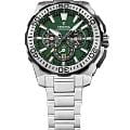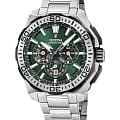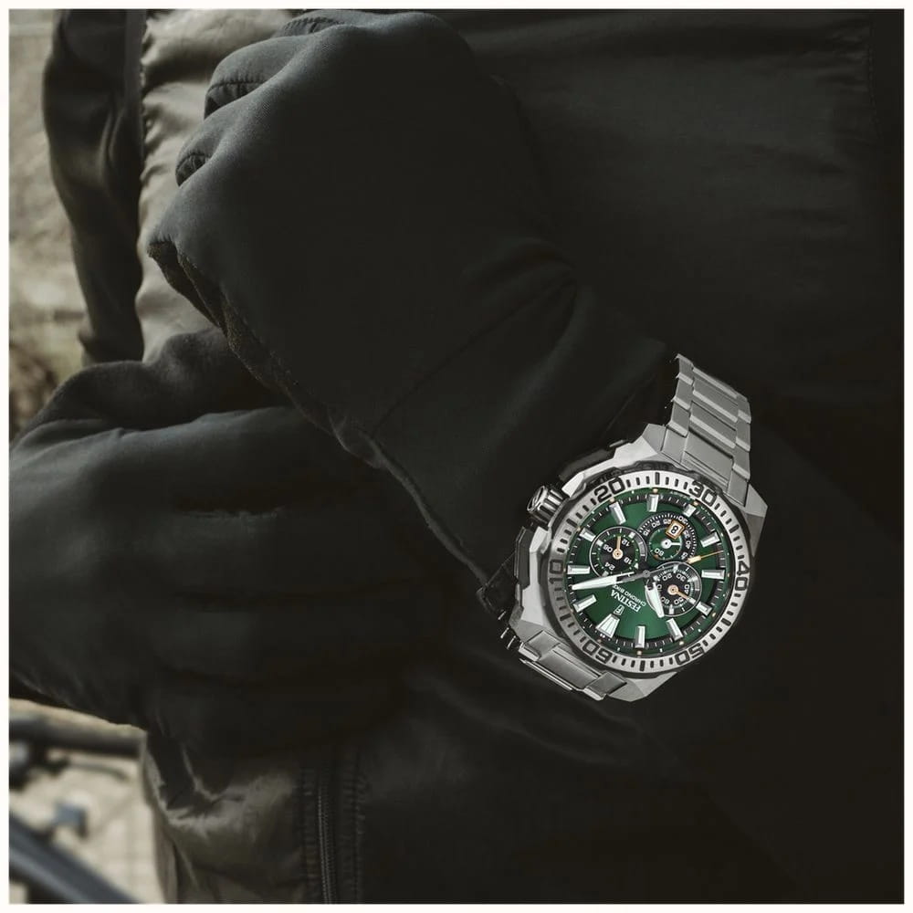 Мужские кварцевые часы Festina из коллекции Chrono-Bike — это выразительный спортивный аксессуар с функциональным дизайном. Корпус диаметром 45,5 мм и толщиной 14,4 мм выполнен из нержавеющей стали. Циферблат зелёного цвета оформлен метками в виде палочек и дополнен функцией хронографаХронографФункция позволяет измерять отрезки времени с особой точностью: часы, минуты, секунды. Верным признаком хронографа является наличие на циферблате 3 дополнительных окошек-счётчиков. и окошком даты. Стрелки и метки с люминесцентным покрытиемЛюминесцентное покрытиеПозволяет считывать показания времени в темноте. Производители наносят на стрелки, часовые индексы, безель или поверхность циферблата светонакопительный состав, дающий холодное свечение., обеспечивающим хорошую читаемость в темноте. Циферблат защищён минеральным стекломМинеральное стеклоМинеральное стекло представляет собой искусственно выращенный минерал кварца. Такое стекло отличается особой устойчивостью к повреждениям и царапинам. Уступает по некоторым качествам сапфировому стеклу.. Безель — стальной, неподвижный. Завинчивающаяся коронка и задняя крышка повышают надёжность конструкции. Часы оснащены стальным браслетом на раскладной застёжкеРаскладная застёжкаТакой тип застёжки используется только на браслетах из металла. Она никогда не раскрывается полностью, происходит разделение на 2 и более частей. Раскладывающая застёжка снизит вероятность потери часов к минимуму. с кнопками. Механизм — японский кварцевый калибр Miyota 0S20 с 60-месячным сроком службы батареи. Водонепроницаемость 200 м позволяет использовать часы для плавания и дайвинга. Вес — 206 г. Универсальный выбор для тех, кто ценит надёжность, функциональность и современный стиль.