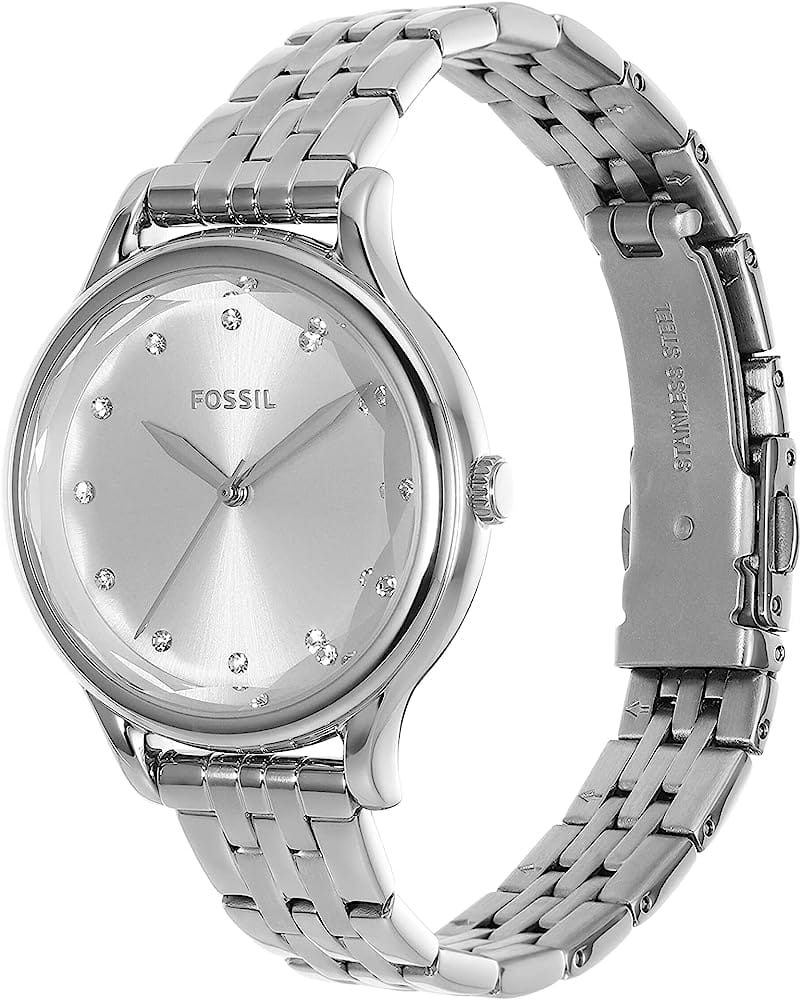 Женские наручные часы с минеральным стекломМинеральное стеклоМинеральное стекло представляет собой искусственно выращенный минерал кварца. Такое стекло отличается особой устойчивостью к повреждениям и царапинам. Уступает по некоторым качествам сапфировому стеклу. Fossil Laney BQ3861, кварцевый механизм с высокой точностью. Класс водозащиты: 50 метров, позволит защитить корпус от случайных брызг или капель дождя. Метки в виде кристаллов. Рифленая заводная головка. Браслет с раскладной застёжкойРаскладная застёжкаТакой тип застёжки используется только на браслетах из металла. Она никогда не раскрывается полностью, происходит разделение на 2 и более частей. Раскладывающая застёжка снизит вероятность потери часов к минимуму..