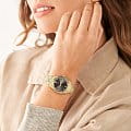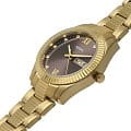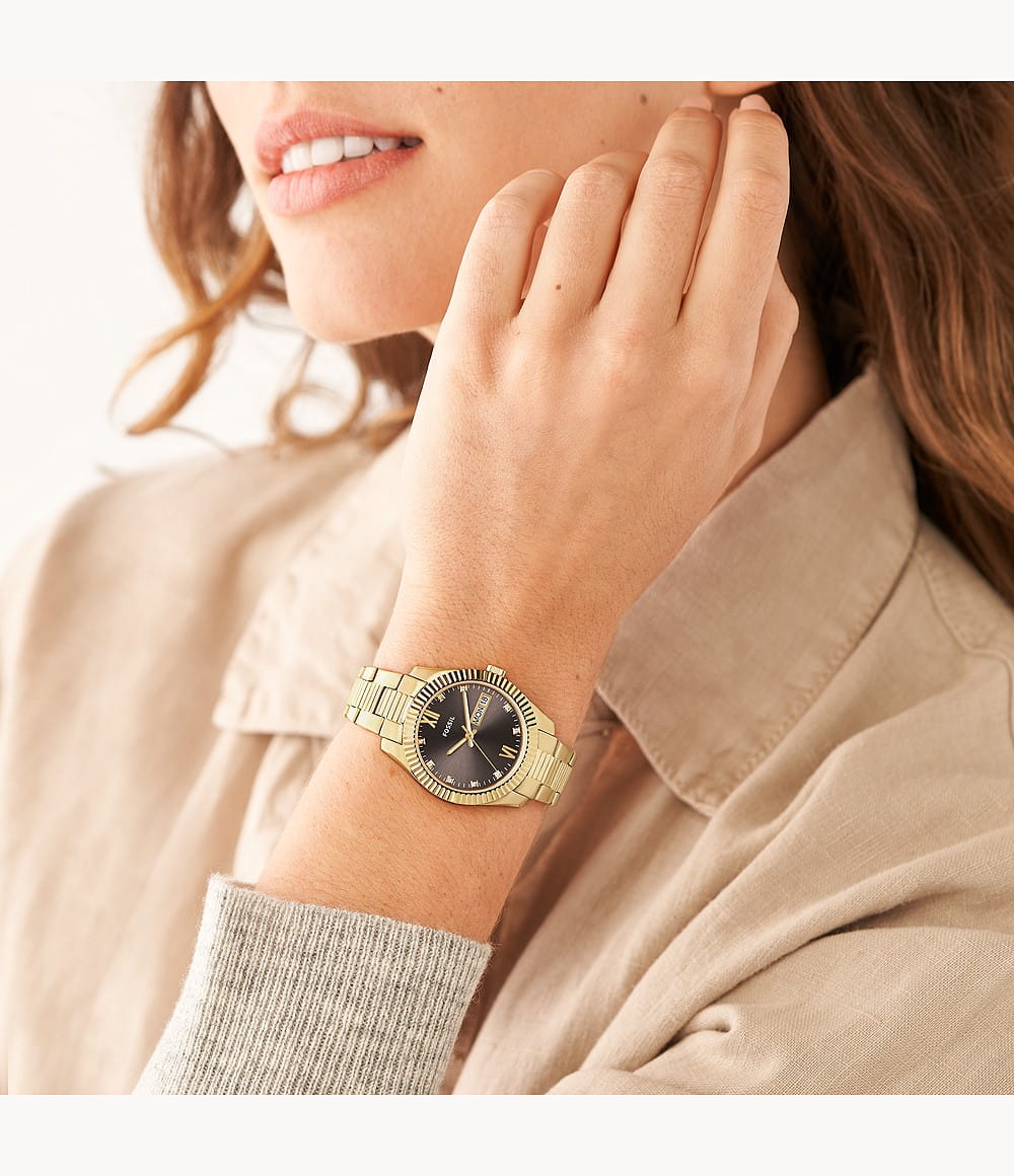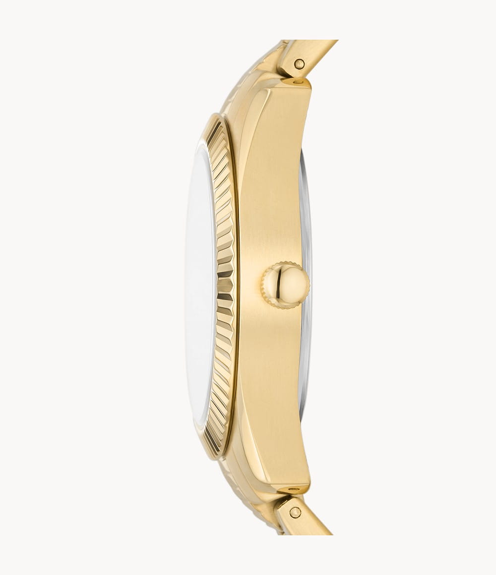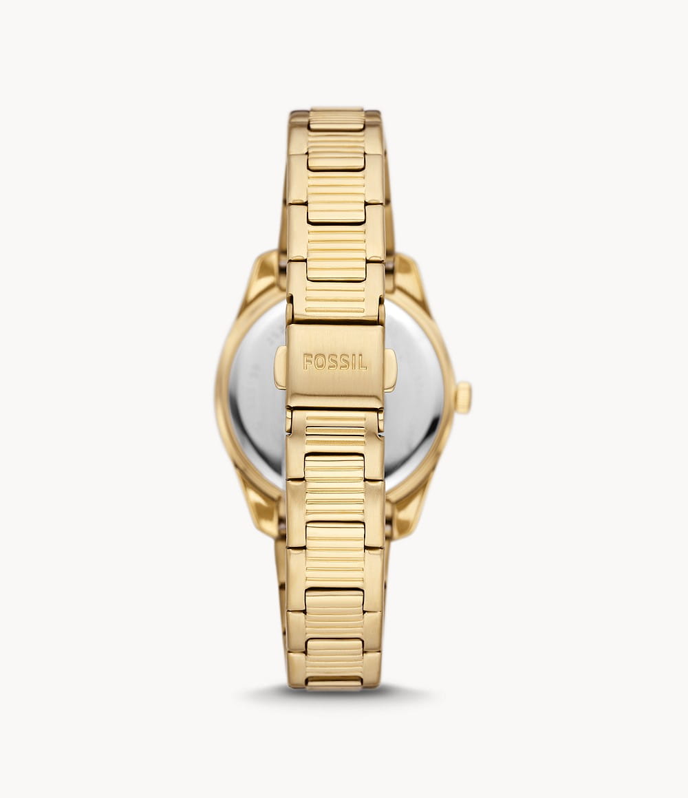 Женские американские часы с вечным календарем Fossil Scarlette ES5206, кварцевый механизм с высокой точностью. Класс водозащиты: 50 метров, позволит защитить корпус от случайных брызг или капель дождя. Корпус часов изготовлен из стали с IP покрытием, цвета желтое золото. Его диаметр составляет 32 мм. Модель имеет коричневый циферблат с апертурой даты и дня недели в положении 3 часов. Циферблат оснащен кристаллическими индексами с золотыми часовой, минутной и секундной стрелками. Часы крепятся на запястье с помощью золотого браслета из нержавеющей стали.