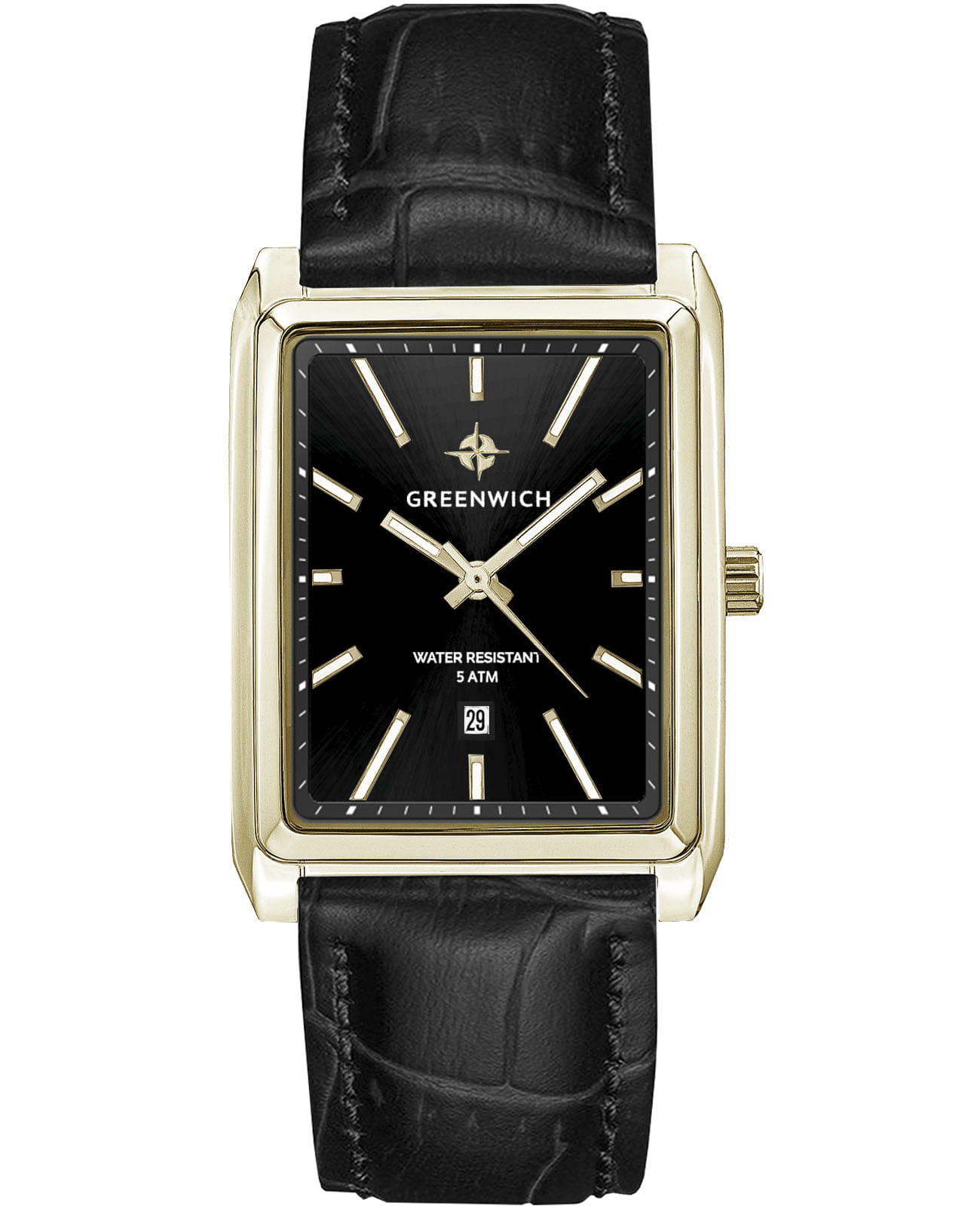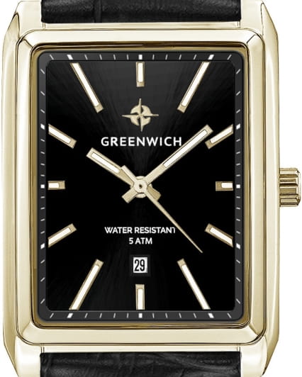 Мужские часы с минеральным стекломМинеральное стеклоМинеральное стекло представляет собой искусственно выращенный минерал кварца. Такое стекло отличается особой устойчивостью к повреждениям и царапинам. Уступает по некоторым качествам сапфировому стеклу. Greenwich Galeon GW 571.21.11, представляют собой классический вариант для повседневной носки.  Корпус часов выполнен из нержавеющей стали с PVD-покрытиемPVDУльтратонкое покрытие наносится в технике вакуумного напыления, сочетает в себе нитрид титана особой прочности со слоем золота или оксида хрома. Несёт в себе декоративную или защитную функцию.. Окошко даты находится в положении 6 часов. Стрелки с люминесцентным покрытиемЛюминесцентное покрытиеПозволяет считывать показания времени в темноте. Производители наносят на стрелки, часовые индексы, безель или поверхность циферблата светонакопительный состав, дающий холодное свечение.. Кожаный ремешок на стандартной застежке.