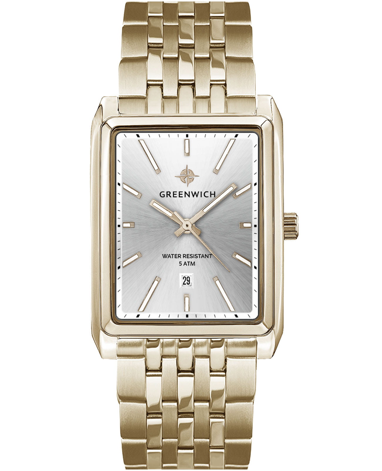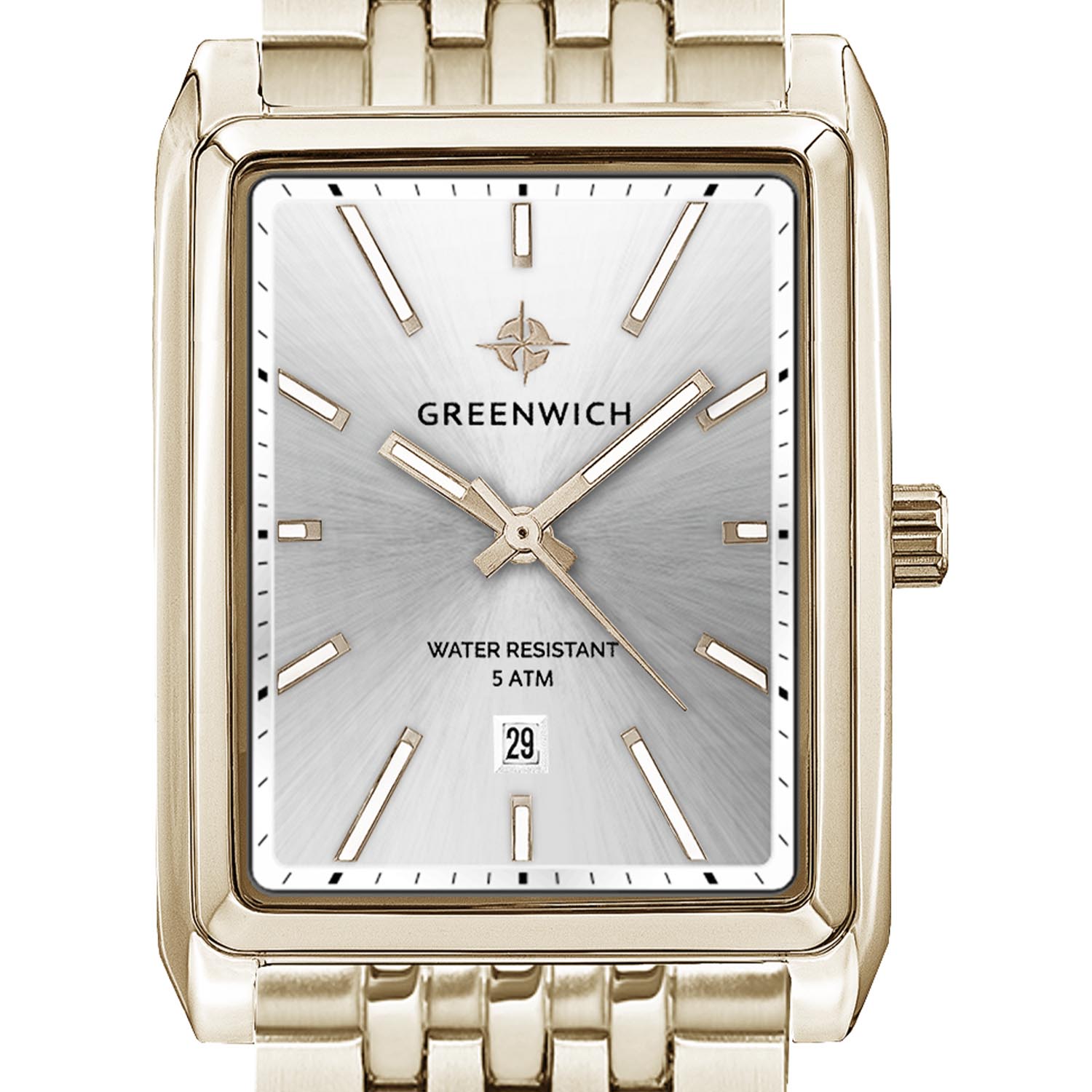 Мужские часы с минеральным стекломМинеральное стеклоМинеральное стекло представляет собой искусственно выращенный минерал кварца. Такое стекло отличается особой устойчивостью к повреждениям и царапинам. Уступает по некоторым качествам сапфировому стеклу. Greenwich Galeon GW 571.40.13 представляют собой классический вариант для повседневной носки. Корпус часов выполнен из нержавеющей стали с PVD-покрытиемPVDУльтратонкое покрытие наносится в технике вакуумного напыления, сочетает в себе нитрид титана особой прочности со слоем золота или оксида хрома. Несёт в себе декоративную или защитную функцию.. Окошко даты находится в положении 6 часов. Стрелки с люминесцентным покрытиемЛюминесцентное покрытиеПозволяет считывать показания времени в темноте. Производители наносят на стрелки, часовые индексы, безель или поверхность циферблата светонакопительный состав, дающий холодное свечение.. Стальной браслет с PVD-покрытиемPVDУльтратонкое покрытие наносится в технике вакуумного напыления, сочетает в себе нитрид титана особой прочности со слоем золота или оксида хрома. Несёт в себе декоративную или защитную функцию. на раскладной застёжкеРаскладная застёжкаТакой тип застёжки используется только на браслетах из металла. Она никогда не раскрывается полностью, происходит разделение на 2 и более частей. Раскладывающая застёжка снизит вероятность потери часов к минимуму..