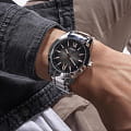 Мужские наручные часы Guess Crescent GW0574G1 с минеральным стекломМинеральное стеклоМинеральное стекло представляет собой искусственно выращенный минерал кварца. Такое стекло отличается особой устойчивостью к повреждениям и царапинам. Уступает по некоторым качествам сапфировому стеклу., кварцевый механизм с высокой точностью. Класс водозащиты: 50 метров, позволит защитить корпус от случайных брызг или капель дождя. Корпус часов и безельБезельВнешний ободок, закрепляющий стекло. В спортивных часах так называется поворотное кольцо с делениями на циферблате, выполняет роль таймера – замеряет отрезки времени на шкале. Неподвижный безель – элемент декора. Однонаправленно вращающийся безель на дайверских часах позволяет фиксировать моменты погружения и выныривания на поверхность. изготовлены из стали. Стальной браслет на раскладной застёжкеРаскладная застёжкаТакой тип застёжки используется только на браслетах из металла. Она никогда не раскрывается полностью, происходит разделение на 2 и более частей. Раскладывающая застёжка снизит вероятность потери часов к минимуму.. Гильошированный циферблат. Метки в виде штрихов и римских цифр. Рифленая заводная головка. Стрелки с люминесцентным покрытиемЛюминесцентное покрытиеПозволяет считывать показания времени в темноте. Производители наносят на стрелки, часовые индексы, безель или поверхность циферблата светонакопительный состав, дающий холодное свечение..