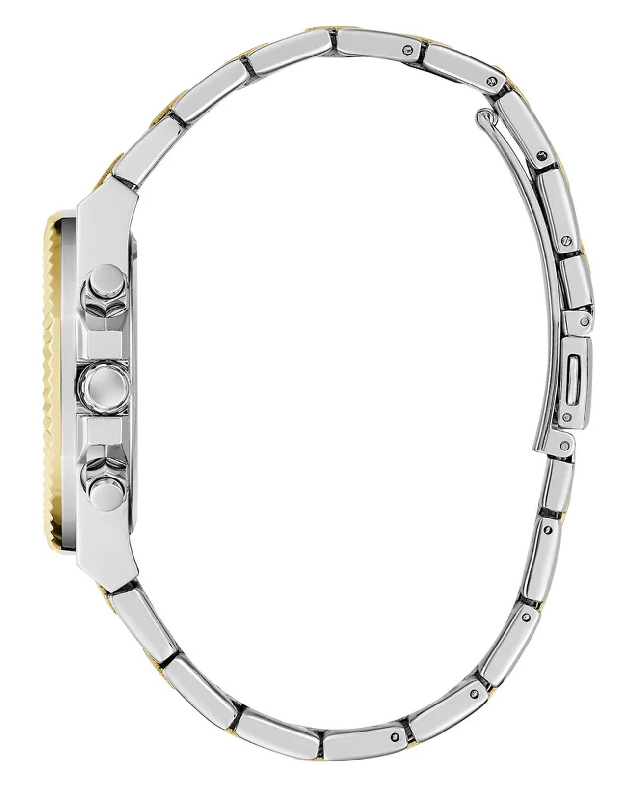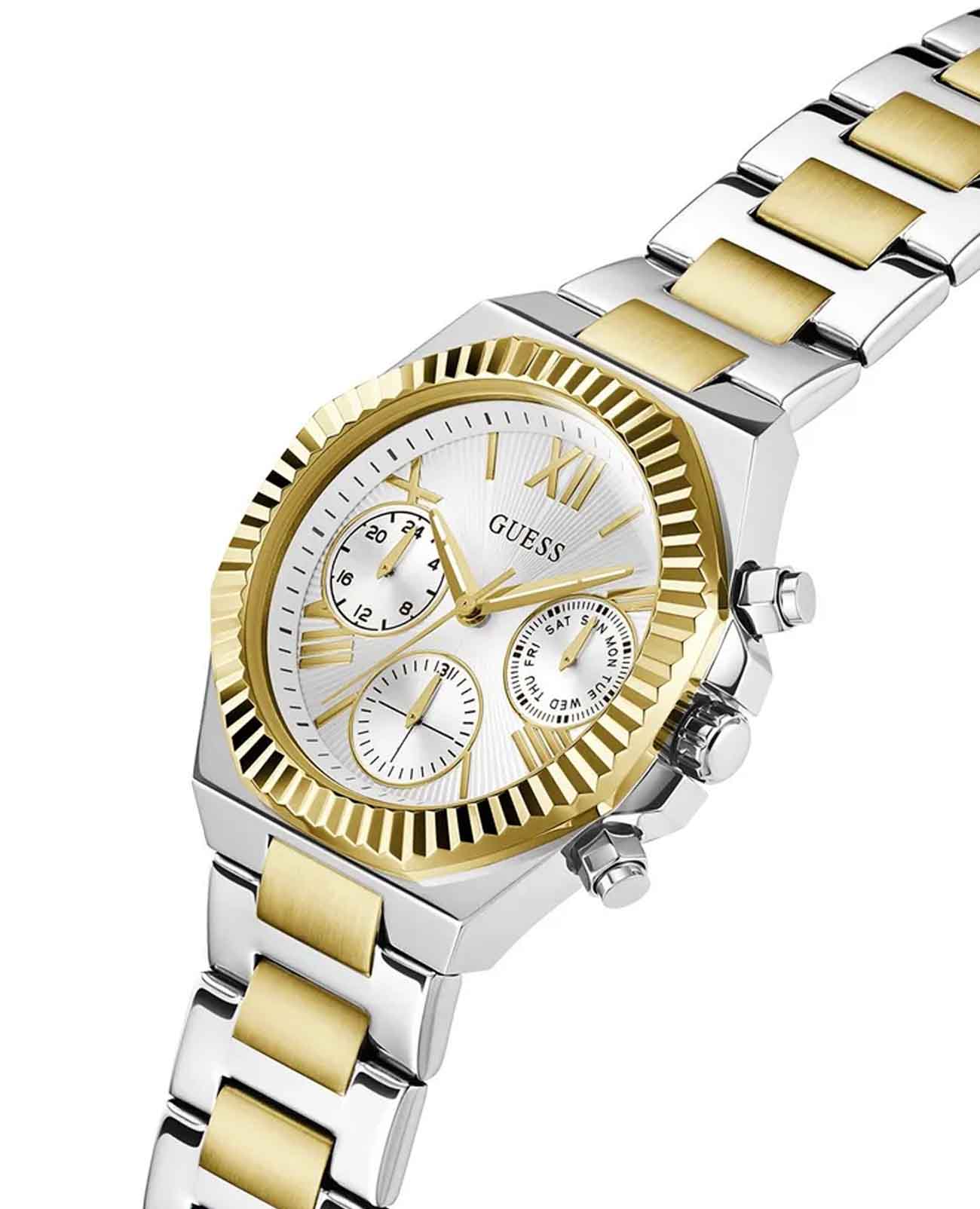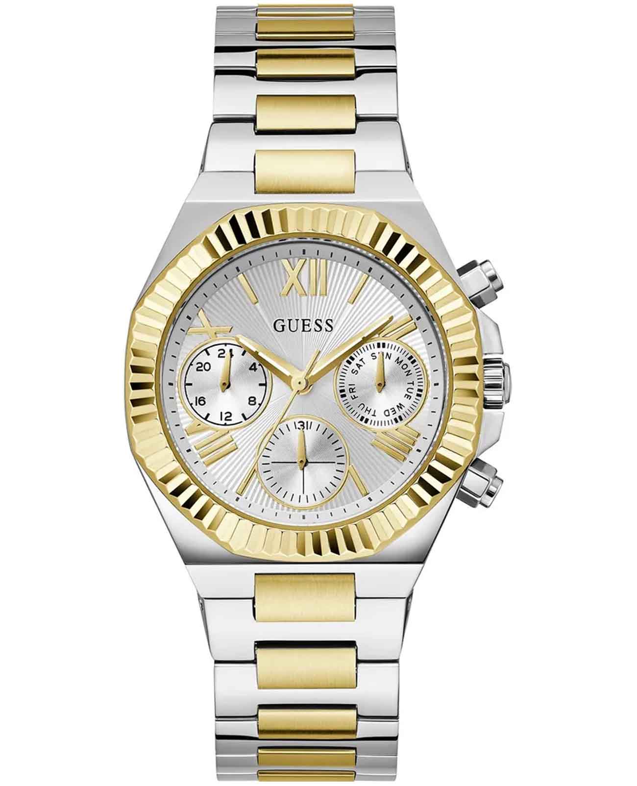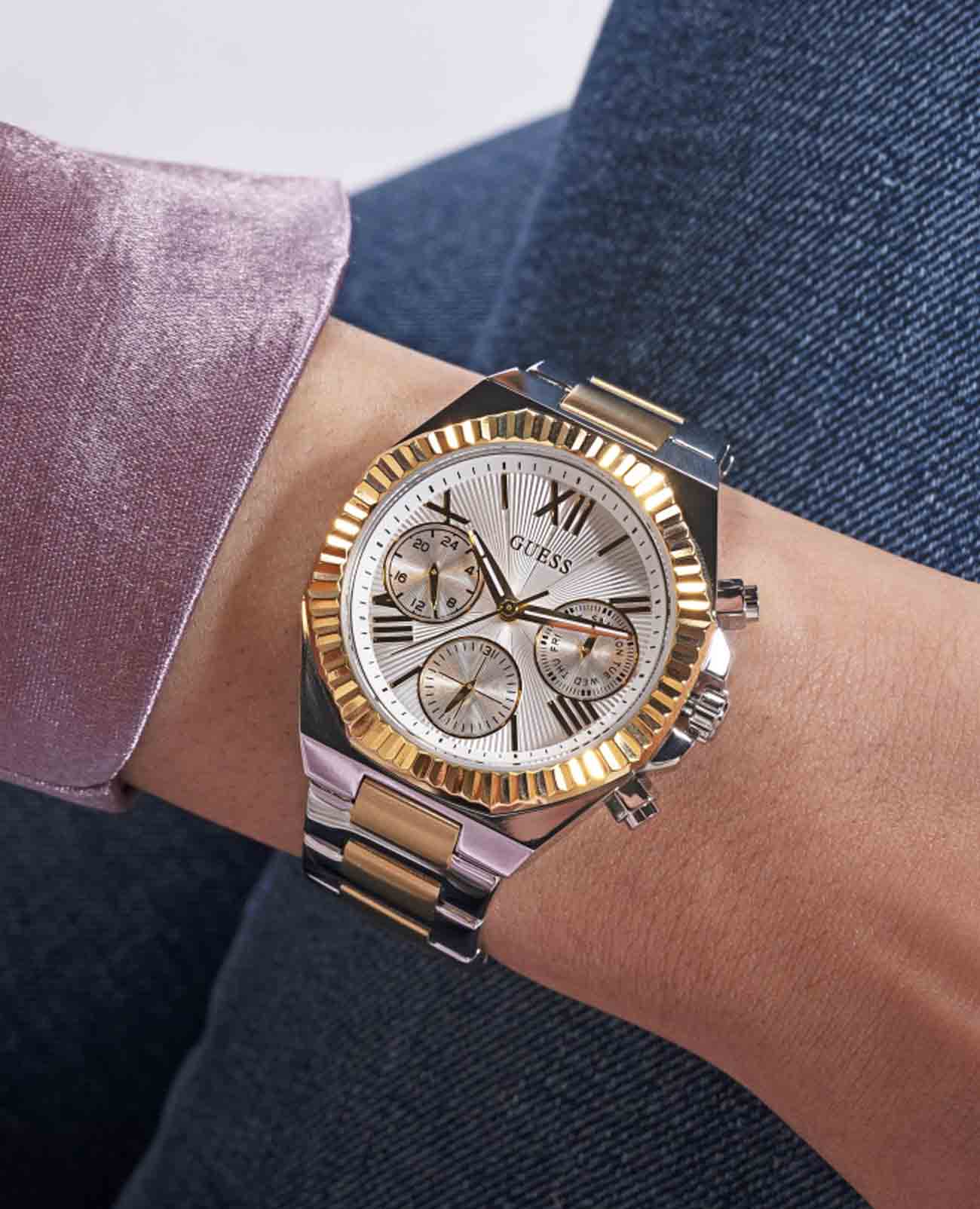 Женские наручные часы Guess Dress GW0769L3 с минеральным стекломМинеральное стеклоМинеральное стекло представляет собой искусственно выращенный минерал кварца. Такое стекло отличается особой устойчивостью к повреждениям и царапинам. Уступает по некоторым качествам сапфировому стеклу., кварцевый механизм с высокой точностью. Корпус часов изготовлен из стали. БезельБезельВнешний ободок, закрепляющий стекло. В спортивных часах так называется поворотное кольцо с делениями на циферблате, выполняет роль таймера – замеряет отрезки времени на шкале. Неподвижный безель – элемент декора. Однонаправленно вращающийся безель на дайверских часах позволяет фиксировать моменты погружения и выныривания на поверхность. с IP-покрытиемIP-покрытиеМетод ионного напыления. Демонстрирует повышенную устойчивость к истиранию, окислению и химическим веществам. Под воздействием высокого давления и температуры около 1500°C молекулы металла надёжно соединяются с частицами корпуса часов.. Стрелки с люминесцентным покрытиемЛюминесцентное покрытиеПозволяет считывать показания времени в темноте. Производители наносят на стрелки, часовые индексы, безель или поверхность циферблата светонакопительный состав, дающий холодное свечение.. Класс водозащиты: 50 метров, позволит защитить корпус от случайных брызг или капель дождя. Стальной браслет с частичным IP-покрытиемIP-покрытиеМетод ионного напыления. Демонстрирует повышенную устойчивость к истиранию, окислению и химическим веществам. Под воздействием высокого давления и температуры около 1500°C молекулы металла надёжно соединяются с частицами корпуса часов. на раскладной застёжкеРаскладная застёжкаТакой тип застёжки используется только на браслетах из металла. Она никогда не раскрывается полностью, происходит разделение на 2 и более частей. Раскладывающая застёжка снизит вероятность потери часов к минимуму..