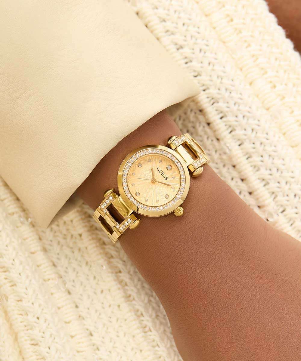 Часы Guess GW0869L4 — это обворожительный аксессуар, который станет настоящей изюминкой в образе стильной леди. Эти женские наручные часы оснащены надежным кварцевым механизмом. Круглый корпус из стали с золотистым IP-покрытиемIP-покрытиеМетод ионного напыления. Демонстрирует повышенную устойчивость к истиранию, окислению и химическим веществам. Под воздействием высокого давления и температуры около 1500°C молекулы металла надёжно соединяются с частицами корпуса часов., а безельБезельВнешний ободок, закрепляющий стекло. В спортивных часах так называется поворотное кольцо с делениями на циферблате, выполняет роль таймера – замеряет отрезки времени на шкале. Неподвижный безель – элемент декора. Однонаправленно вращающийся безель на дайверских часах позволяет фиксировать моменты погружения и выныривания на поверхность. часов инкрустирован кристаллами, придавая часам роскошный и изысканный вид. Золотистый гильошированный циферблат украшен метками в виде точек, дополненными кристаллами, что создает эффект мерцания и утонченности. Рифленая заводная головка обеспечивает удобство в настройке времени. Стальной браслет с золотистым IP-покрытиемIP-покрытиеМетод ионного напыления. Демонстрирует повышенную устойчивость к истиранию, окислению и химическим веществам. Под воздействием высокого давления и температуры около 1500°C молекулы металла надёжно соединяются с частицами корпуса часов. и ювелирной застежкой, также украшенный кристаллами, не только обеспечивает надежную фиксацию на запястье, но и добавляет элегантности и блеска. Часы имеют водозащиту 30WR, что позволяет не беспокоиться о случайном попадании воды. Минеральное стеклоМинеральное стеклоМинеральное стекло представляет собой искусственно выращенный минерал кварца. Такое стекло отличается особой устойчивостью к повреждениям и царапинам. Уступает по некоторым качествам сапфировому стеклу. защищает циферблат от царапин и повреждений. Диаметр корпуса составляет 30 мм, что делает эти часы идеальным выбором для тех, кто ценит изысканный стиль и внимание к деталям.