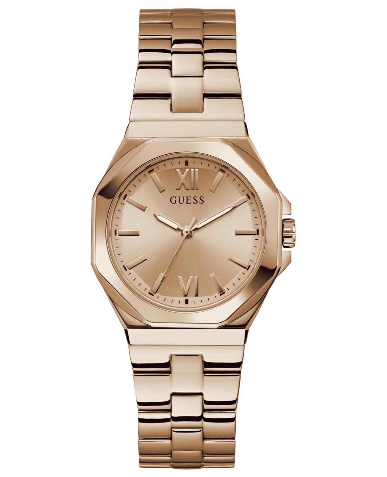 Часы Guess GW0873L3 — это изысканный аксессуар, который станет отличным дополнением к образу современной женщины. Эти наручные оснащены надежным кварцевым механизмом. Стальной корпус с золотистым IP-покрытиемIP-покрытиеМетод ионного напыления. Демонстрирует повышенную устойчивость к истиранию, окислению и химическим веществам. Под воздействием высокого давления и температуры около 1500°C молекулы металла надёжно соединяются с частицами корпуса часов. придаёт часам элегантный и стильный вид. Циферблат золотого цвета, выполненный по технологии Sunray, создает эффект солнечных лучей, добавляя глубину и выразительность дизайну. Метки в виде штрихов и римские цифры VI и XII обеспечивают удобное считывание времени и добавляют классический штрих. Люминесцентное покрытиеЛюминесцентное покрытиеПозволяет считывать показания времени в темноте. Производители наносят на стрелки, часовые индексы, безель или поверхность циферблата светонакопительный состав, дающий холодное свечение. на стрелках обеспечивает отличную видимость в темноте. Часы оснащены рифленой заводной головкой с защитой, что обеспечивает удобство и надежность в использовании. Стальной браслет с золотистым IP-покрытиемIP-покрытиеМетод ионного напыления. Демонстрирует повышенную устойчивость к истиранию, окислению и химическим веществам. Под воздействием высокого давления и температуры около 1500°C молекулы металла надёжно соединяются с частицами корпуса часов. и раскладной застежкойРаскладная застёжкаТакой тип застёжки используется только на браслетах из металла. Она никогда не раскрывается полностью, происходит разделение на 2 и более частей. Раскладывающая застёжка снизит вероятность потери часов к минимуму. гарантирует комфортное ношение и надежную фиксацию на запястье. Водозащита 50WR позволяет не беспокоиться о случайных брызгах и контакте с водой. Минеральное стеклоМинеральное стеклоМинеральное стекло представляет собой искусственно выращенный минерал кварца. Такое стекло отличается особой устойчивостью к повреждениям и царапинам. Уступает по некоторым качествам сапфировому стеклу. защищает циферблат от царапин и повреждений, обеспечивая долговечность и сохранность внешнего вида.